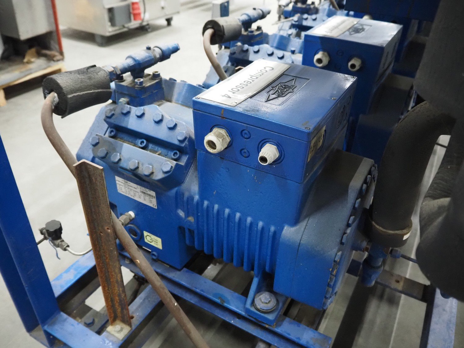 Bitzer Kühlmaschinenbau GmbH compressor rack with 4 Bitzer Kühlmaschinenbau GmbH cooling compressors, type: (3x) 4JTC-10KY-40P, 4JTC-10KY-40S, serial number: 1672506278, 1672504853, 1672504854, 1672504851, capacity: (4x) 9/10.9 m³ per hour, dimensions: 2200 mm x 1150 mm x 1950 mm. Kavel locatie: Schouwrooij 29, 5281 RE Boxtel, Nederland