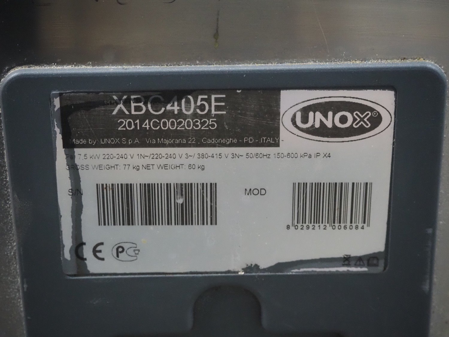 Unox combisteamer, type: XBC405E, serial number: 2014C0020325, 220-240/380-415 V, 1/3 Ph, 50/60 Hz, 7.5 kW, gross weight: 77 kg, net weight: 60 kg, 4 floors, dimensions each floor: 360 mm x 600 mm, total dimensions: 860 mm x 560 mm x 700 mm. Kavel locatie: Schouwrooij 29, 5281 RE Boxtel, Nederland