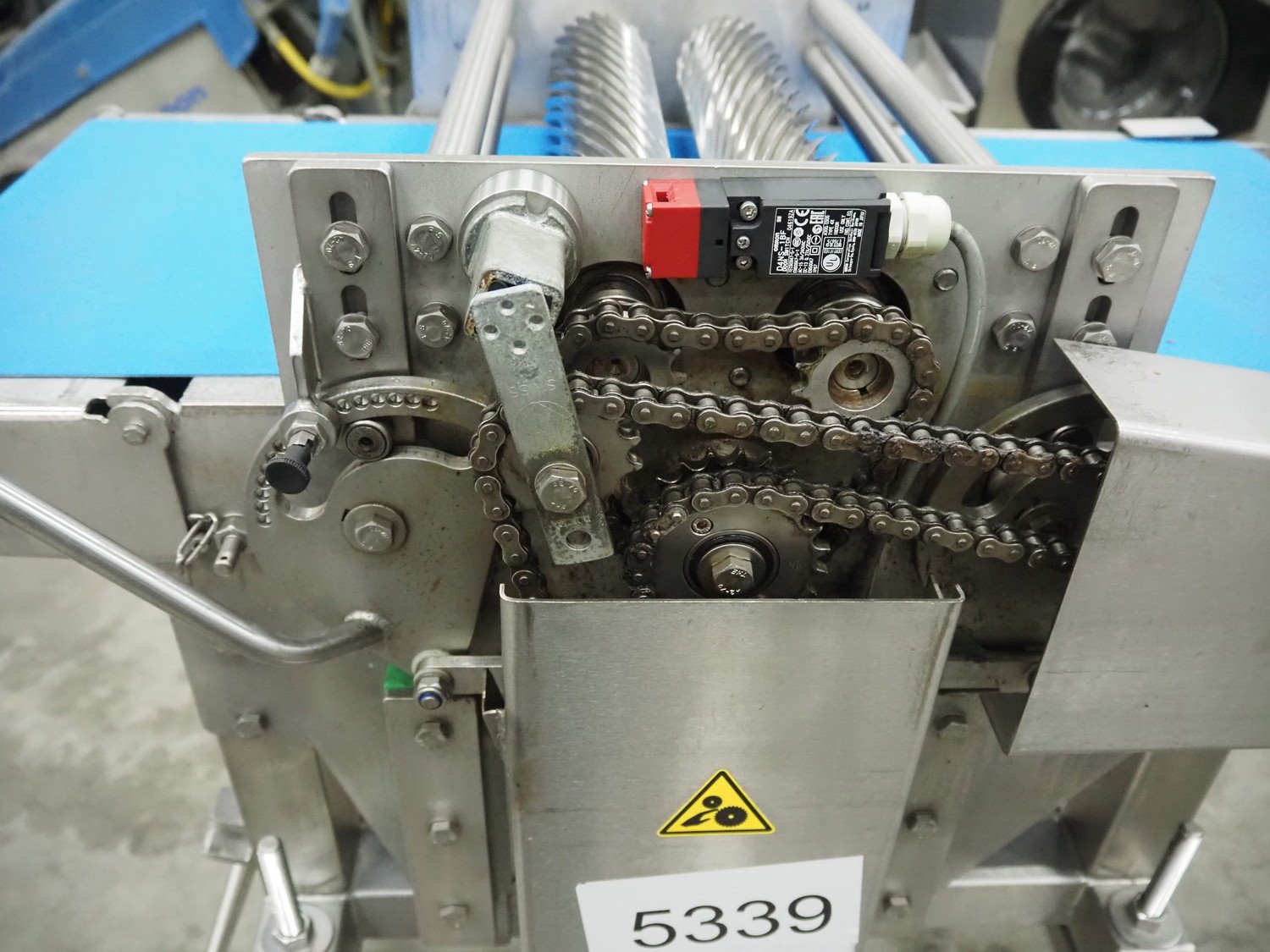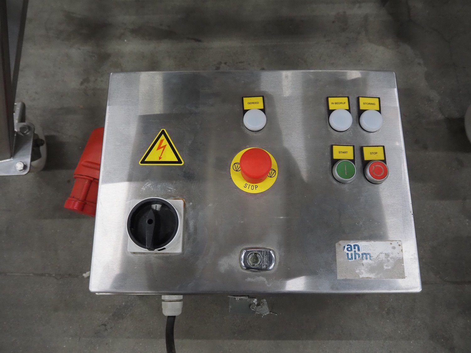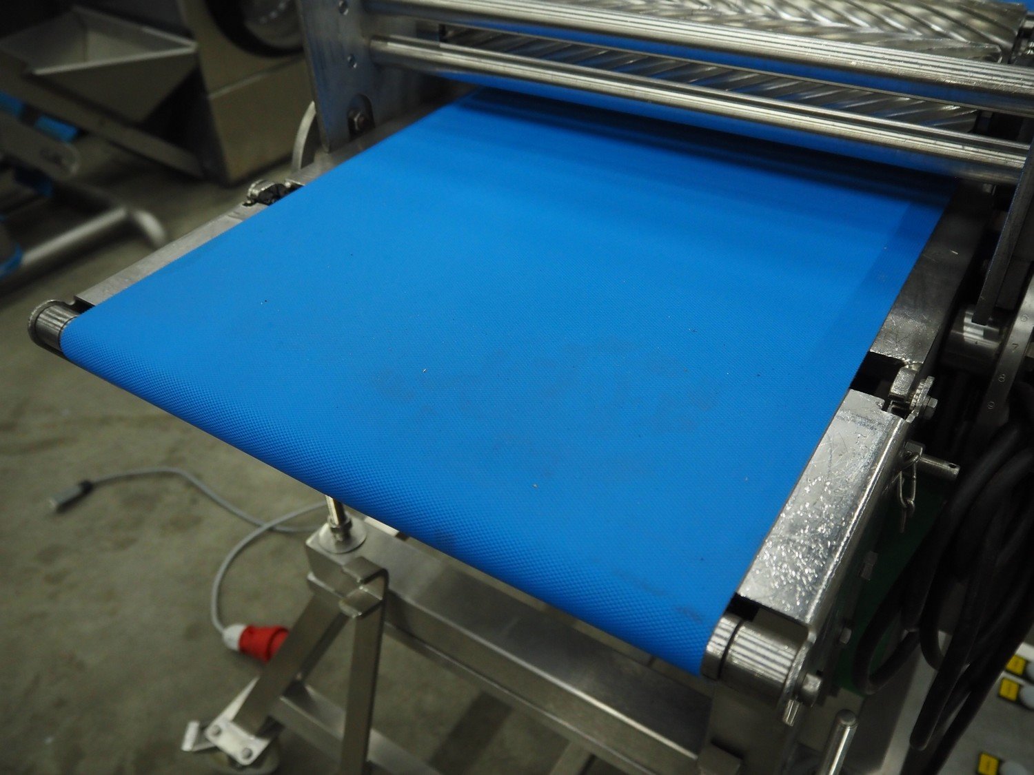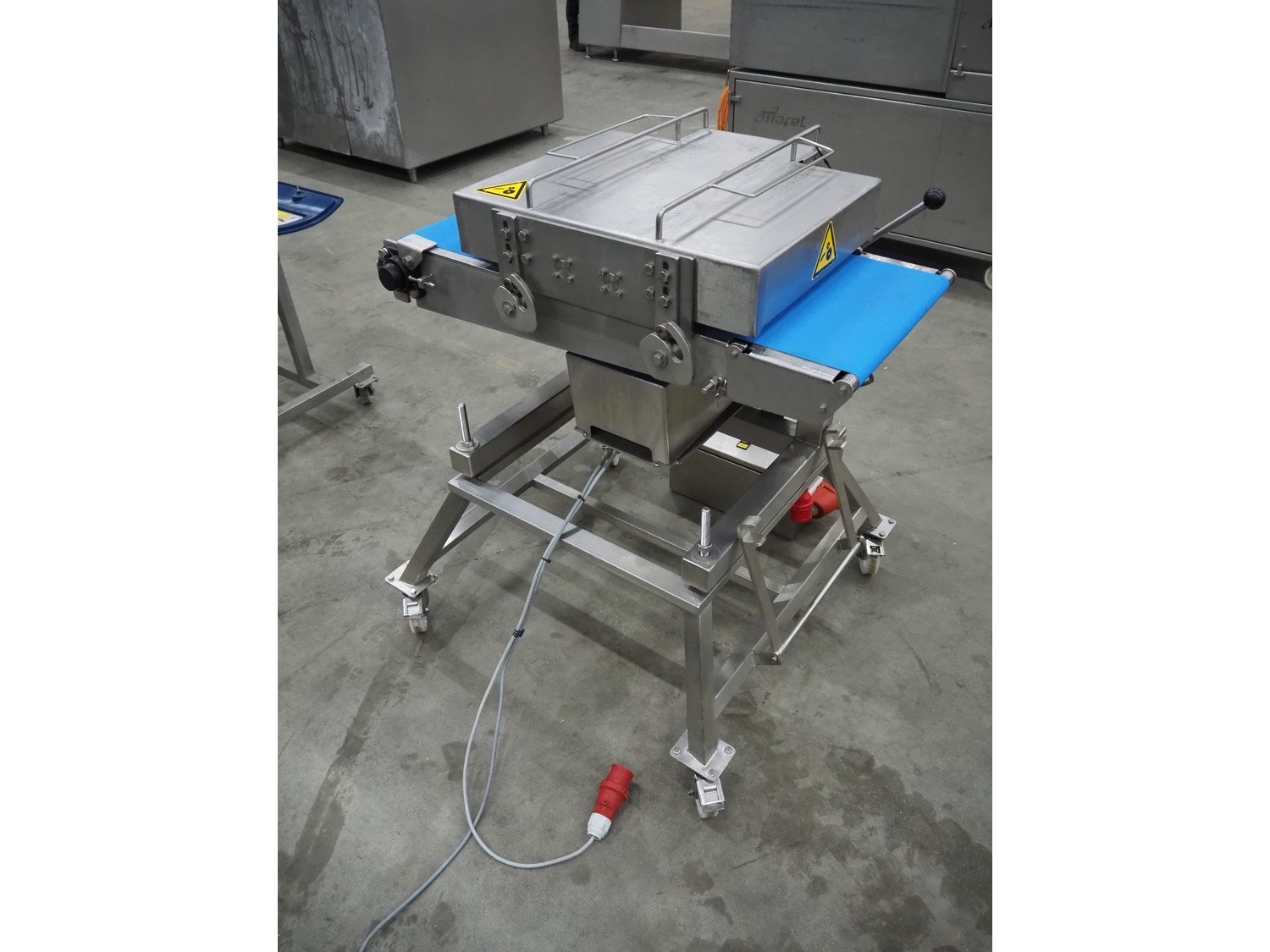 Selo mobile steak scorer, type: B.S.R. 240317, serial number: 201701, year of construction: 2017, 400 V, 3 Ph, 50 Hz, 0.3 kW, weight: 150 kg, plastic belt, belt width: 400 mm, working width: 380 mm, total dimensions: 1000 mm x 700 mm x 1050 mm. Kavel locatie: Schouwrooij 29, 5281 RE Boxtel, Nederland