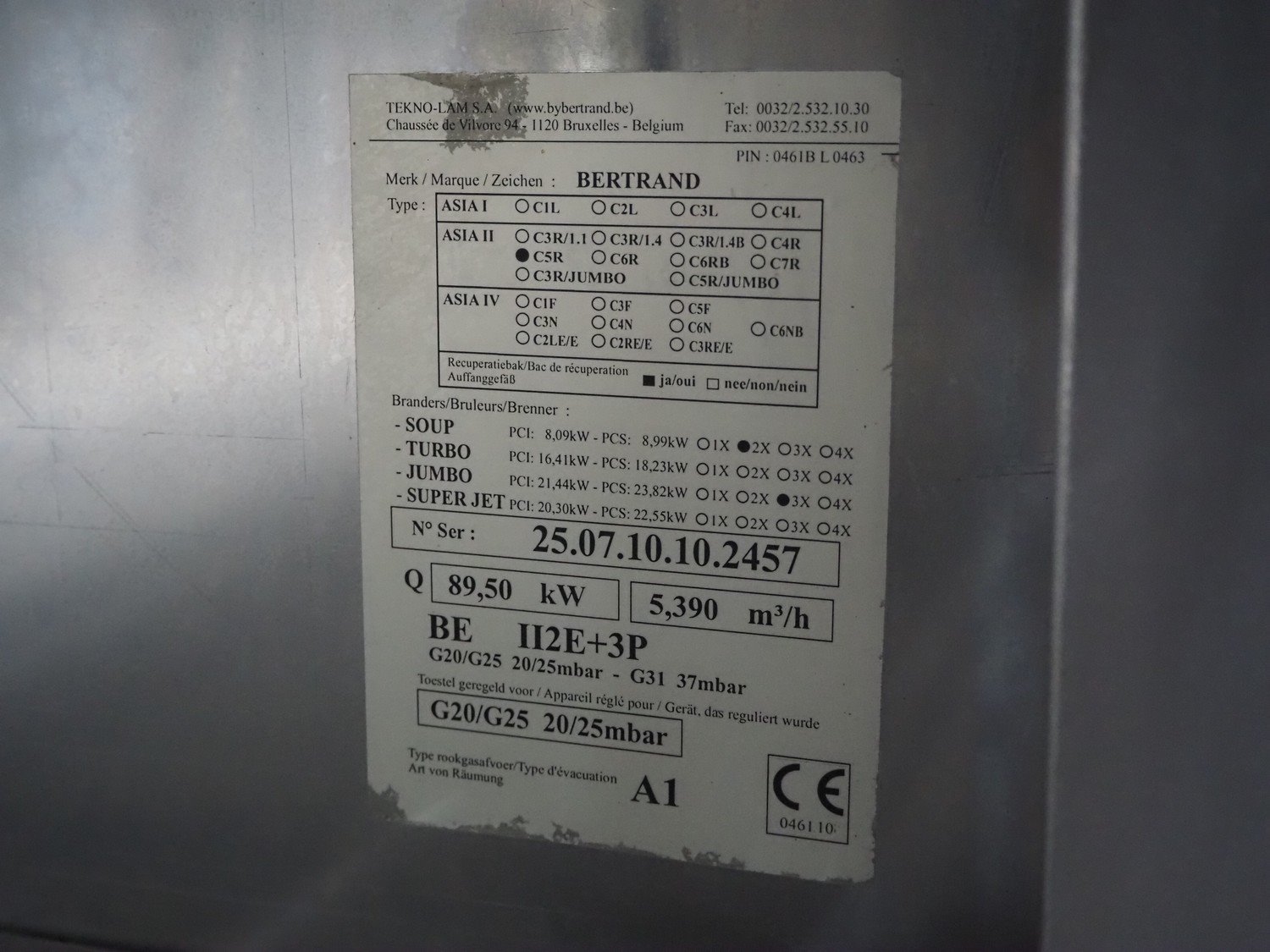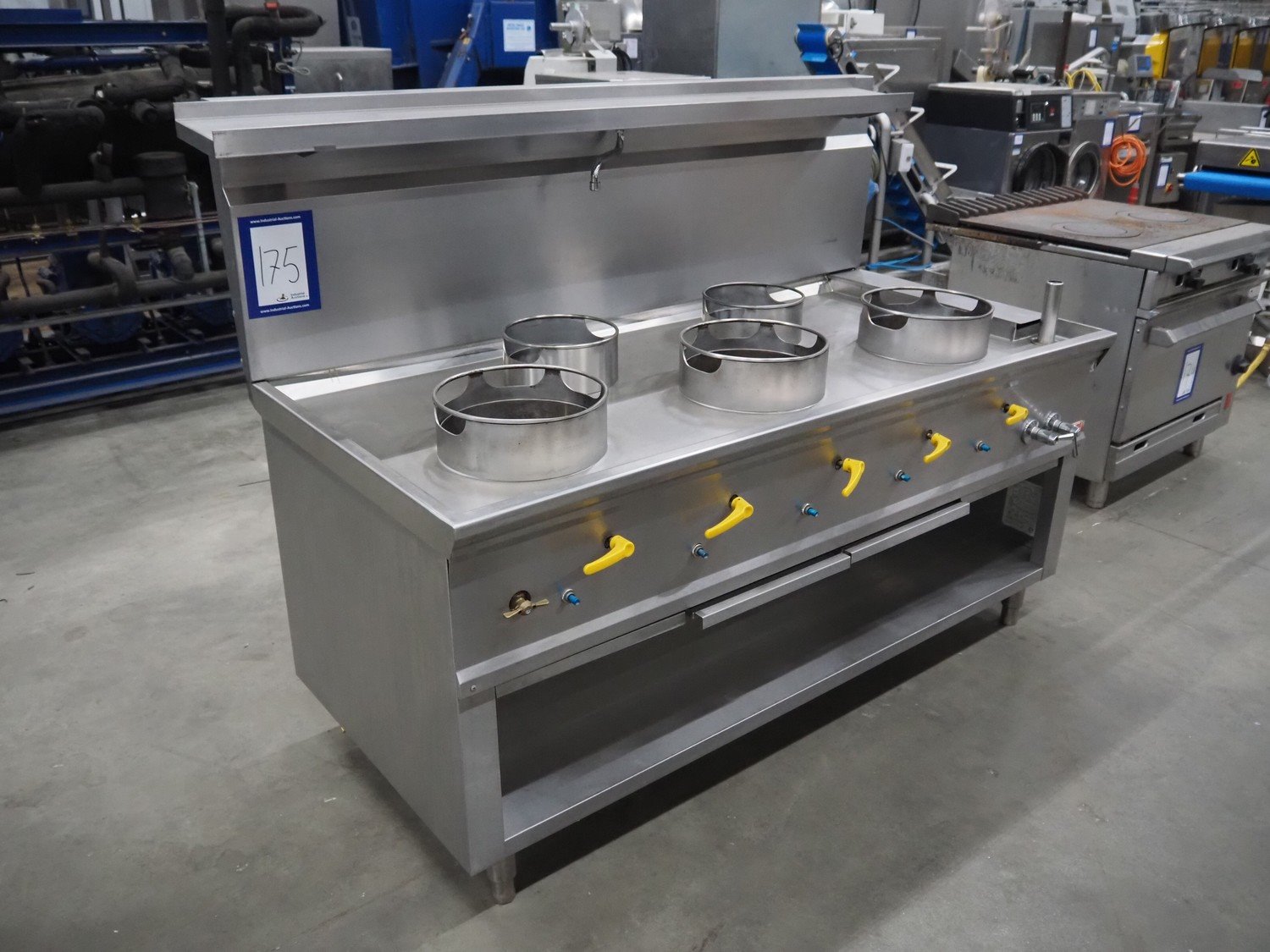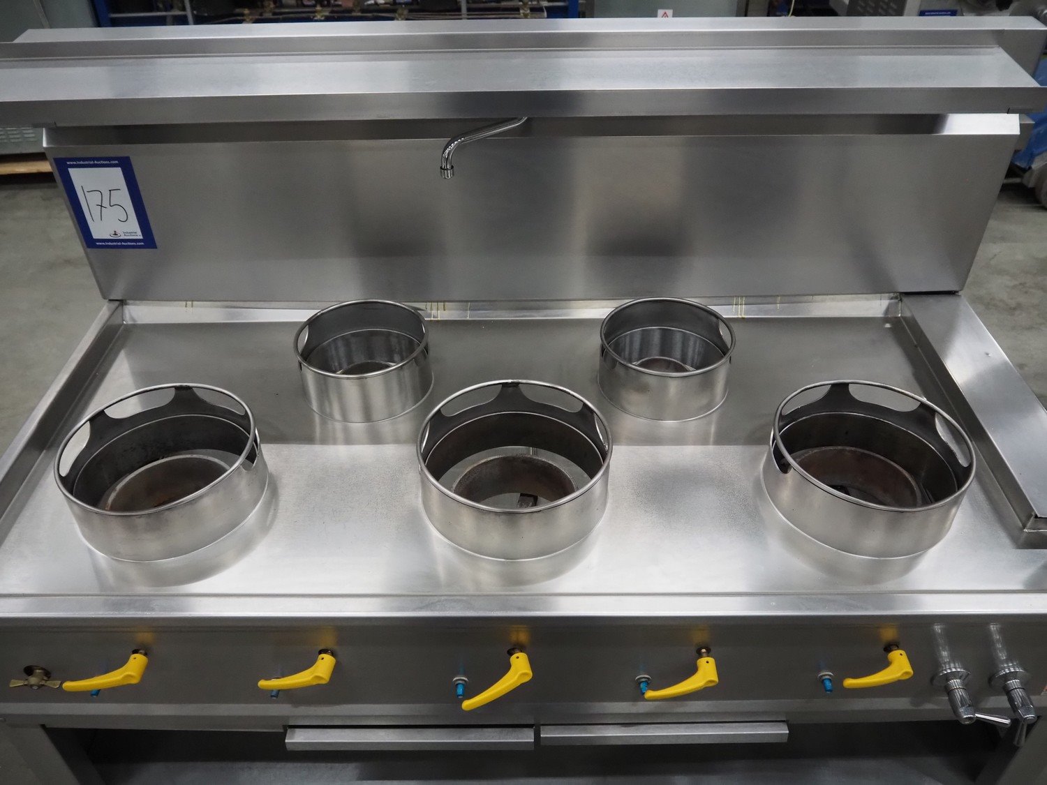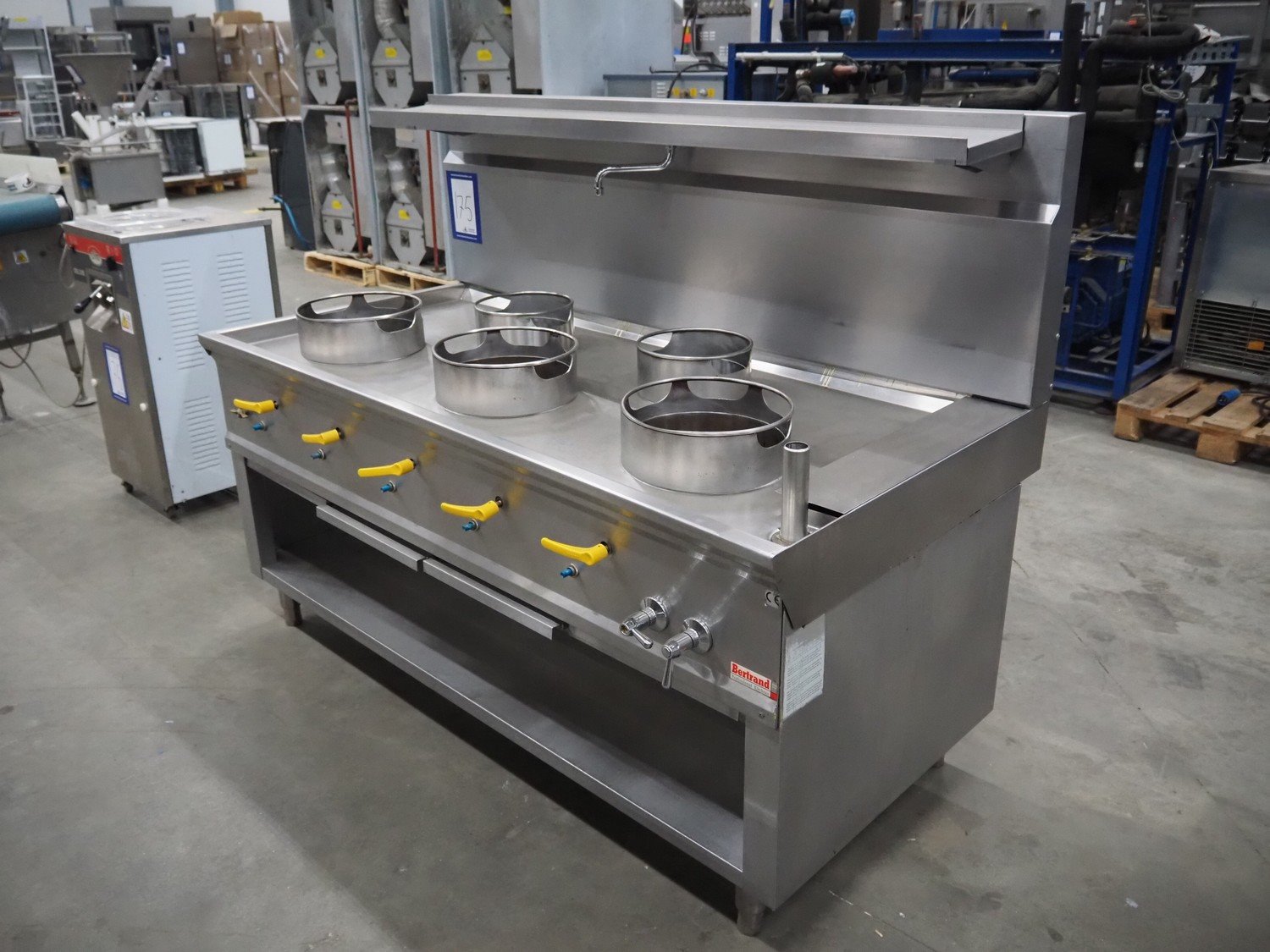 Bertrand 5-pits wok stove, type: ASIA II C5R, serial number: 25.07.10.10.2457, (2x) soup burner and (3x) jumbo burner, gas heated, 89.50 kW, 20/25 mbar, dimensions: 1800 mm x 900 mm x 1330 mm. Kavel locatie: Schouwrooij 29, 5281 RE Boxtel, Nederland