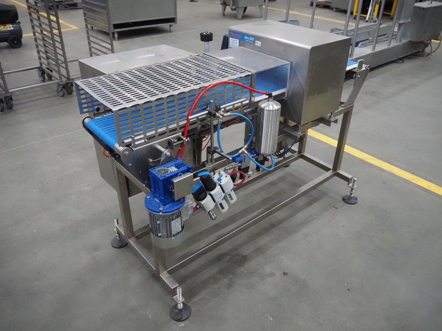 Thermo Fischer metal detector with rejecter, model: Apex500, 120/230 V, 50/60 Hz, 0.4 A, plastic belt, belt width: 250 mm, clearance: 350 mm x 150 mm, total dimensions: 1750 mm x 800 mm x 1360 mm. Kavel locatie: Schouwrooij 29, 5281 RE Boxtel, Nederland