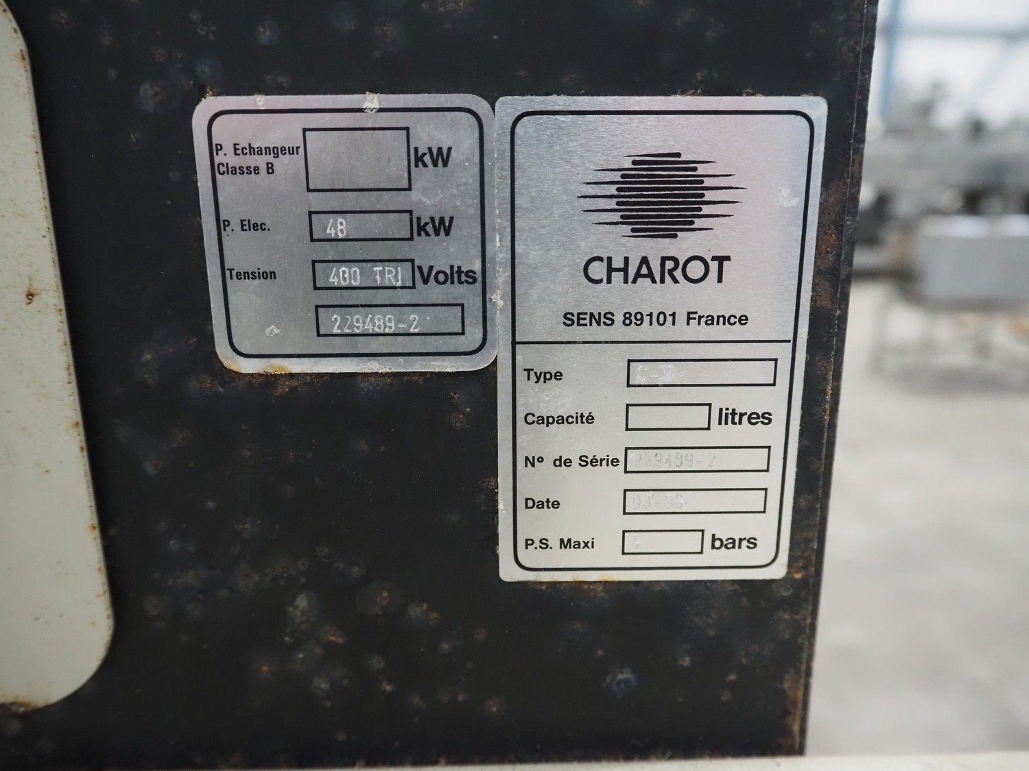 Charot boiler, serial number: 229-98-2, year of construction: 09-93, 400 V, 48 kW, dimensions: 780 mm x 600 mm x 1800 mm. Kavel locatie: Schouwrooij 29, 5281 RE Boxtel, Nederland