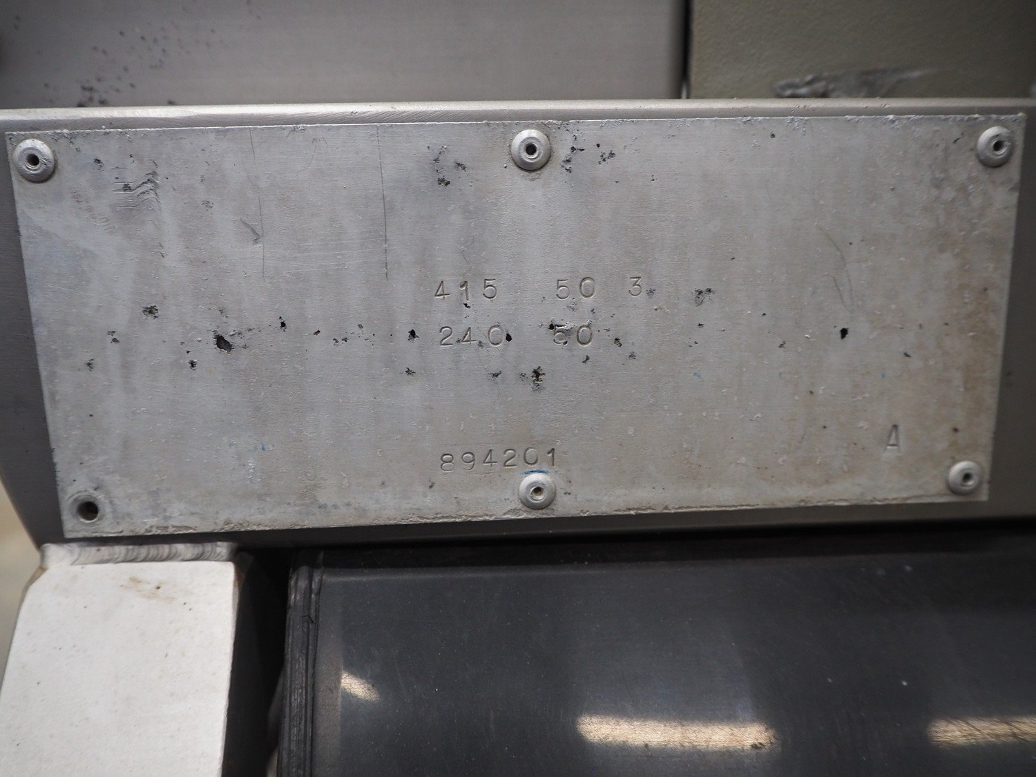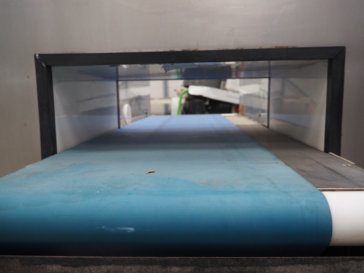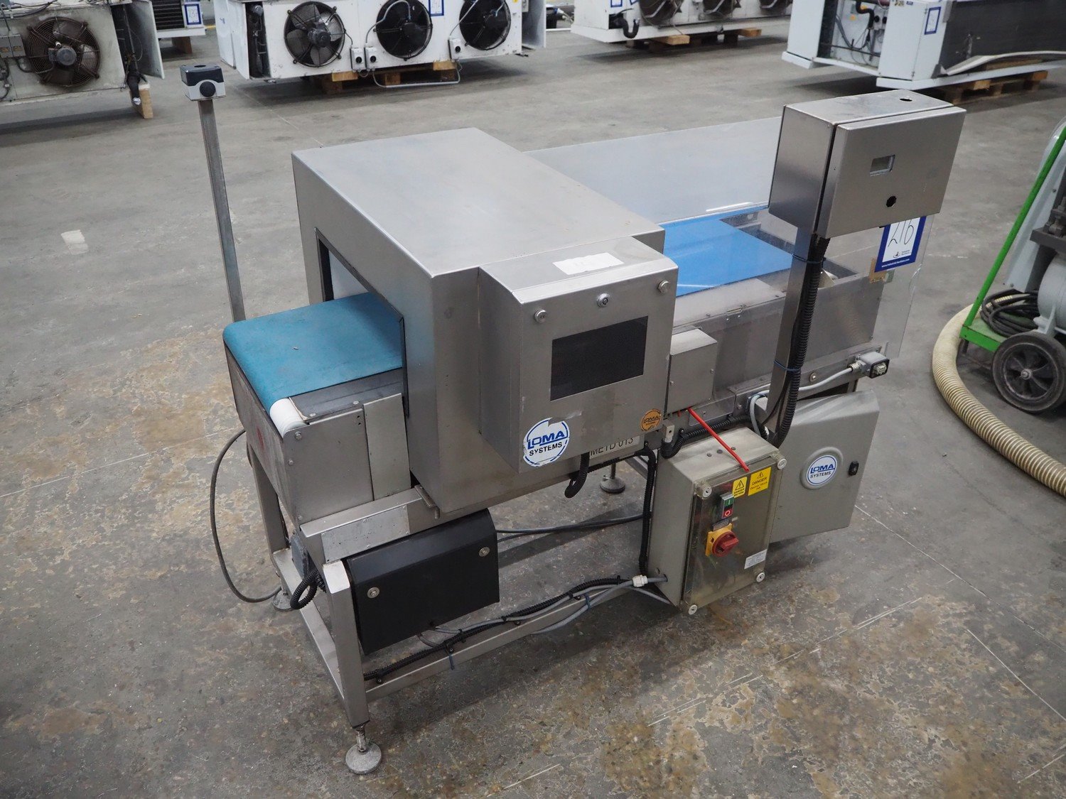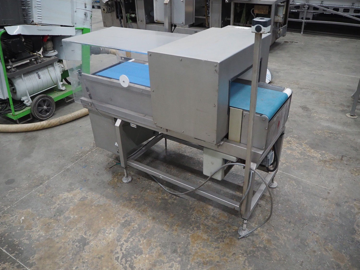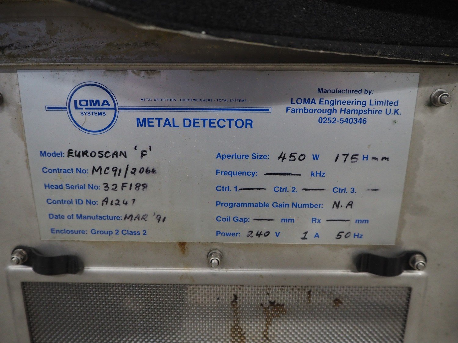 Loma Systems metal detector, model: Euroscan F, serial number: 32F188, year of construction: march 1991, 415/240 V, 3 Ph, 50 Hz, clearance: 450 mm x 140 mm, plastic belt, belt width: 350 mm, total dimensions: 1500 mm x 900 mm x 1370 mm. Kavel locatie: Schouwrooij 29, 5281 RE Boxtel, Nederland