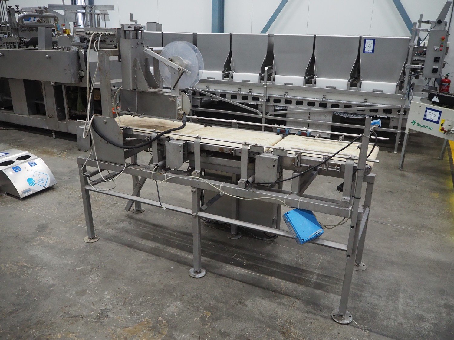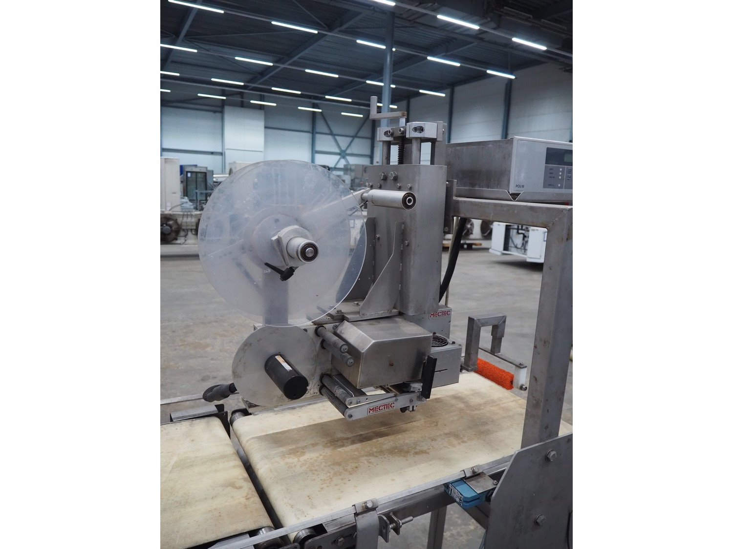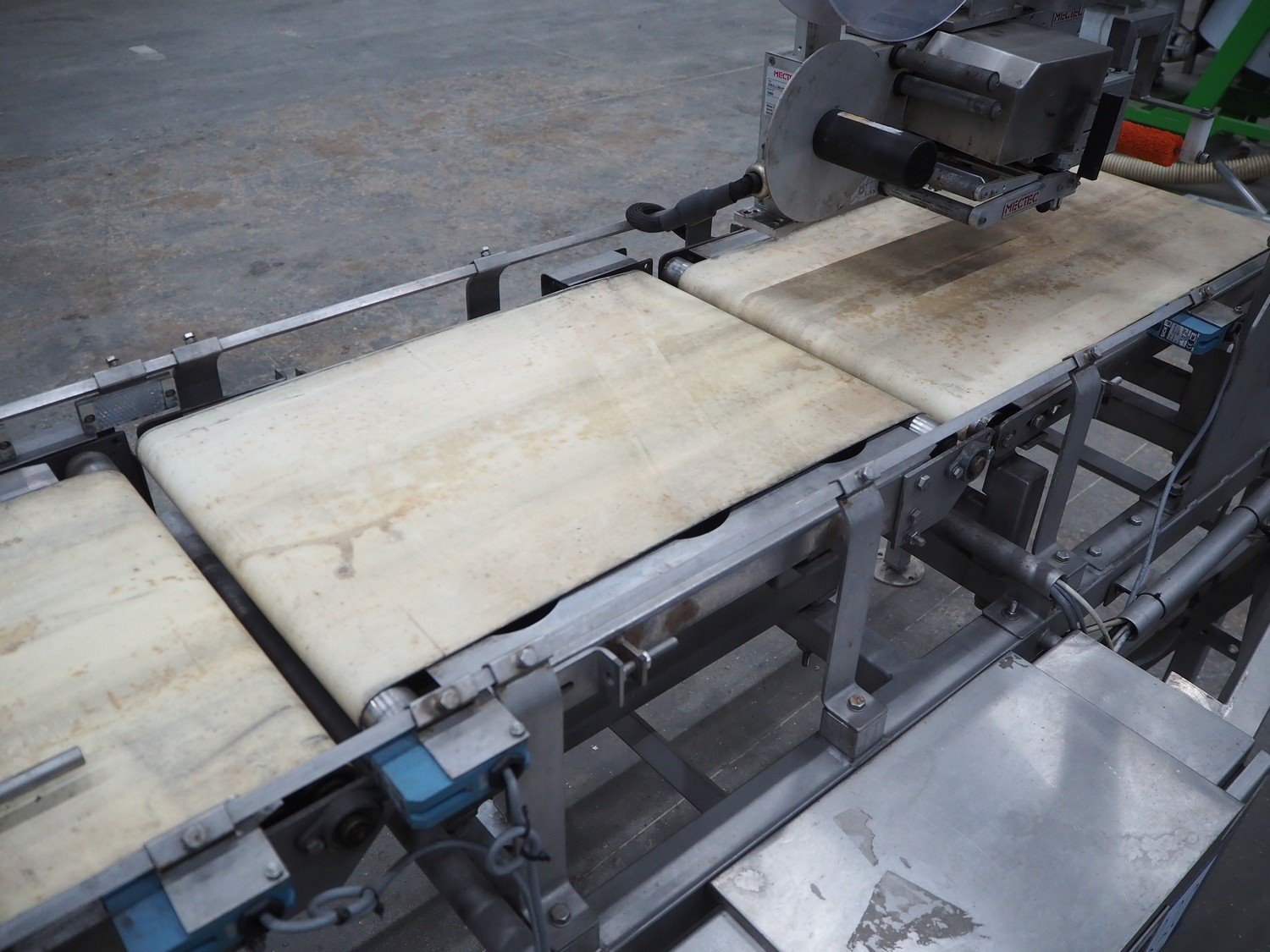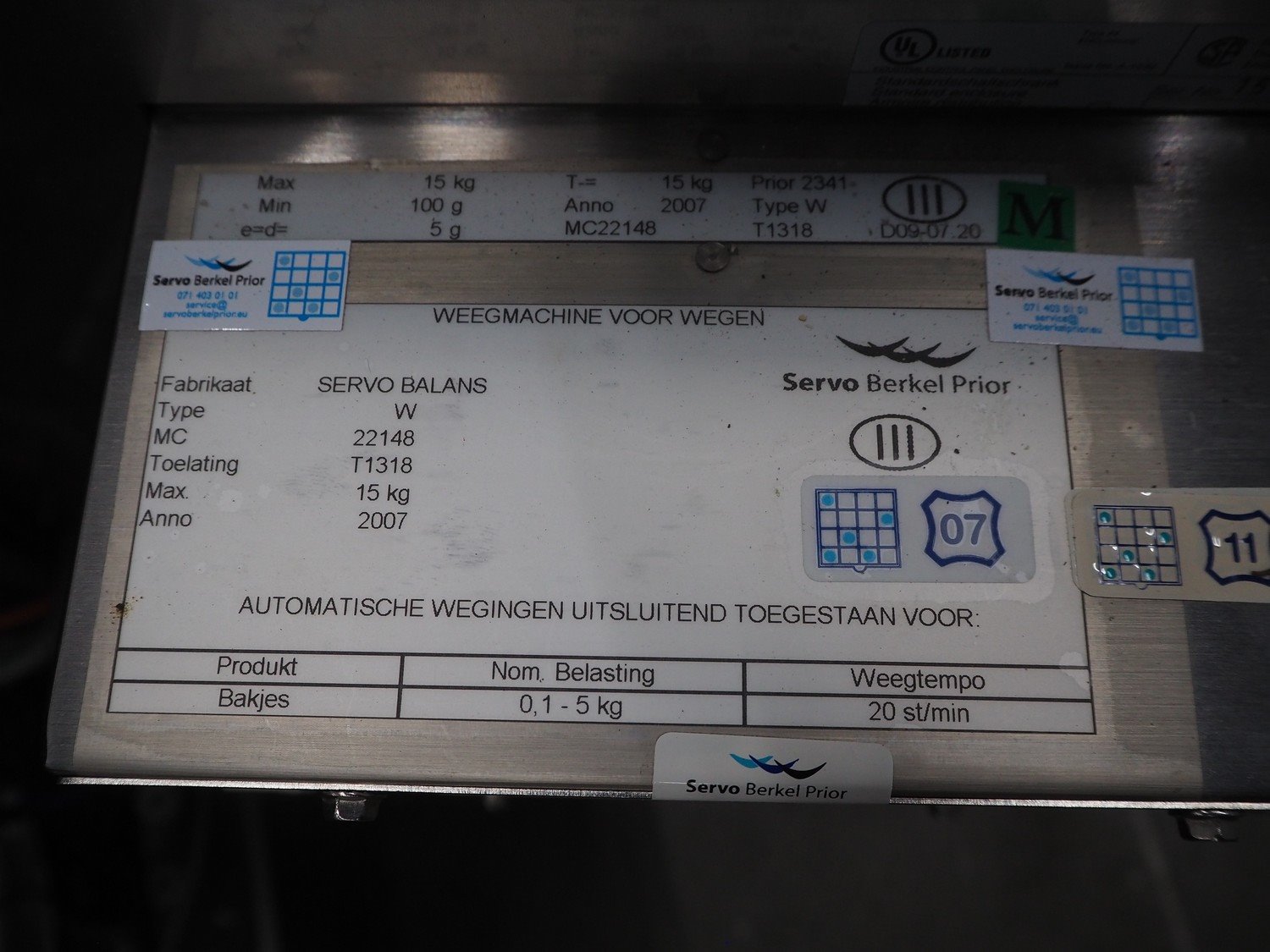 Berkel Prior checkweigher with 2 Mectec labelling machines, type checkweigher: weegmachine voor, serial number: Mc 22148, maximum weight: 15 kg, minimum weight: 0.1 kg, e=d= 0.005, Mectec labeller, type: PCU III-AXX-E, serial number: 53606, year of construction: 2007 and Mectec labeller, type: A1160-50-100/100-L, serial number: 53608, year of construction: 2007, plastic belt, belt width: 400 mm, total dimensions: 2100 mm x 900 mm x 1640 mm. Kavel locatie: Schouwrooij 29, 5281 RE Boxtel, Nederland