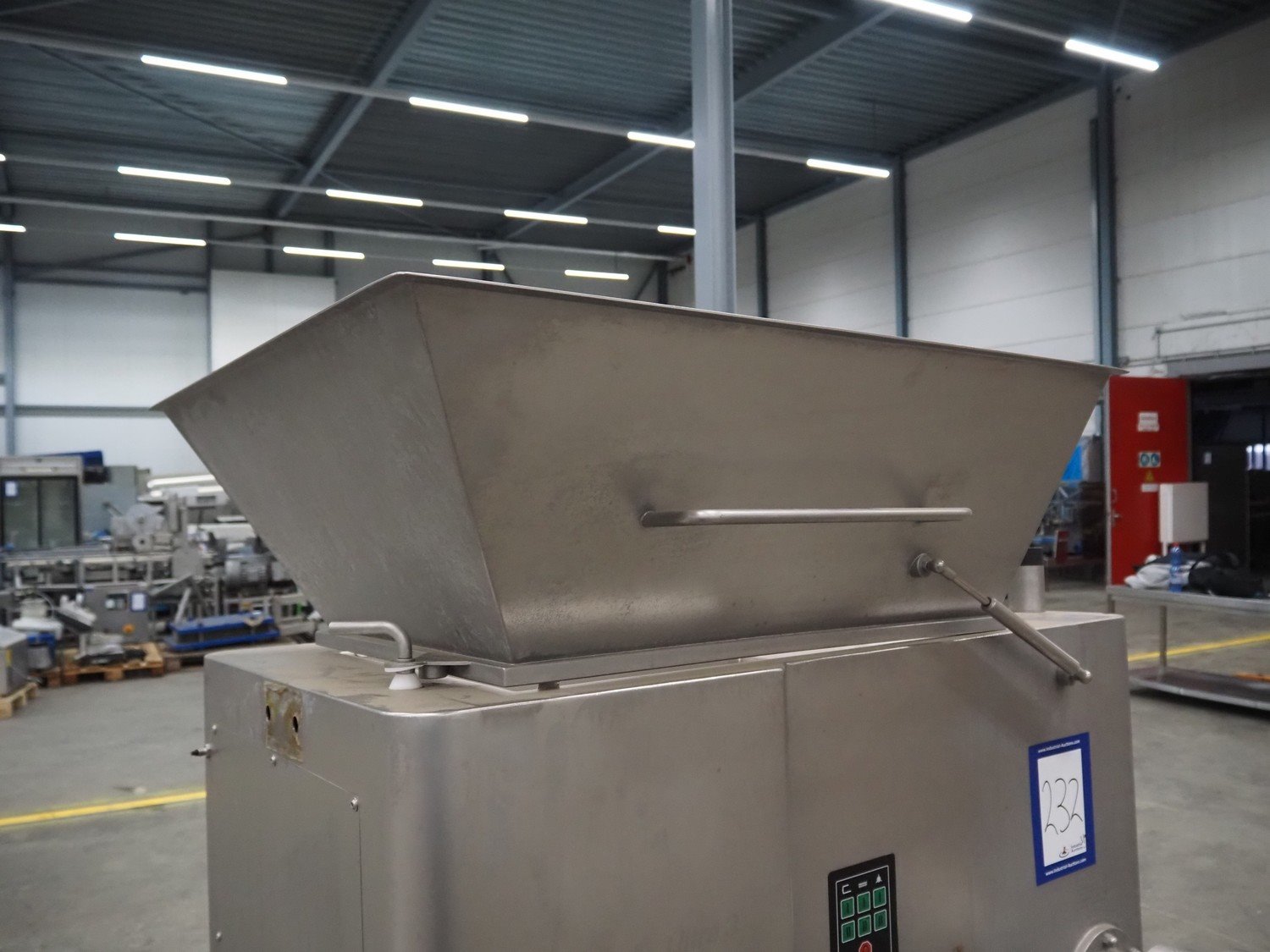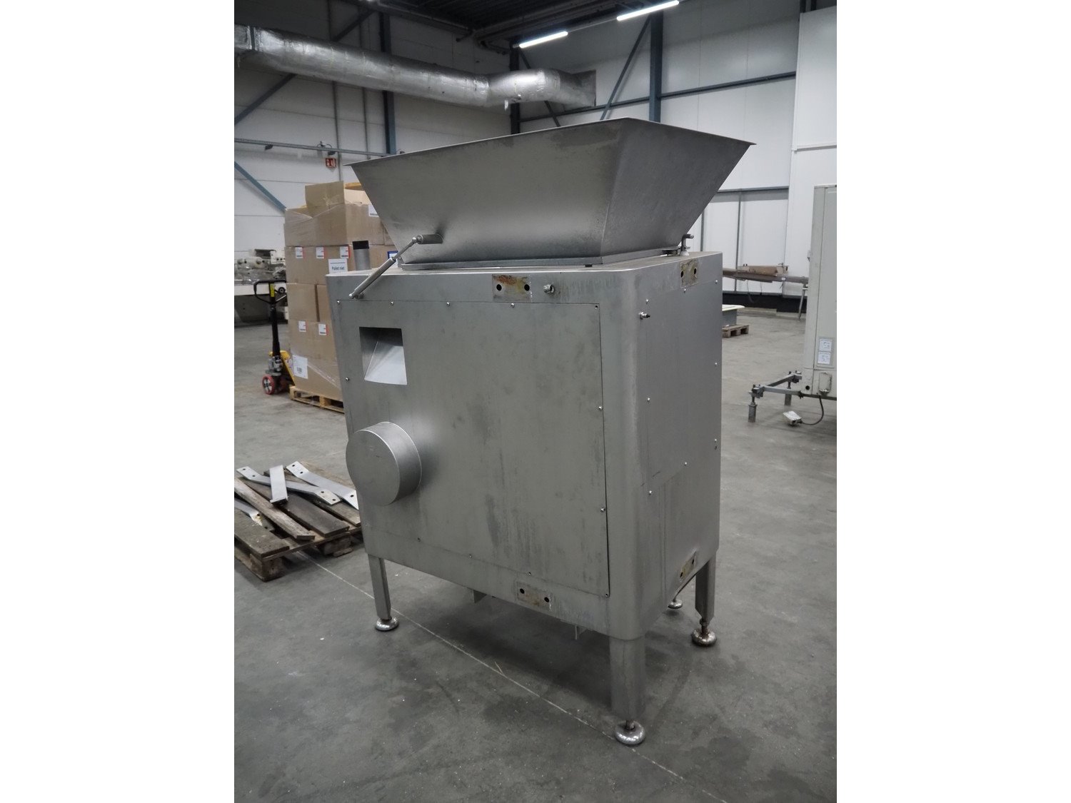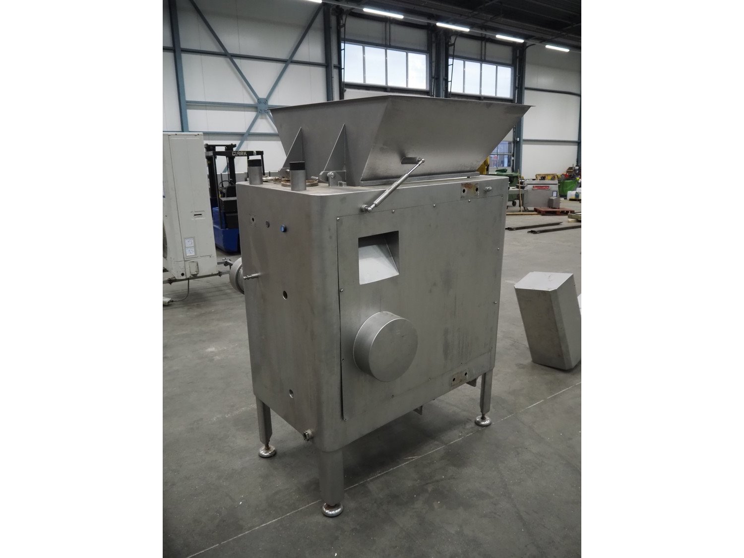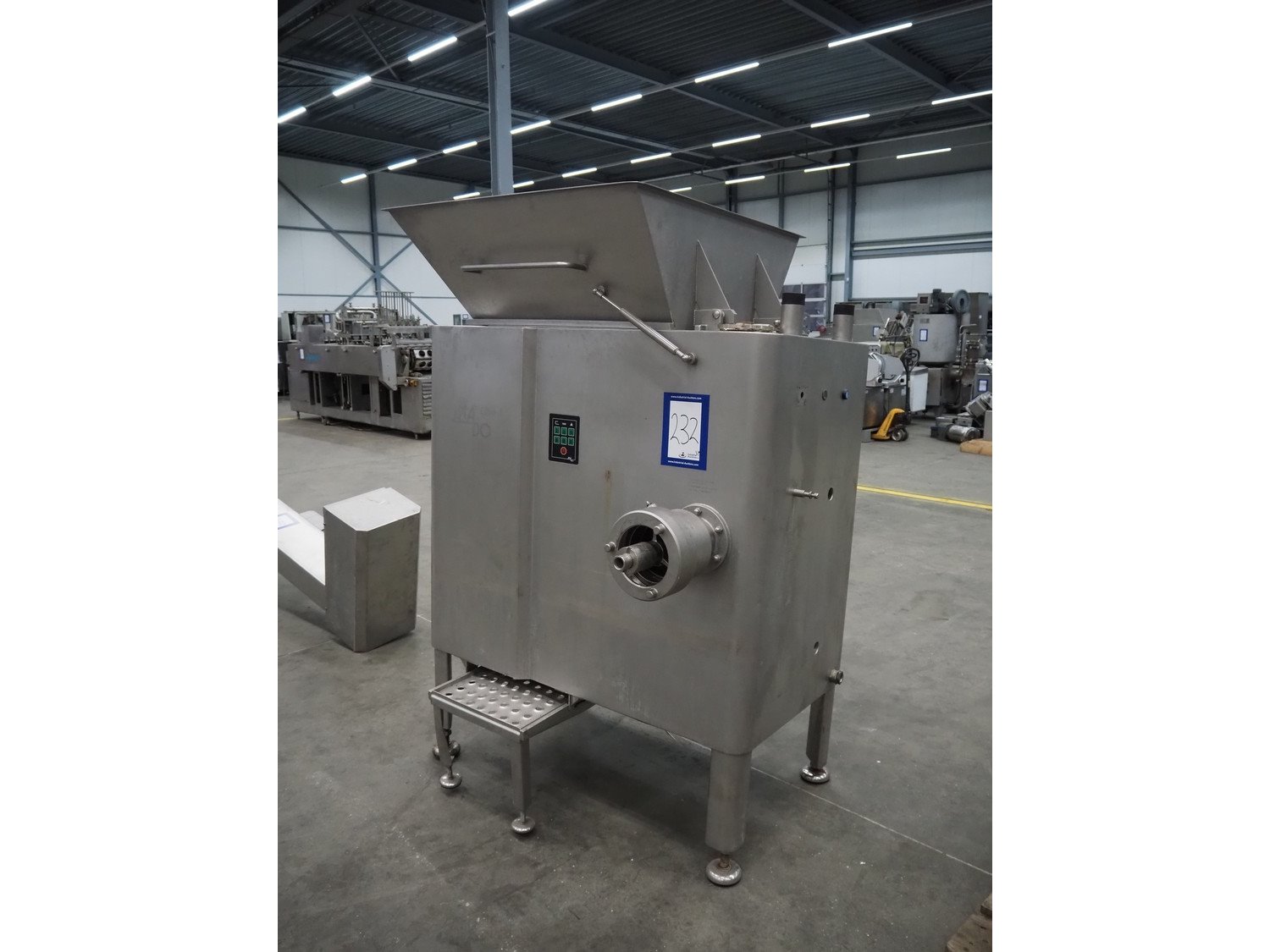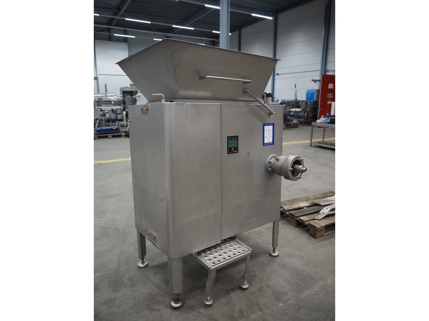 Mado mixer-grinder with Carsø lifter for 200 liter meat bins, diameter plate: 160 mm, dimensions mixer-ginder: 1320 mm x 1100 mm x 1850 mm, lifter type: HKV200, serial number: 94606, year of construction: 2001, 400 V, 3 Ph, 0.75 kW, lifting height: 2000 mm, dimensions lifter: 3300 mm x 1400 mm x 700 mm. Kavel locatie: Schouwrooij 29, 5281 RE Boxtel, Nederland