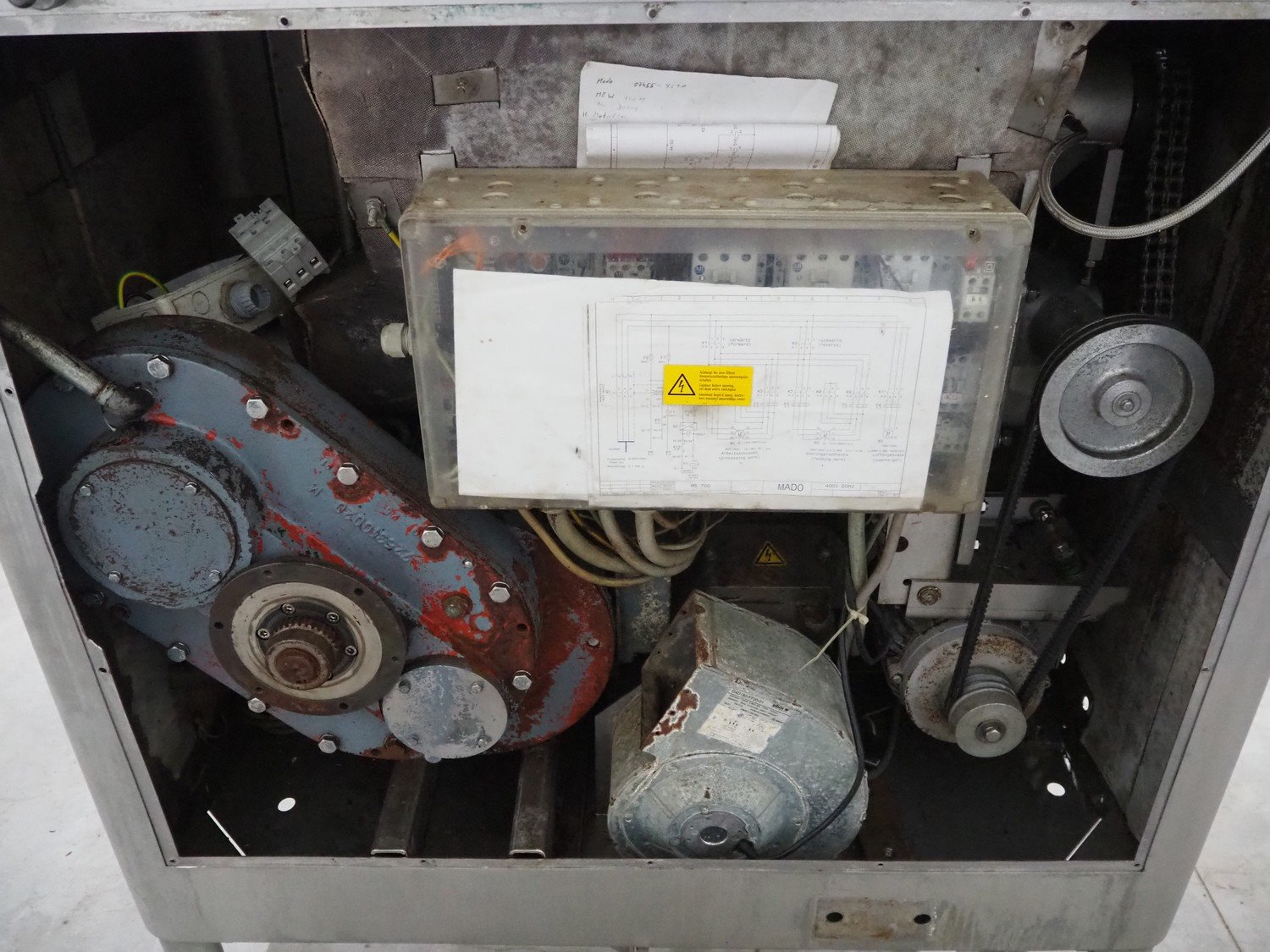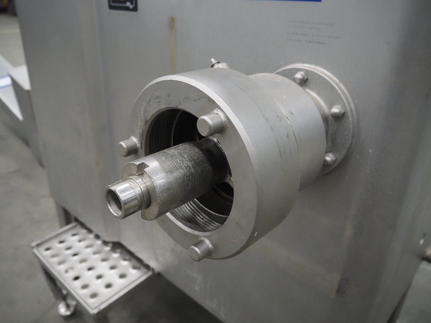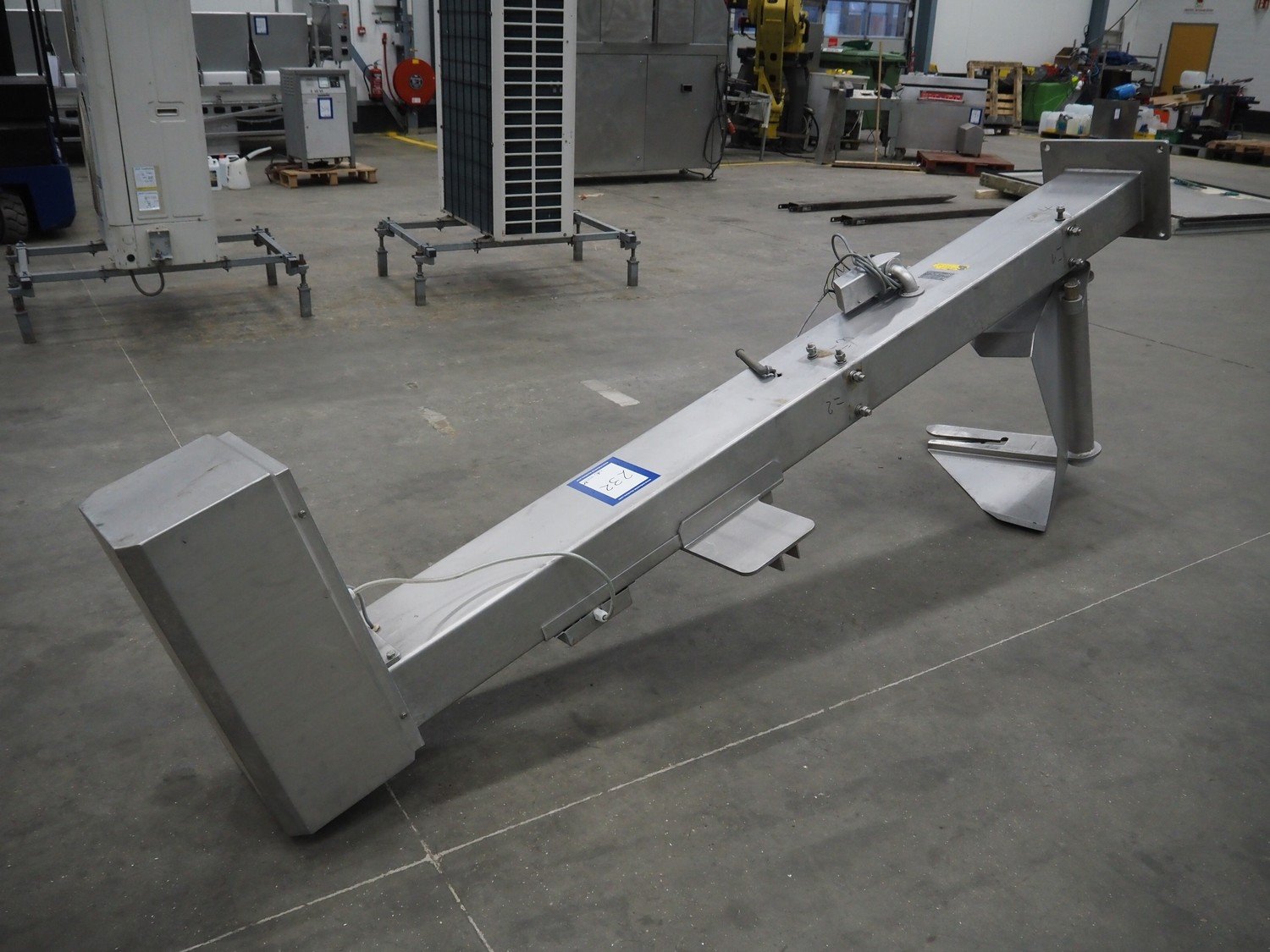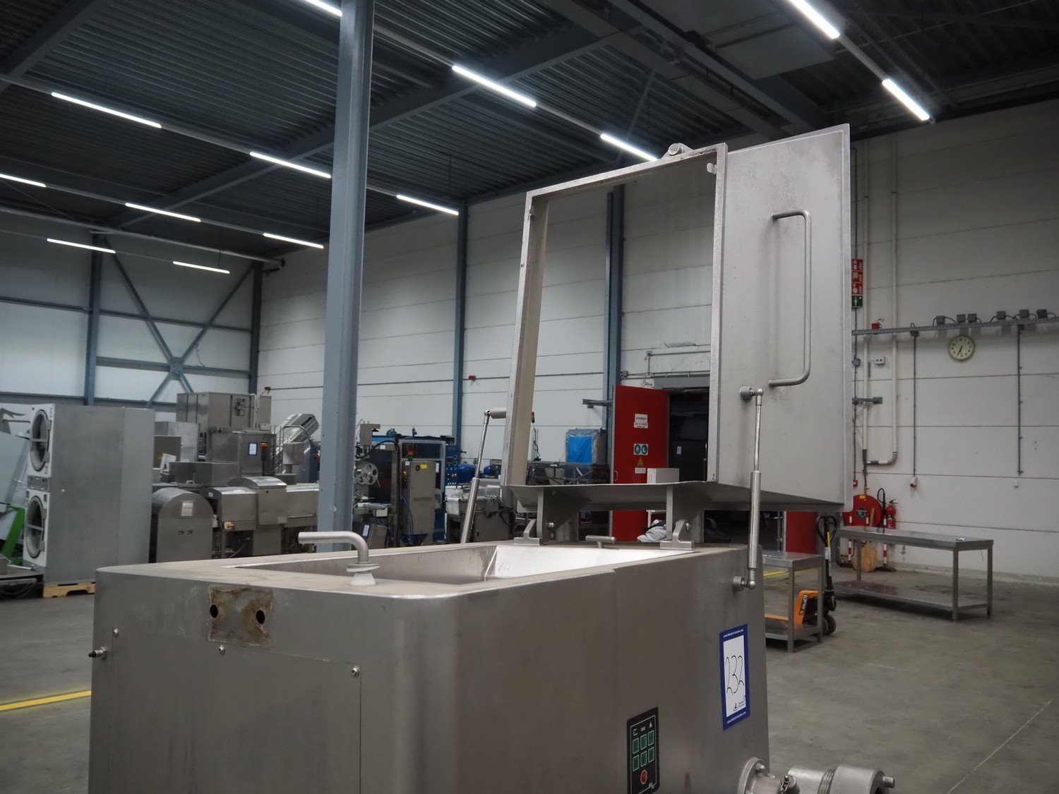 Mado mixer-grinder with Carsø lifter for 200 liter meat bins, diameter plate: 160 mm, dimensions mixer-ginder: 1320 mm x 1100 mm x 1850 mm, lifter type: HKV200, serial number: 94606, year of construction: 2001, 400 V, 3 Ph, 0.75 kW, lifting height: 2000 mm, dimensions lifter: 3300 mm x 1400 mm x 700 mm. Kavel locatie: Schouwrooij 29, 5281 RE Boxtel, Nederland