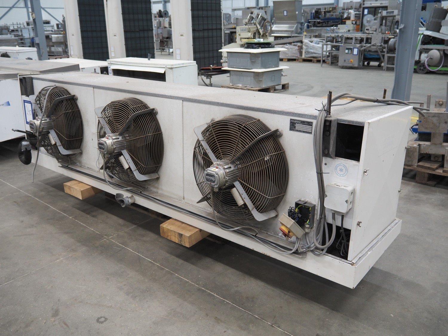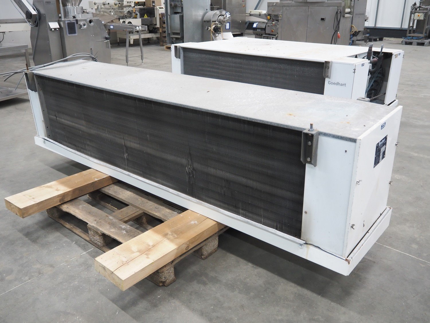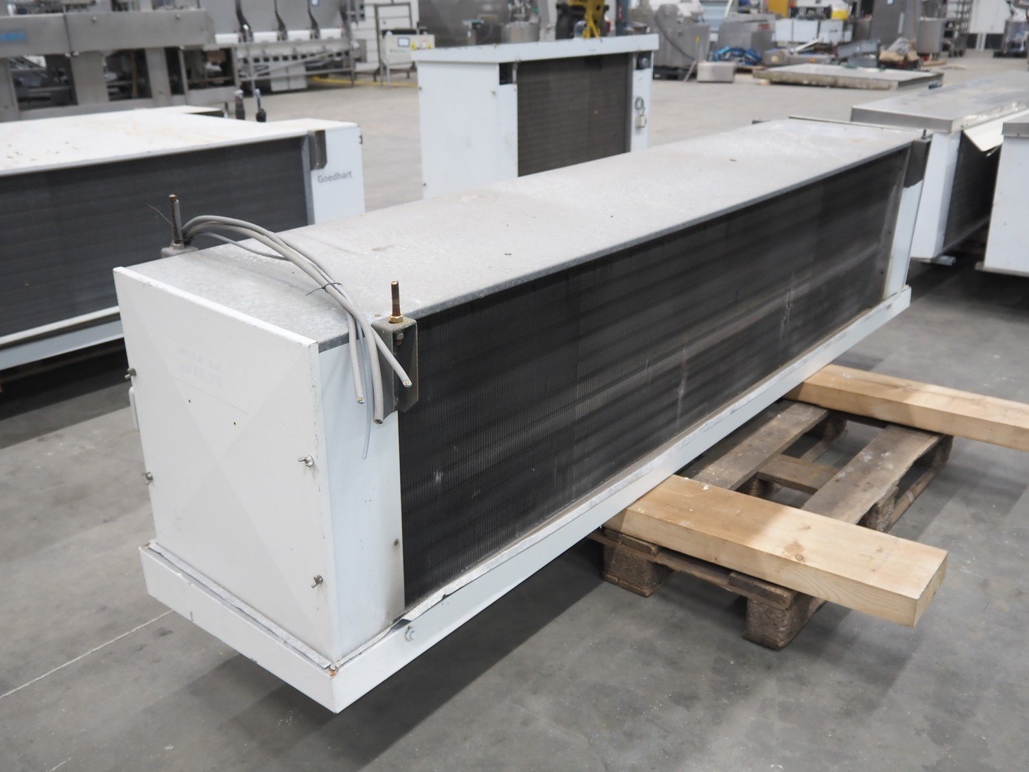 Goedhart evaporator, 3 fans, type: VCB 63457, manufacturing number: 99-0835-020, year of construction: 1999, maximum working temperature: -10/42 ⁰C, maximum working pressure: 19.5 bar, volume: 35 dm³, weight: 190 kg, dimensions: 2850 mm x 850 mm x 700 mm. Kavel locatie: Schouwrooij 29, 5281 RE Boxtel, Nederland