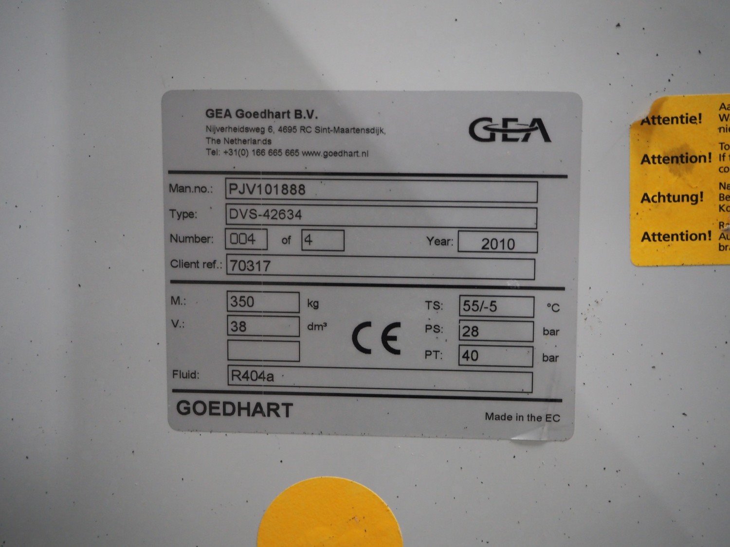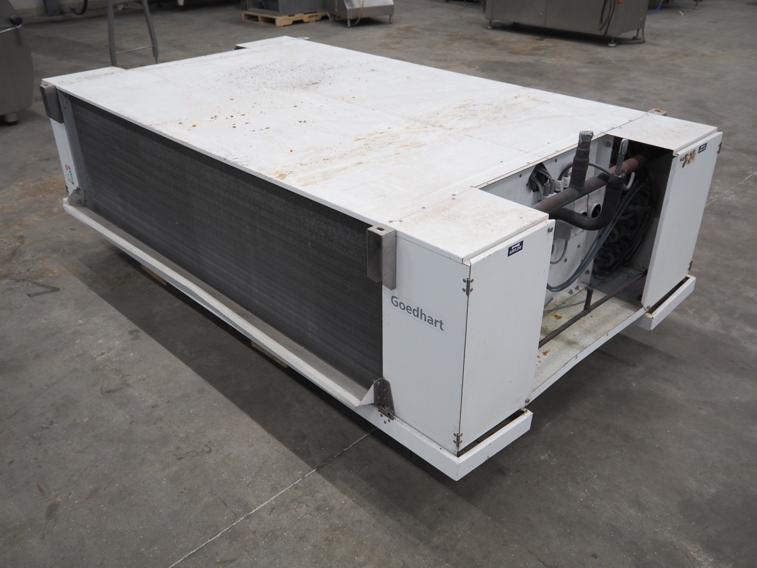 GEA Goedhart B.V. evaporator, 2 fans, type: DVS-42634, manufacturing number: PJV101888, year of construction: 2010, fluid: R404a, maximum work pressure: 28 bar, working temperature: +55/-5 ⁰C, volume: 38 dm³, dimensions: 2500 mm x 1500 mm x 970 mm. Kavel locatie: Schouwrooij 29, 5281 RE Boxtel, Nederland