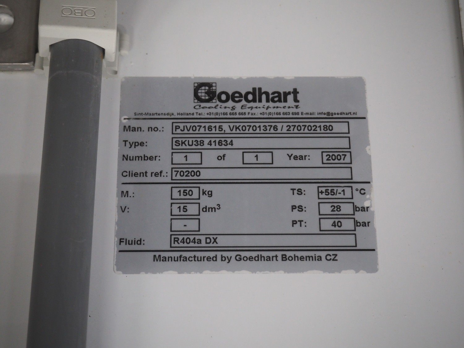 Goedhart evaporator, 1 fan, type: SKU38 41634, manufacturing number: PJV071615. VK0701376/270702180, year of construction: 2007, fluid: R404a, maximum work pressure: 28 bar, working temperature: +55/-1⁰C, volume: 15 dm³, dimensions: 1660 mm x 730 mm x 1080 mm. Kavel locatie: Schouwrooij 29, 5281 RE Boxtel, Nederland