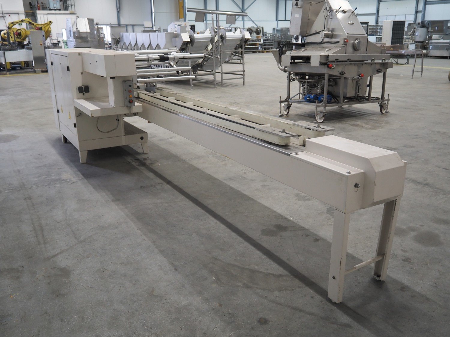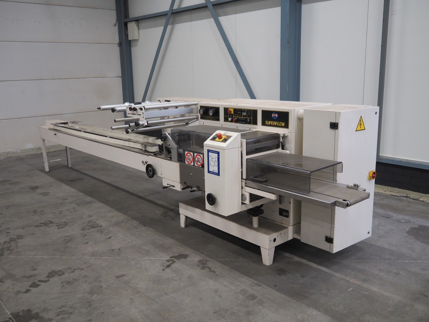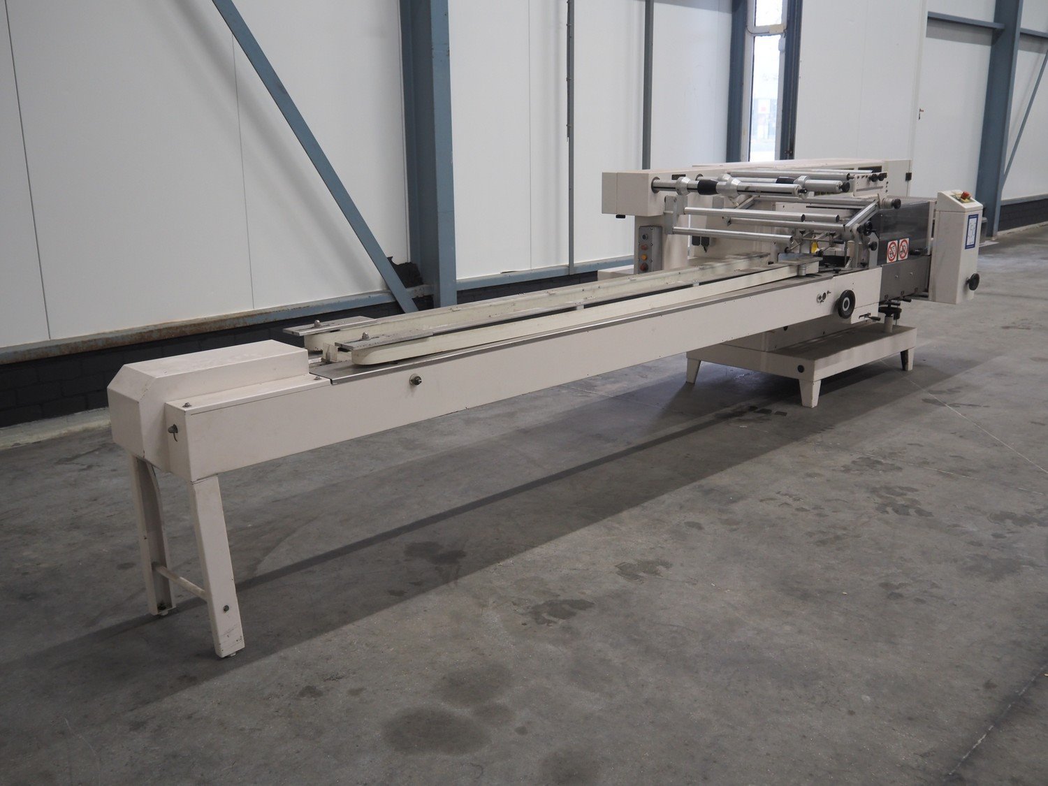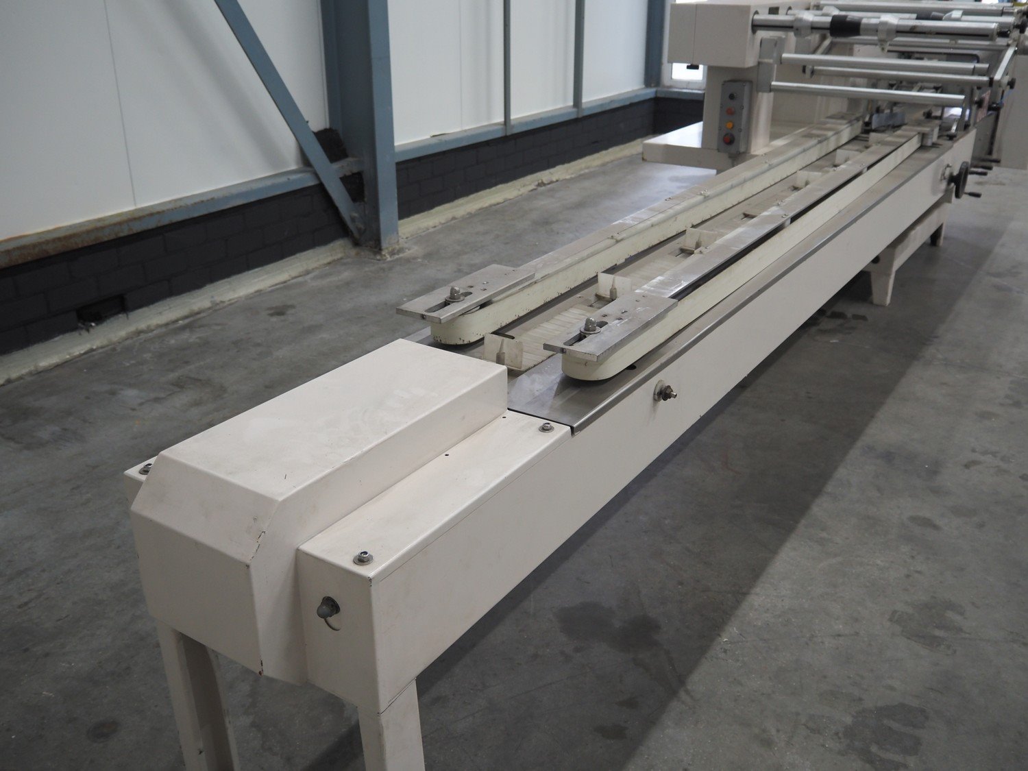Ilapak Italia S.p.a. flowpacker, type: UNO, serial number: 061 96, year of construction: 4/1996, 380 V, 50 Hz, 5000 W, plastic infeed belt with dividers, belt width: 100 mm, divider height: 55 mm, distance between dividers: 430 mm, seal width: 250 mm, plastic outfeed belt, belt width: 240 mm, total dimensions: 5900 mm x 1300 mm x 1310 mm. Kavel locatie: Schouwrooij 29, 5281 RE Boxtel, Nederland
