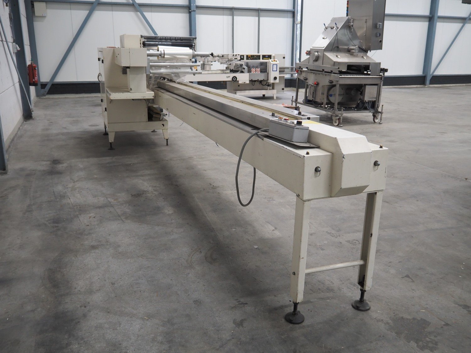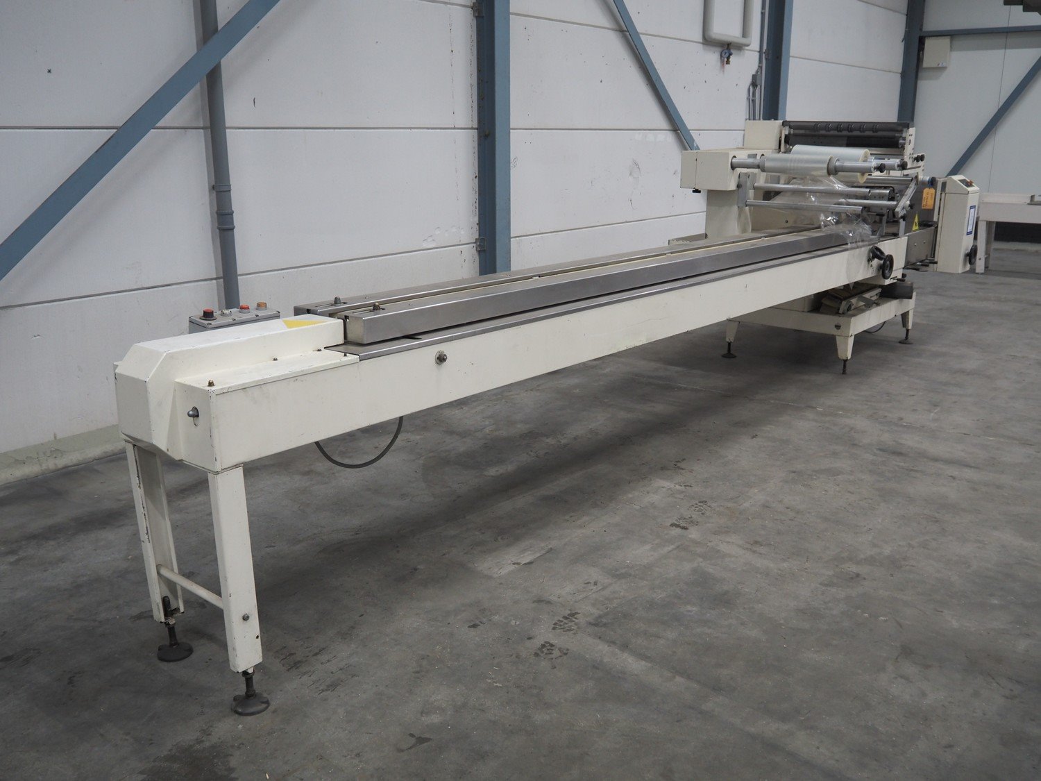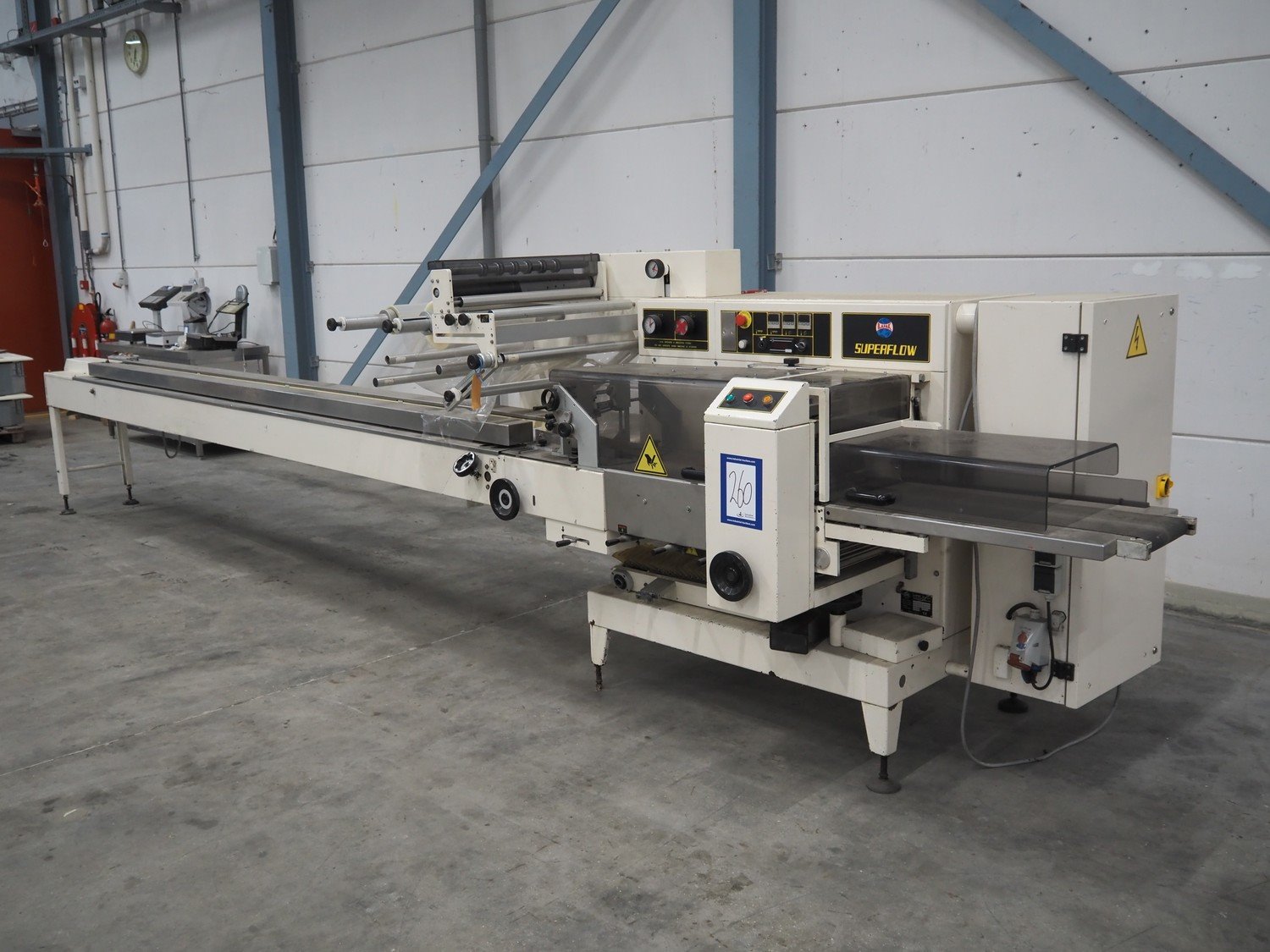 Ilapak Italia S.p.a. flowpacker, type: Superflow, serial number: 99 056, year of construction: 4/1999, 400 V, 3 Ph, 50 Hz, 10 A, 5000 W, seal width: 250 mm, plastic belt, belt width: 100 mm, film width: 400 mm and 350 mm, total dimensions: 6800 mm x 1300 mm x 1600 mm. Kavel locatie: Schouwrooij 29, 5281 RE Boxtel, Nederland
