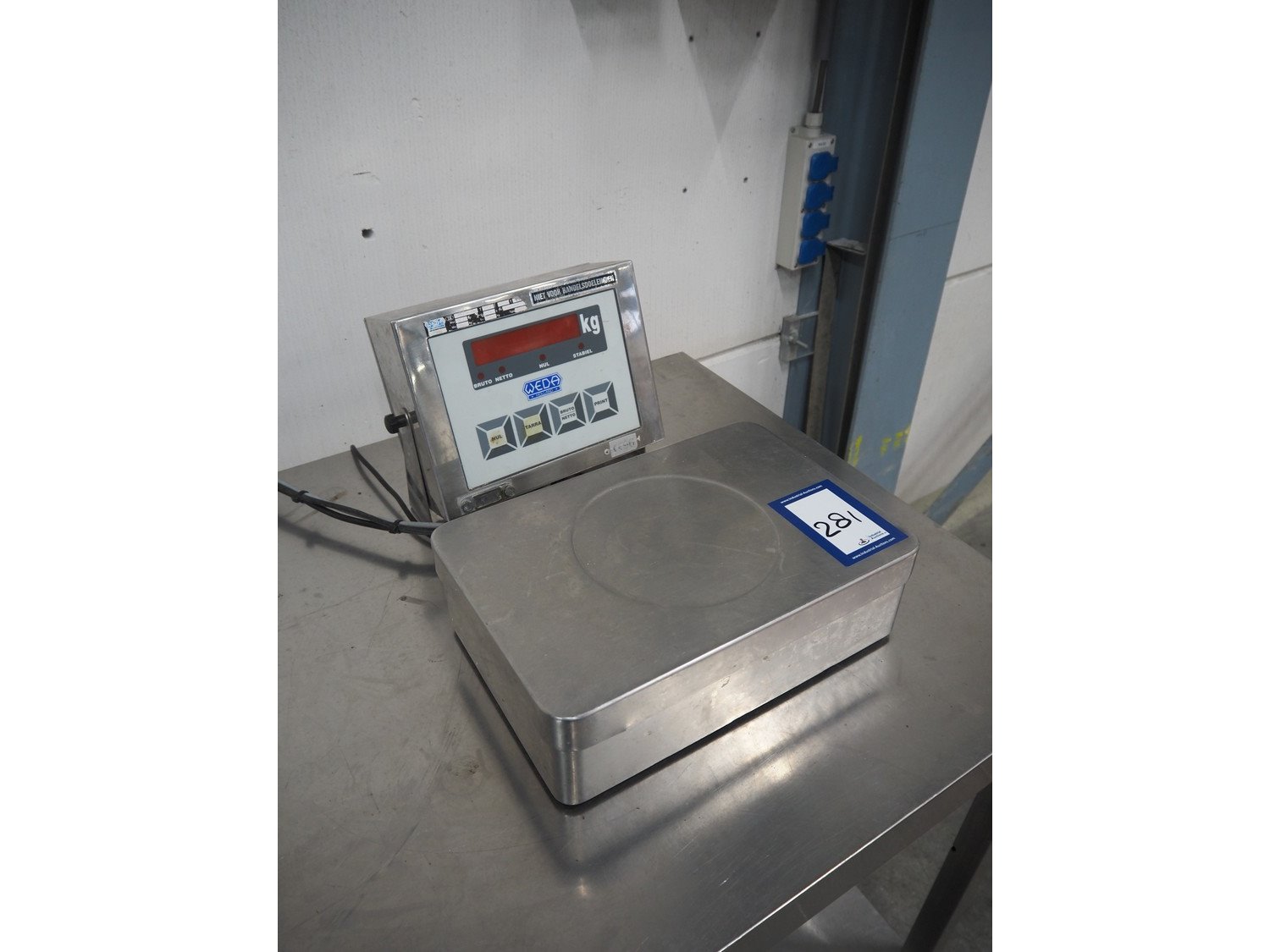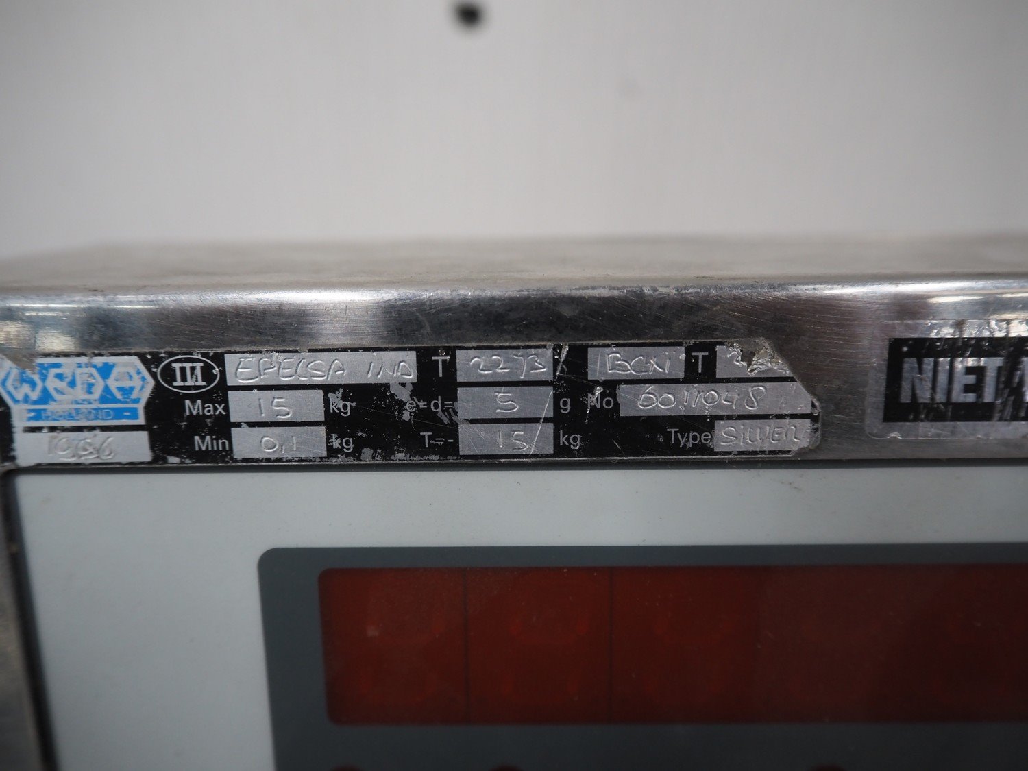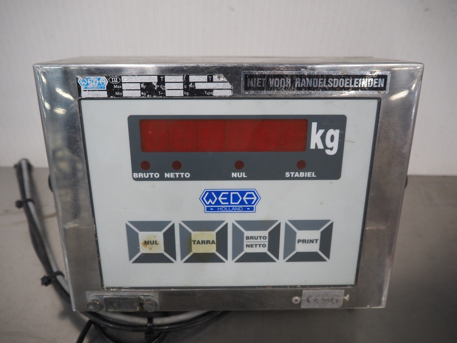 WEDA weighing scale with indicator, number: 6011048, maximum: 15 kg, minimum: 0.1 kg, e=d=5g, dimensions scale: 360 mm x 240 mm x 110 mm. Kavel locatie: Schouwrooij 29, 5281 RE Boxtel, Nederland