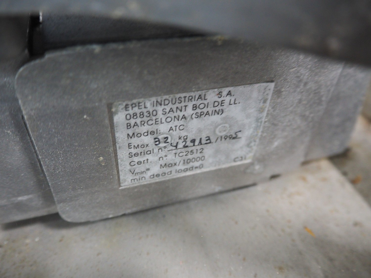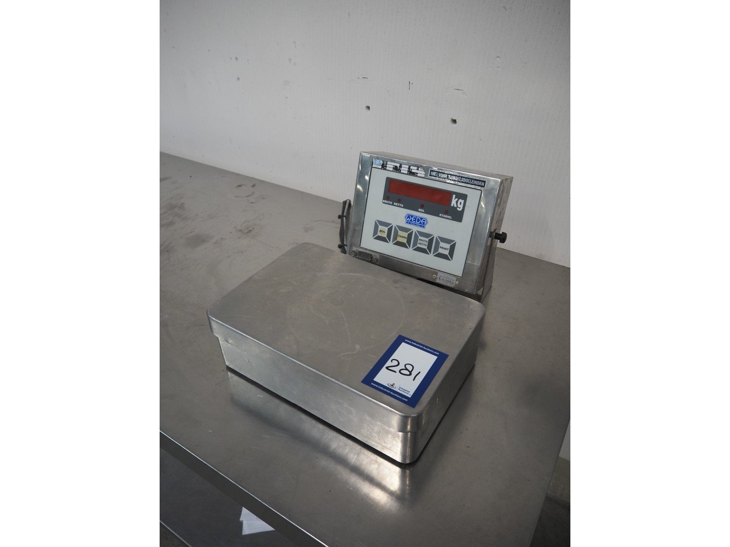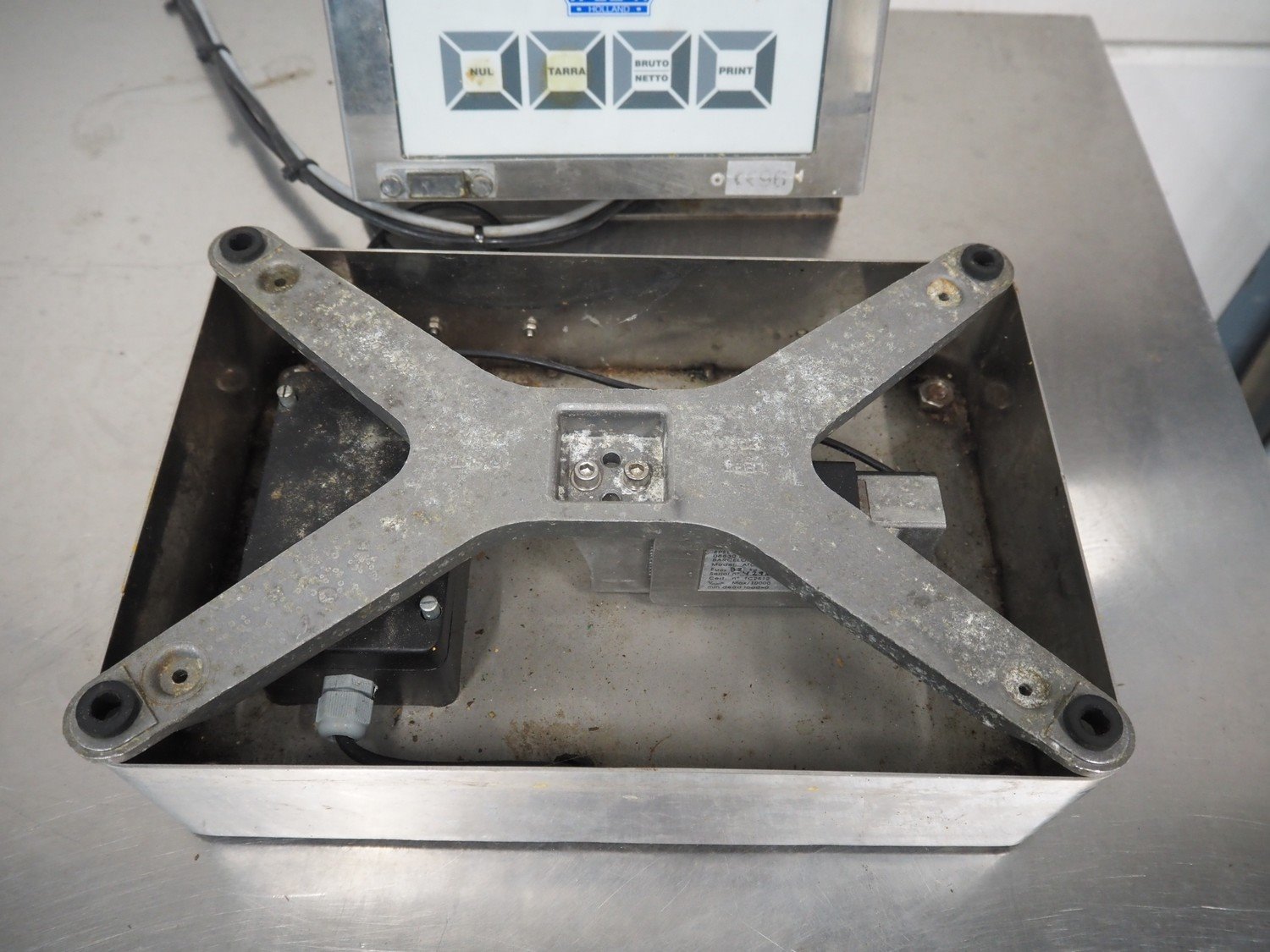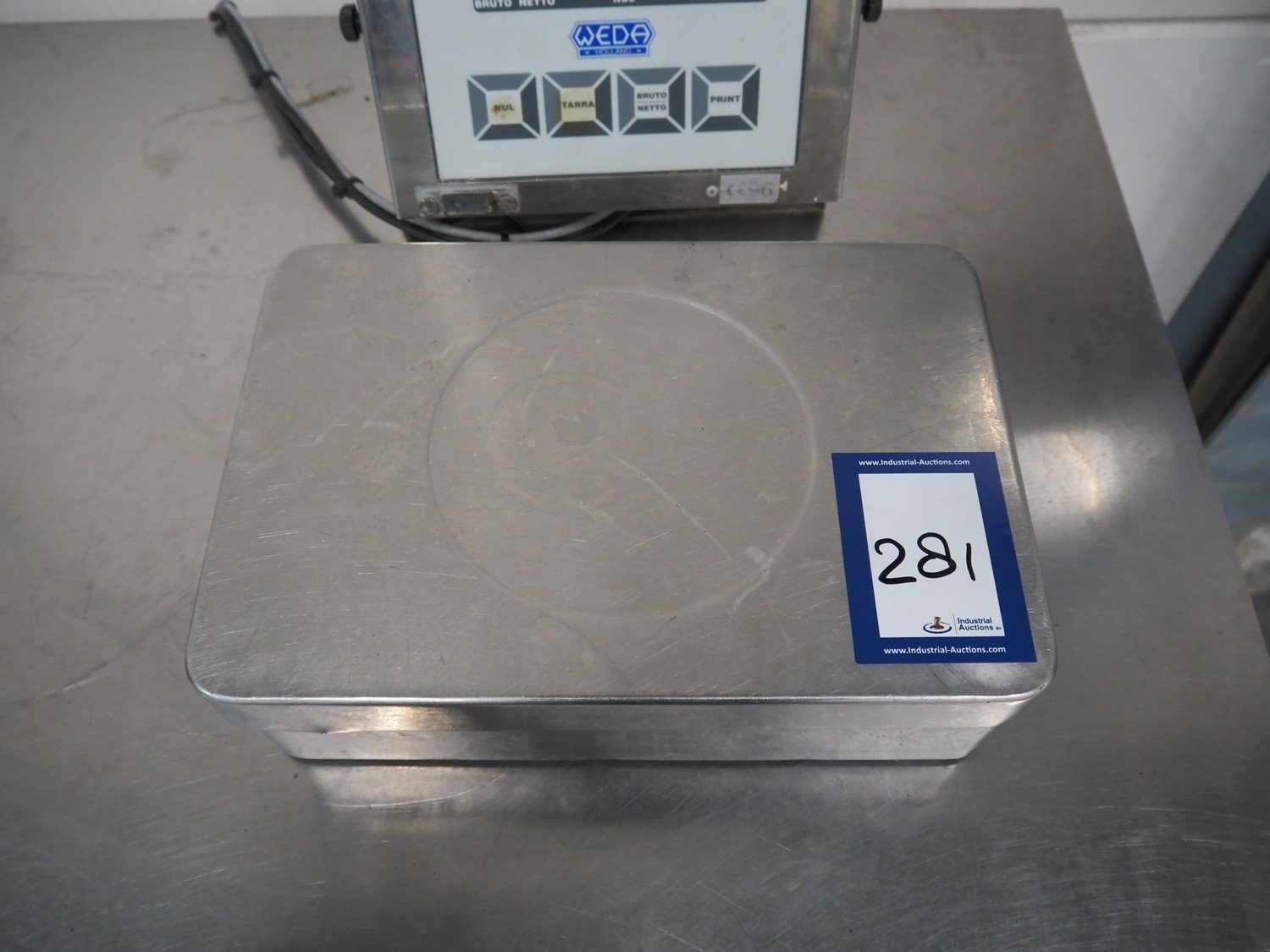WEDA weighing scale with indicator, number: 6011048, maximum: 15 kg, minimum: 0.1 kg, e=d=5g, dimensions scale: 360 mm x 240 mm x 110 mm. Kavel locatie: Schouwrooij 29, 5281 RE Boxtel, Nederland