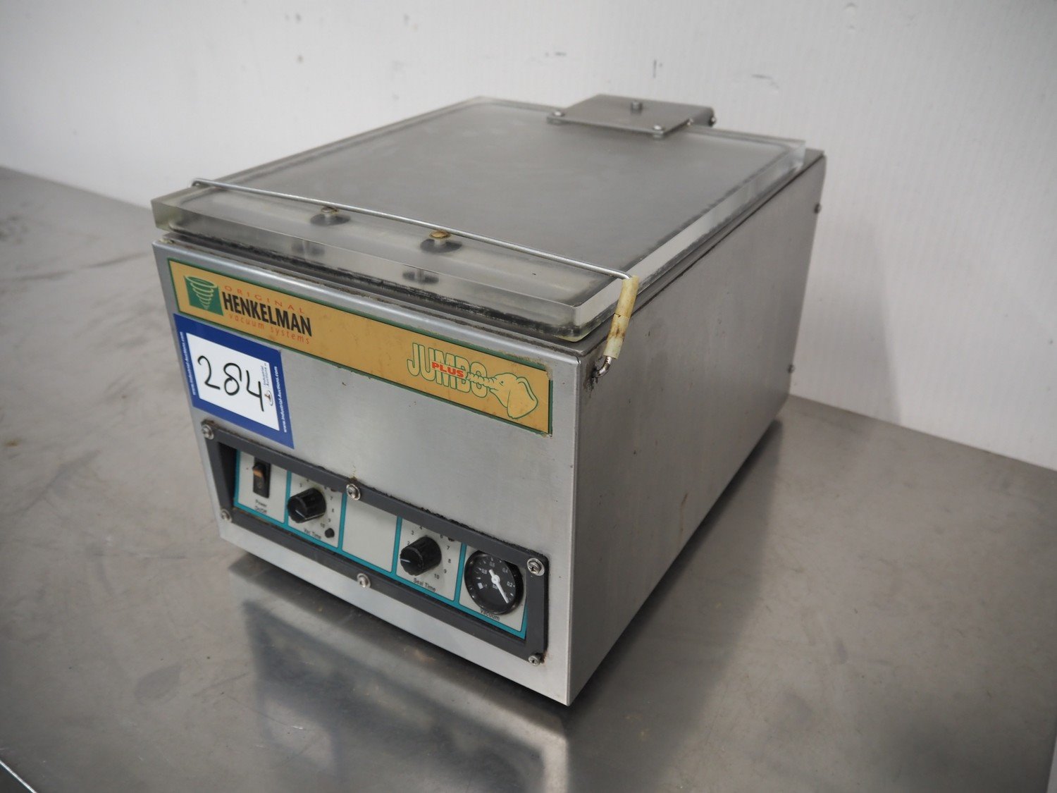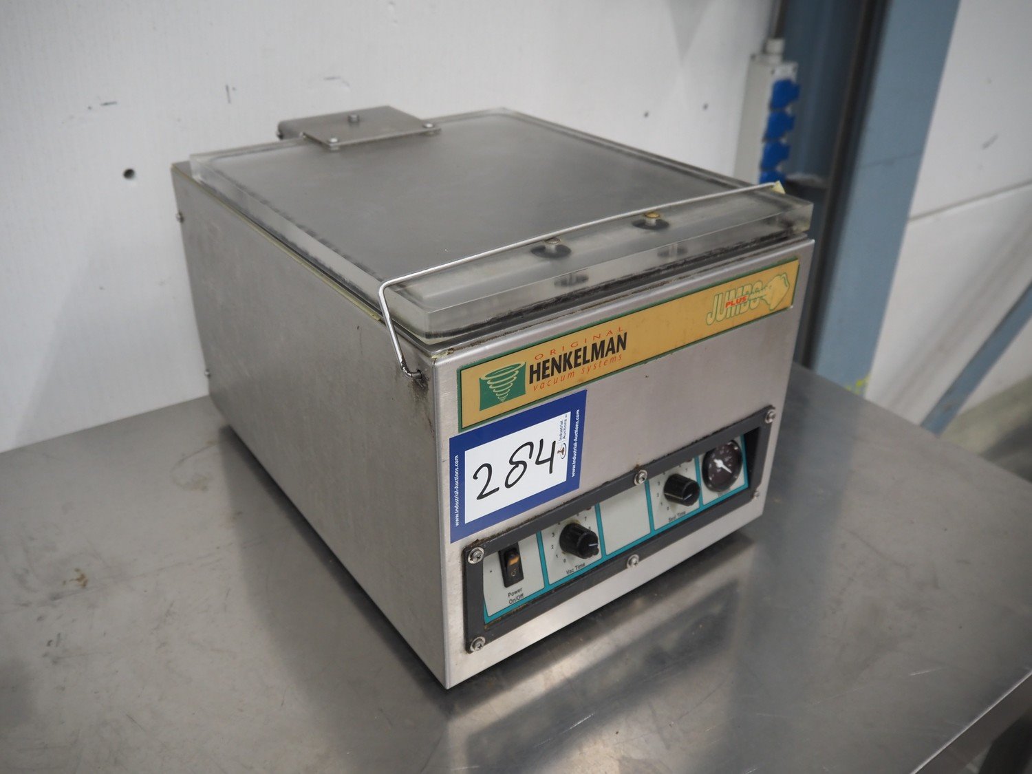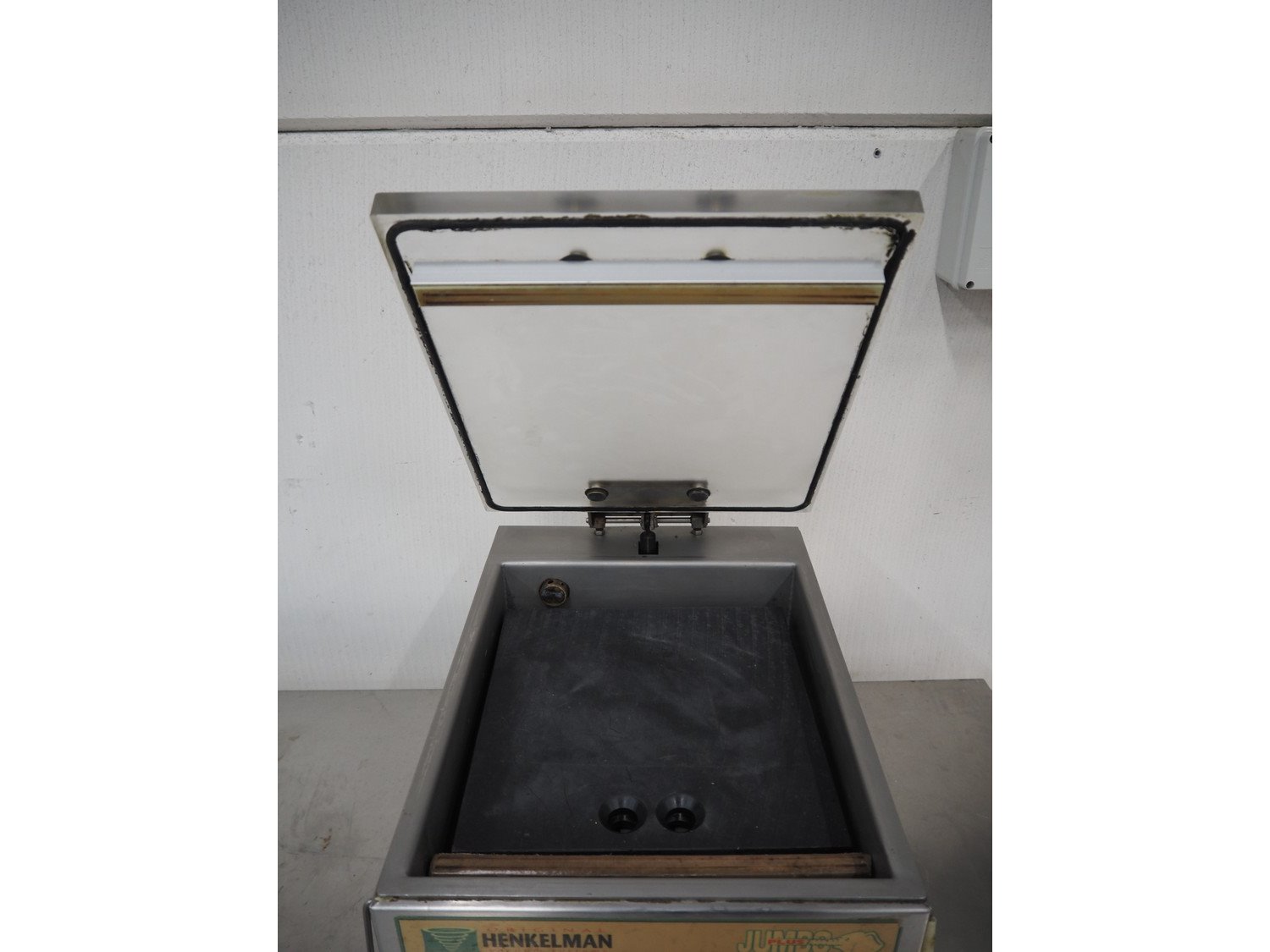Henkelman vacuum machine, type: JUMBO PLUS, number: 10302039, year of construction: 2003, 230 V, 1 Ph, 50 Hz, 1 kW, seal length: 280 mm, dimensions chamber: 305 mm x 285 mm x 50 mm, total dimensions: 450 mm x 340 mm x 300 mm. Kavel locatie: Schouwrooij 29, 5281 RE Boxtel, Nederland