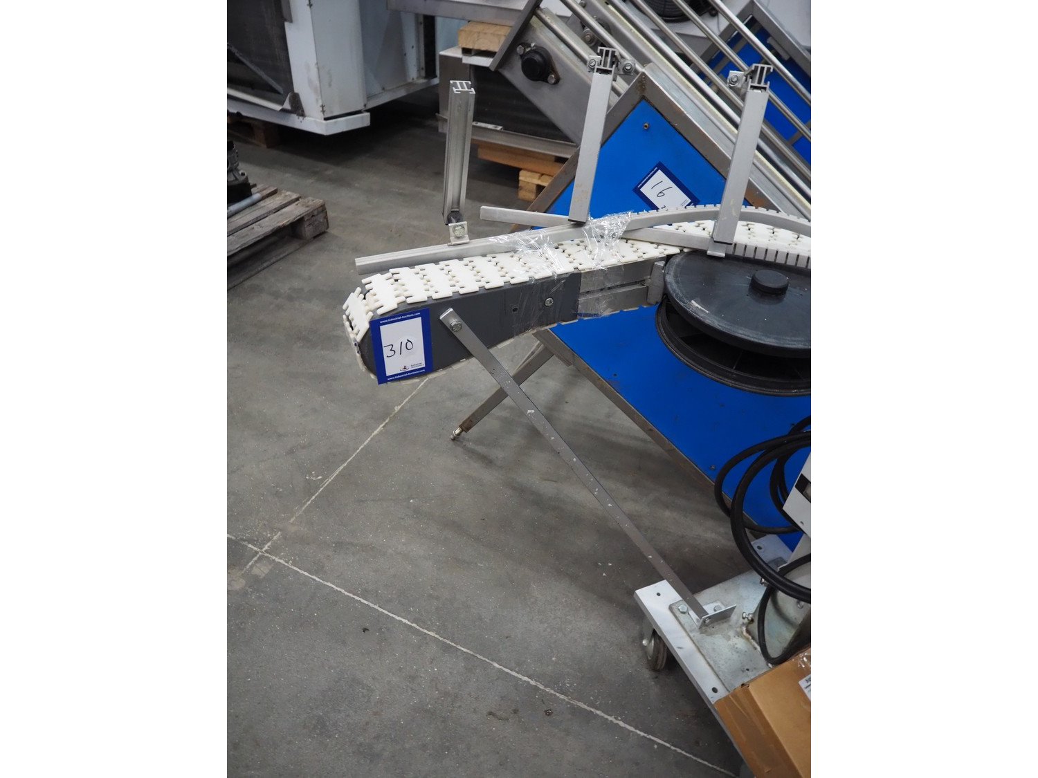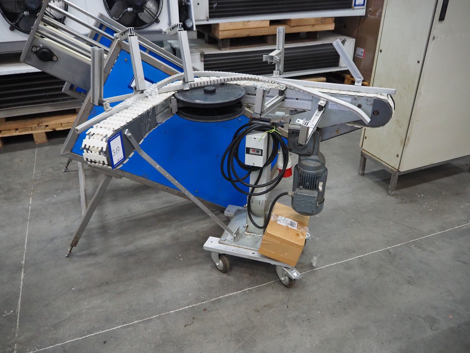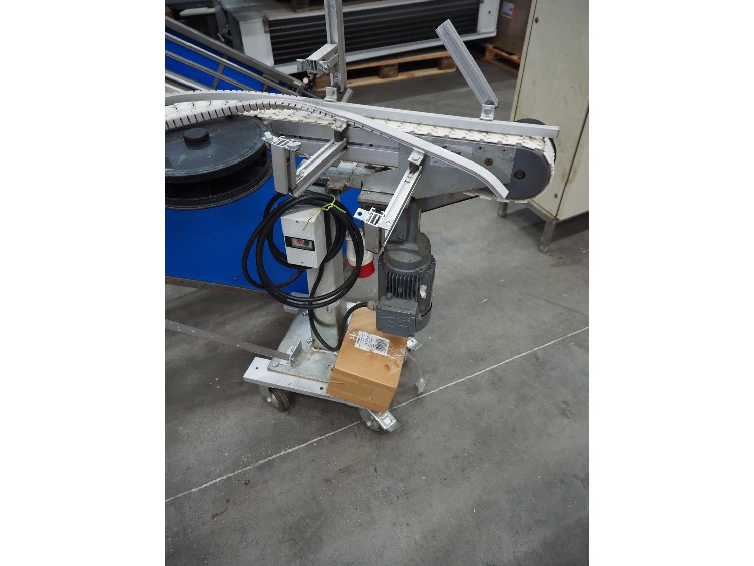 MBGM 90° curve conveyor, type: XM, fabrication number: 1254/2, year of construction: 1988, plastic belt, belt width: 80 mm, total dimensions: 900 mm x 900 mm x 920 mm. Kavel locatie: Schouwrooij 29, 5281 RE Boxtel, Nederland