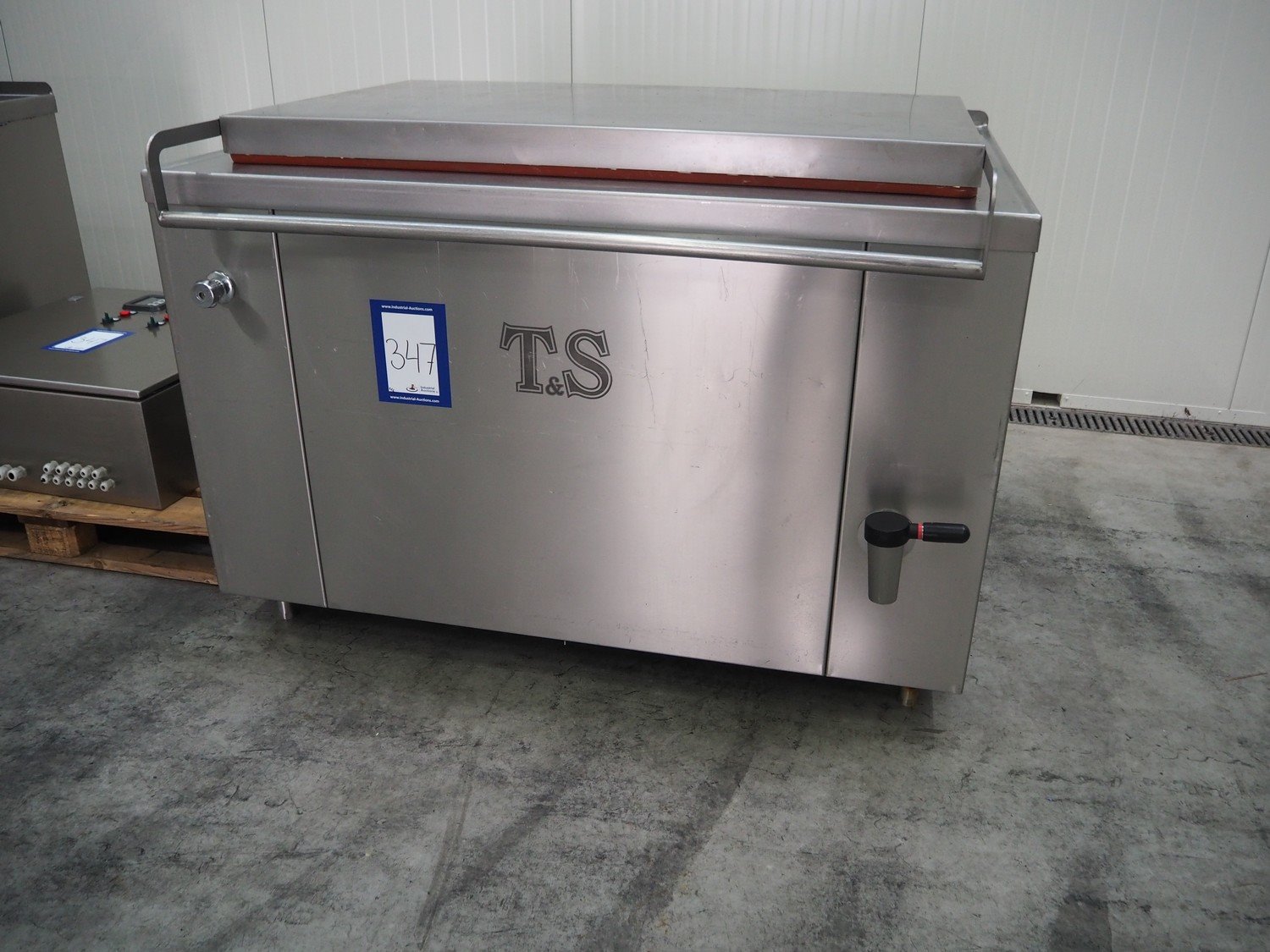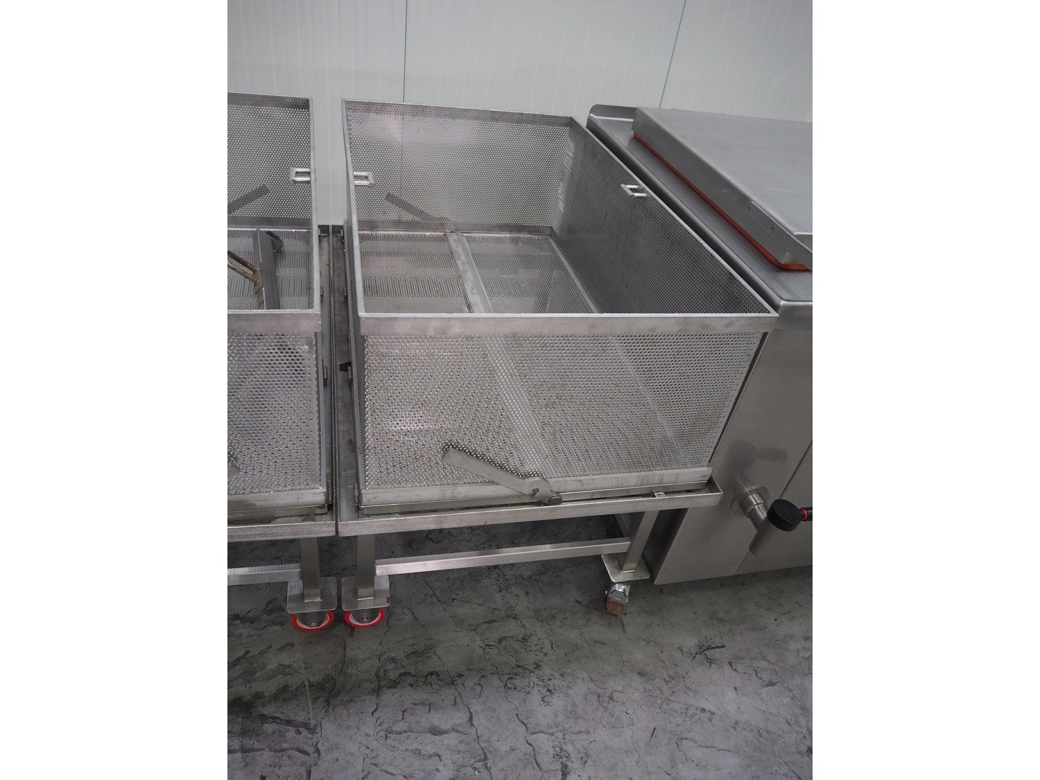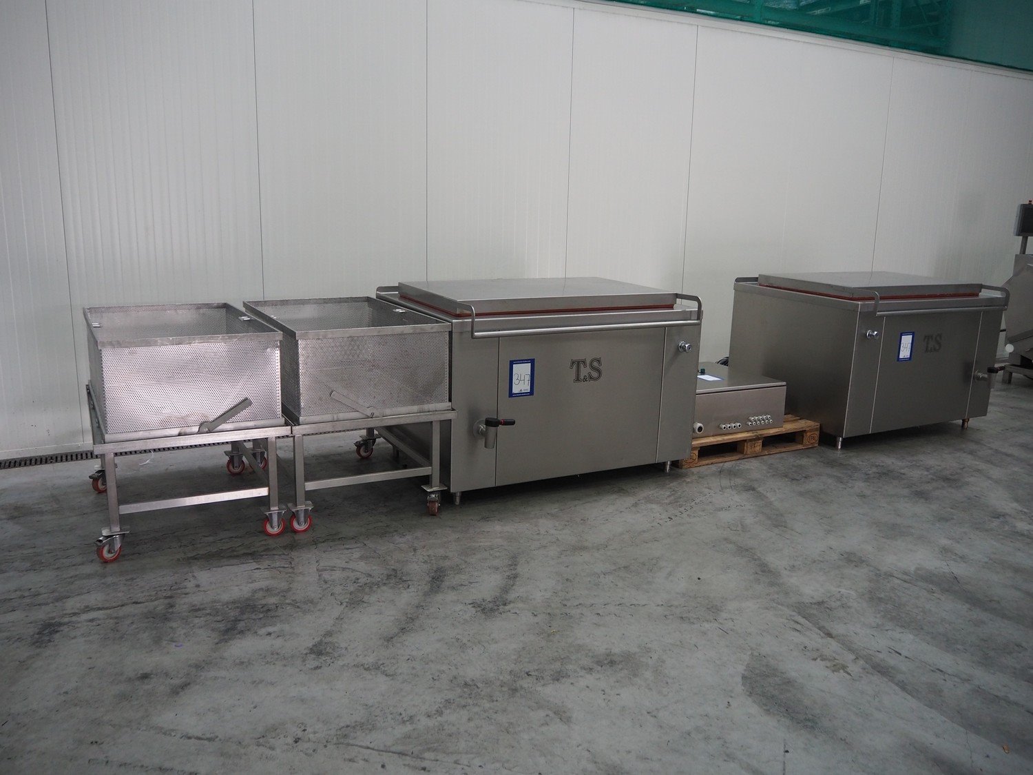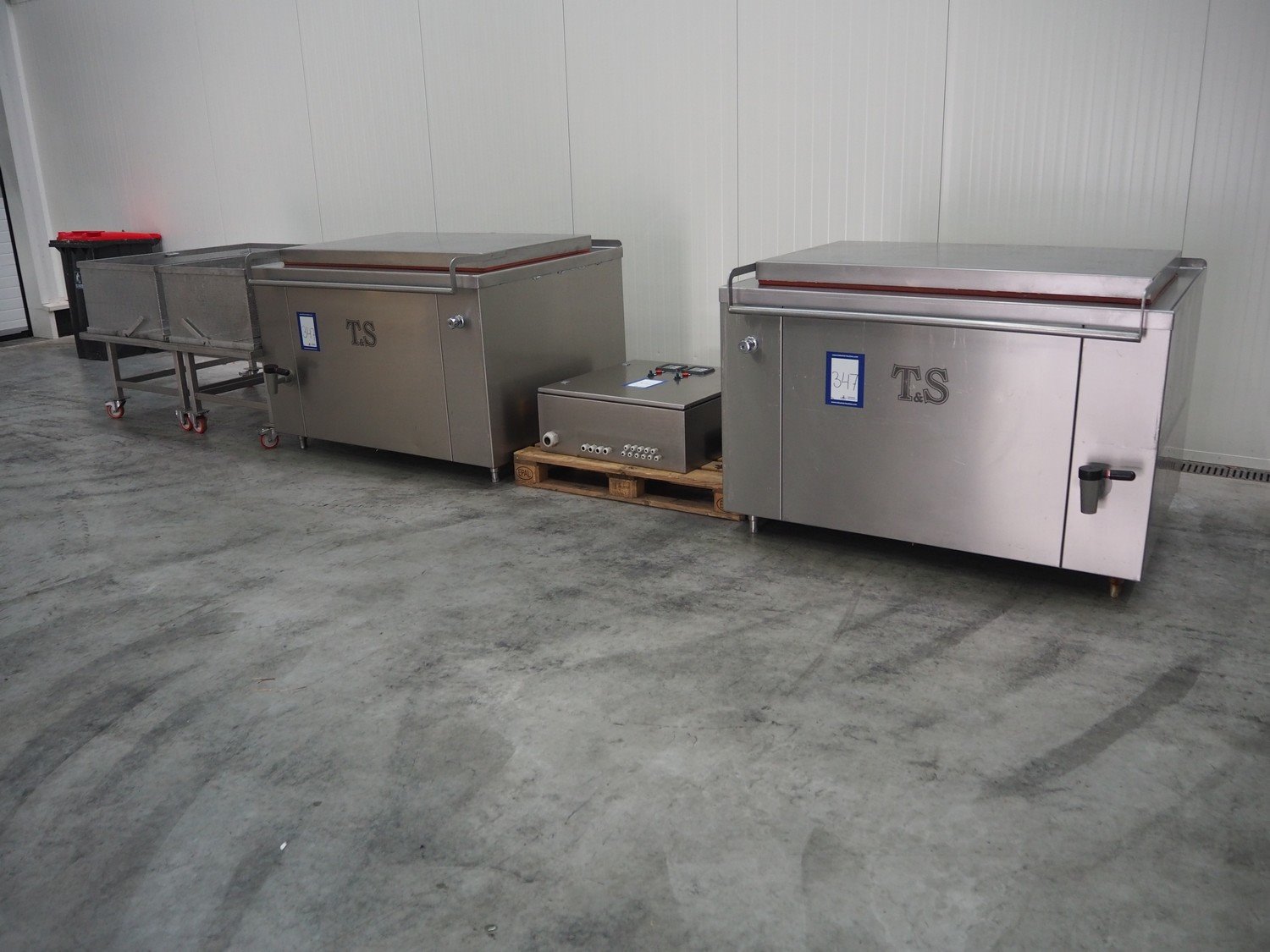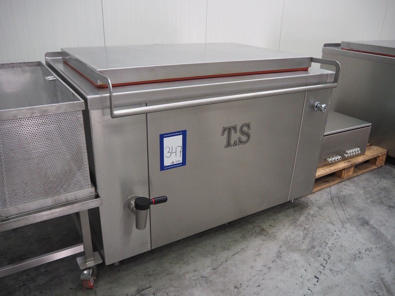 2 T&S cooking vessels with build-in steam generator, type: 500EG, volume: 500 liter, total dimensions: (2x) 1550 mm x 1400 mm x 1000 mm. Including 2 trolleys with basket dimensions: (2x) 1350 mm x 850 mm x 1000 mm and s/s switch cabinet. Kavel locatie: Schouwrooij 29, 5281 RE Boxtel, Nederland