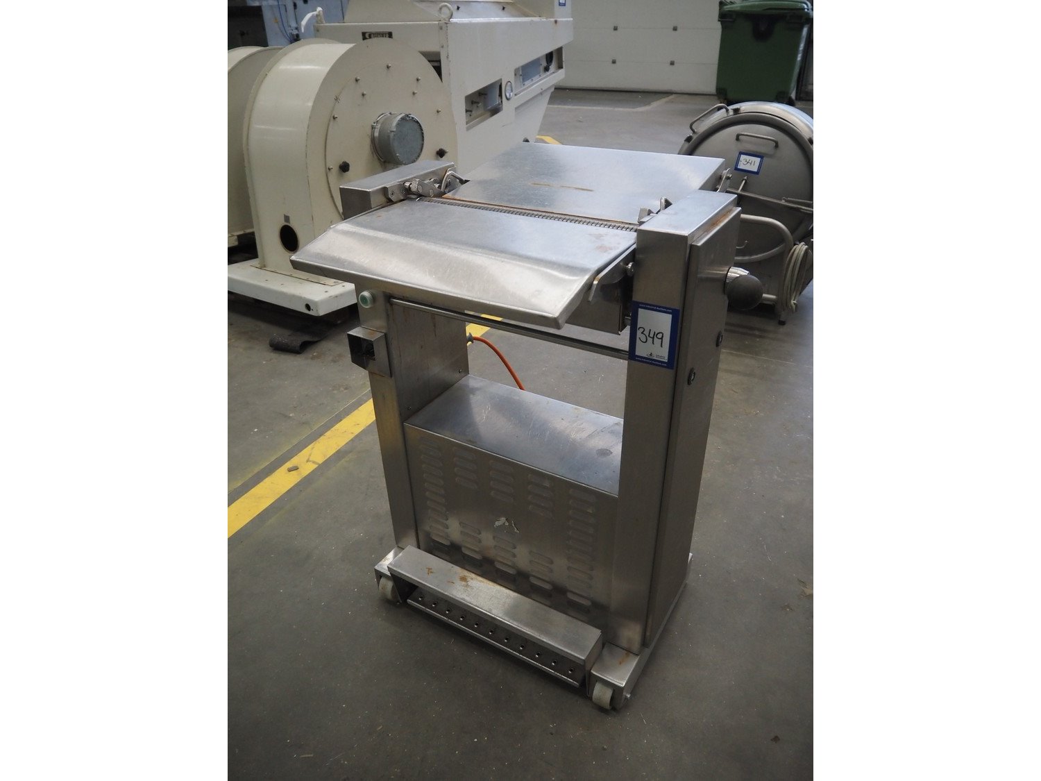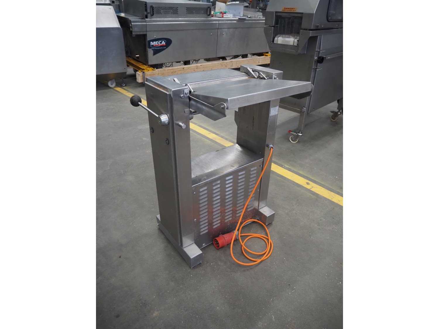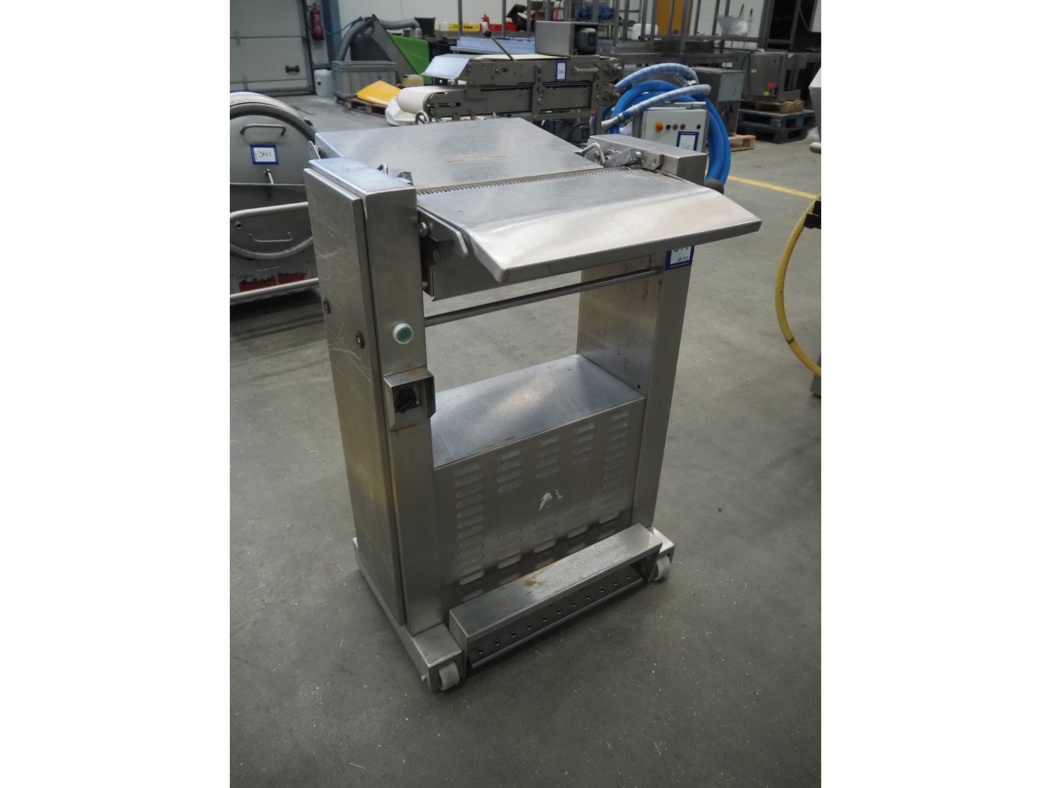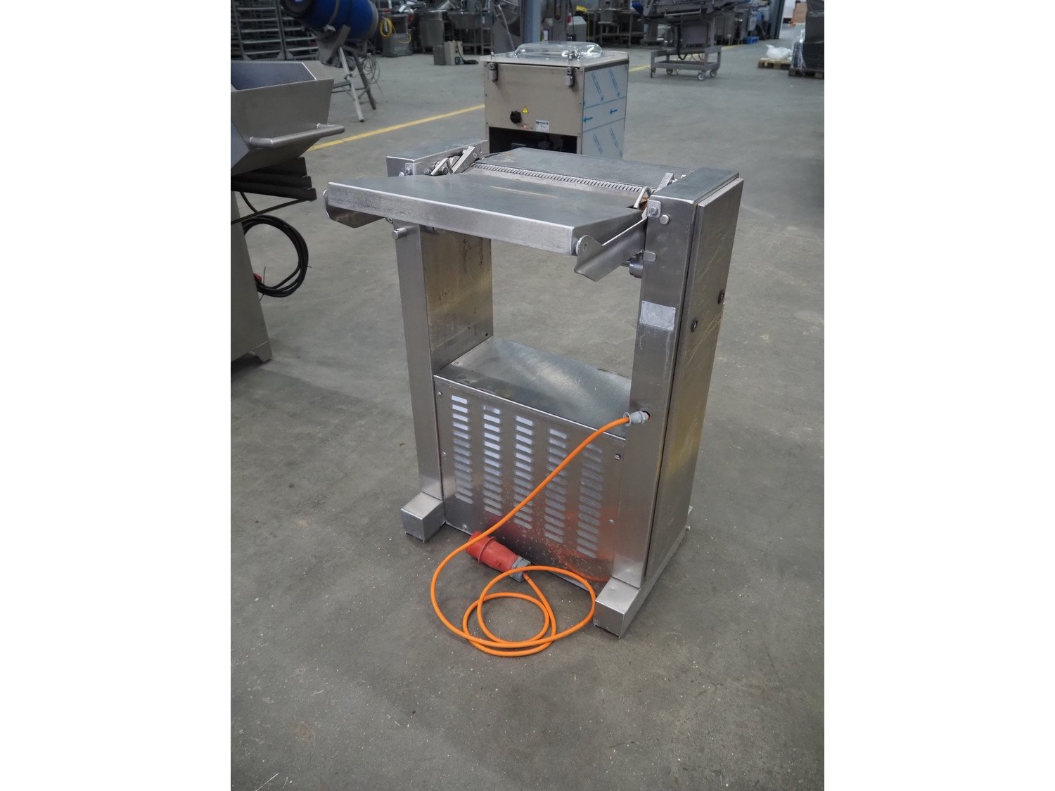 Maja-maschinenfabrik mobile skinning machine, type: AEM 438, year of construction: 1993, 380 V, 3 Ph, 50 Hz, working width: 430 mm, total dimensions: 770 mm x 720 mm x 1000 mm. Kavel locatie: Schouwrooij 29, 5281 RE Boxtel, Nederland