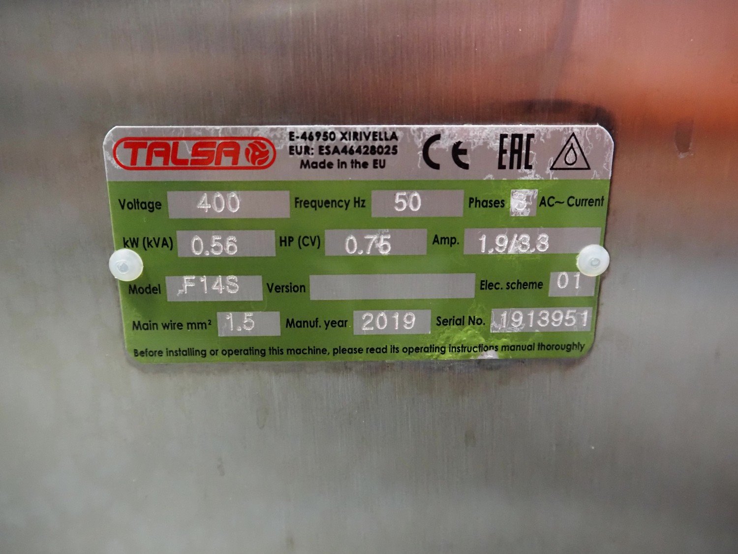 Talsa mobile piston filler, model: F14A, serial number: 1913951, year of construction: 2019, 400 V, 3 Ph, 50 Hz, 1.9/3.3 A, 0.56 kW, dimensions: 800 mm x 800 mm x 1010 mm. Kavel locatie: Schouwrooij 29, 5281 RE Boxtel, Nederland
