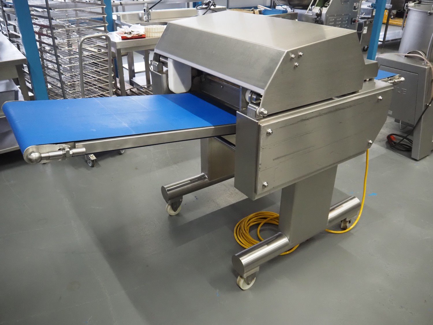 Weber mobile skinning and derinding machine, type: ASB 560, number: 251, year of construction: 2007, 400 V, 50 Hz, 1.1 kW, weight: 400 kg, working width: 550 mm, plastic belt, belt width: 490 mm, total dimensions: 2100 mm x 950 mm x 1250 mm. Kavel locatie: Schouwrooij 29, 5281 RE Boxtel, Nederland