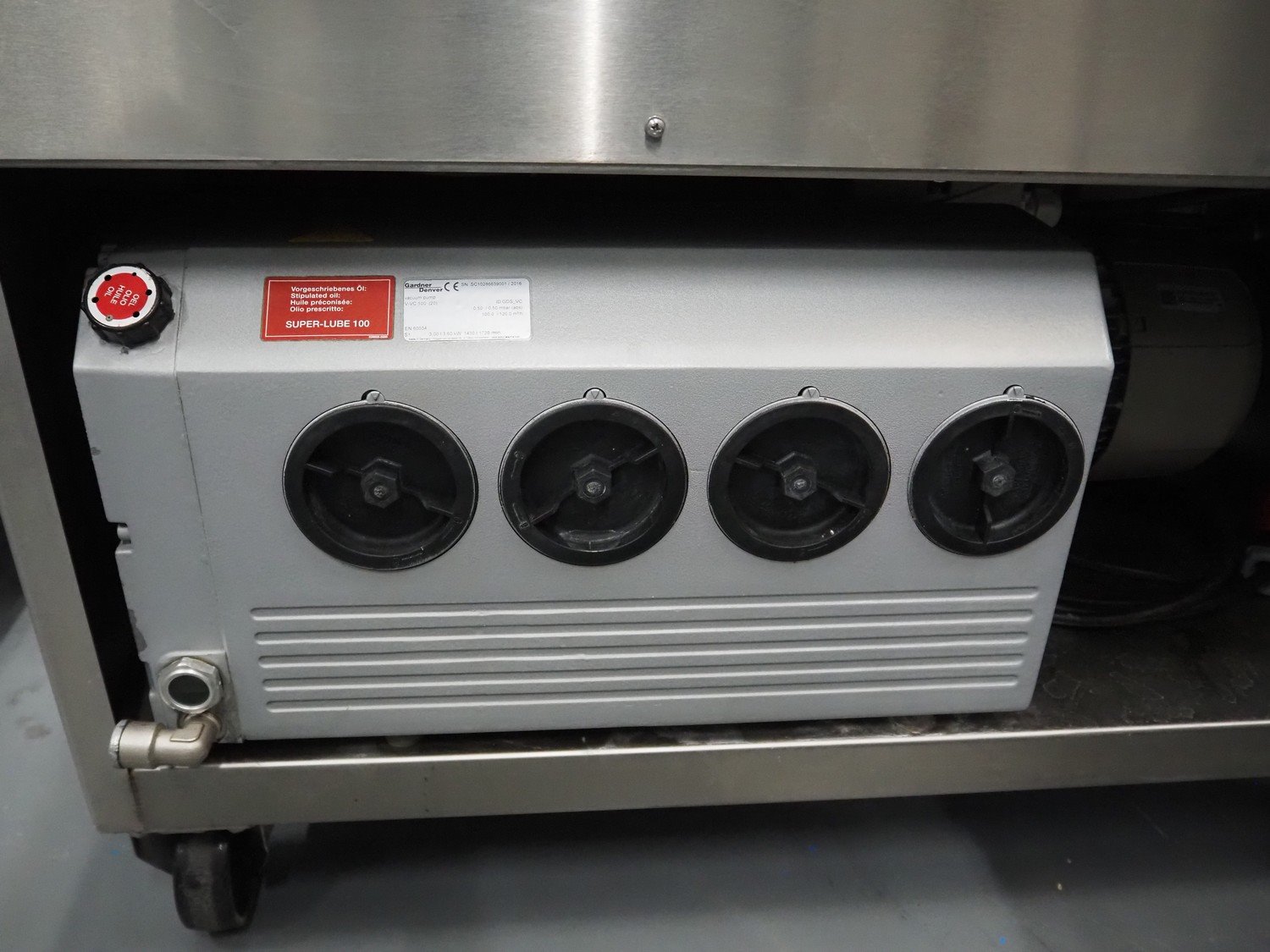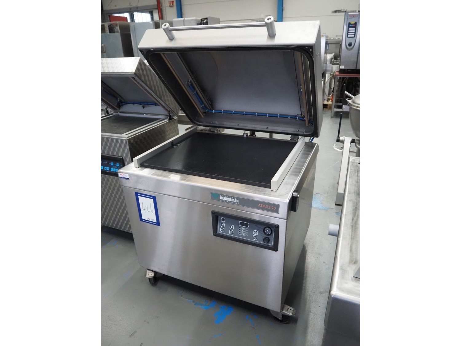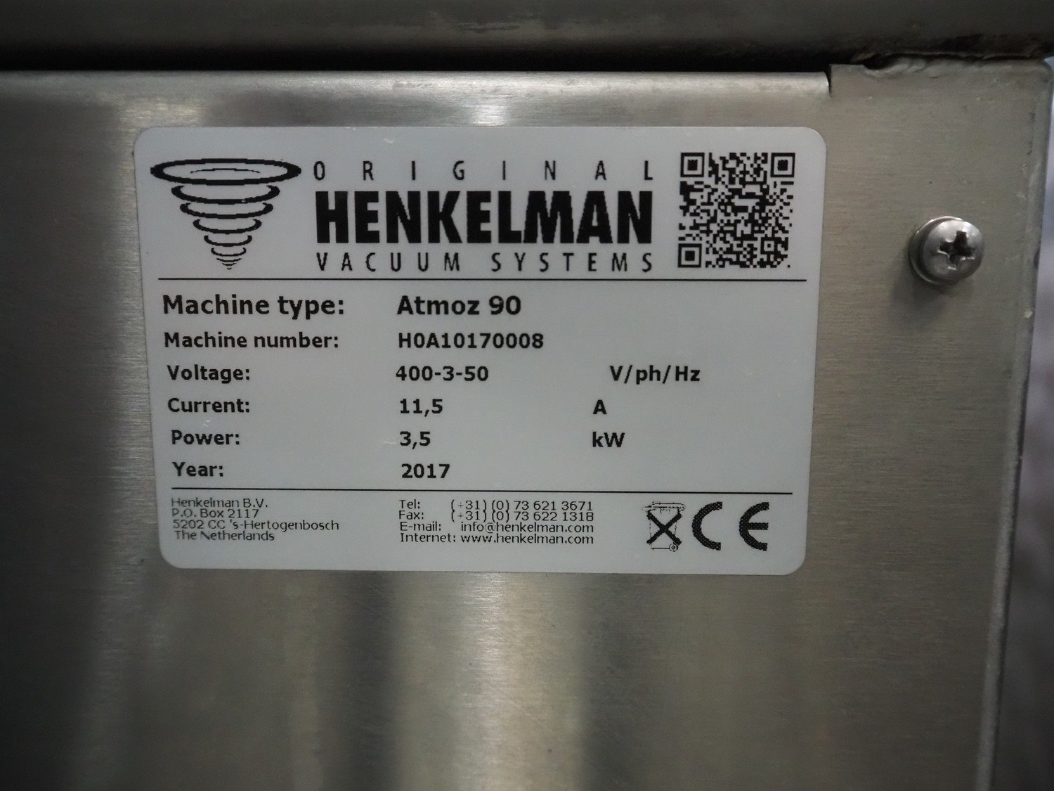 Henkelman mobile vacuum machine, type: Atmoz 90, machine number: H0A10170008, year of construction: 2017, 400 V, 3 Ph, 50 Hz, 11.5 A, 3.5 kW, chamber: 760 mm x 630 mm, seal length: (2x) 685 mm, Gardner Denver vacuum pump, type: V-VC 100 (20), capacity: 100/120 m³ per hour, total dimensions: 1000 mm x 1000 mm x 1120 mm. Kavel locatie: Schouwrooij 29, 5281 RE Boxtel, Nederland