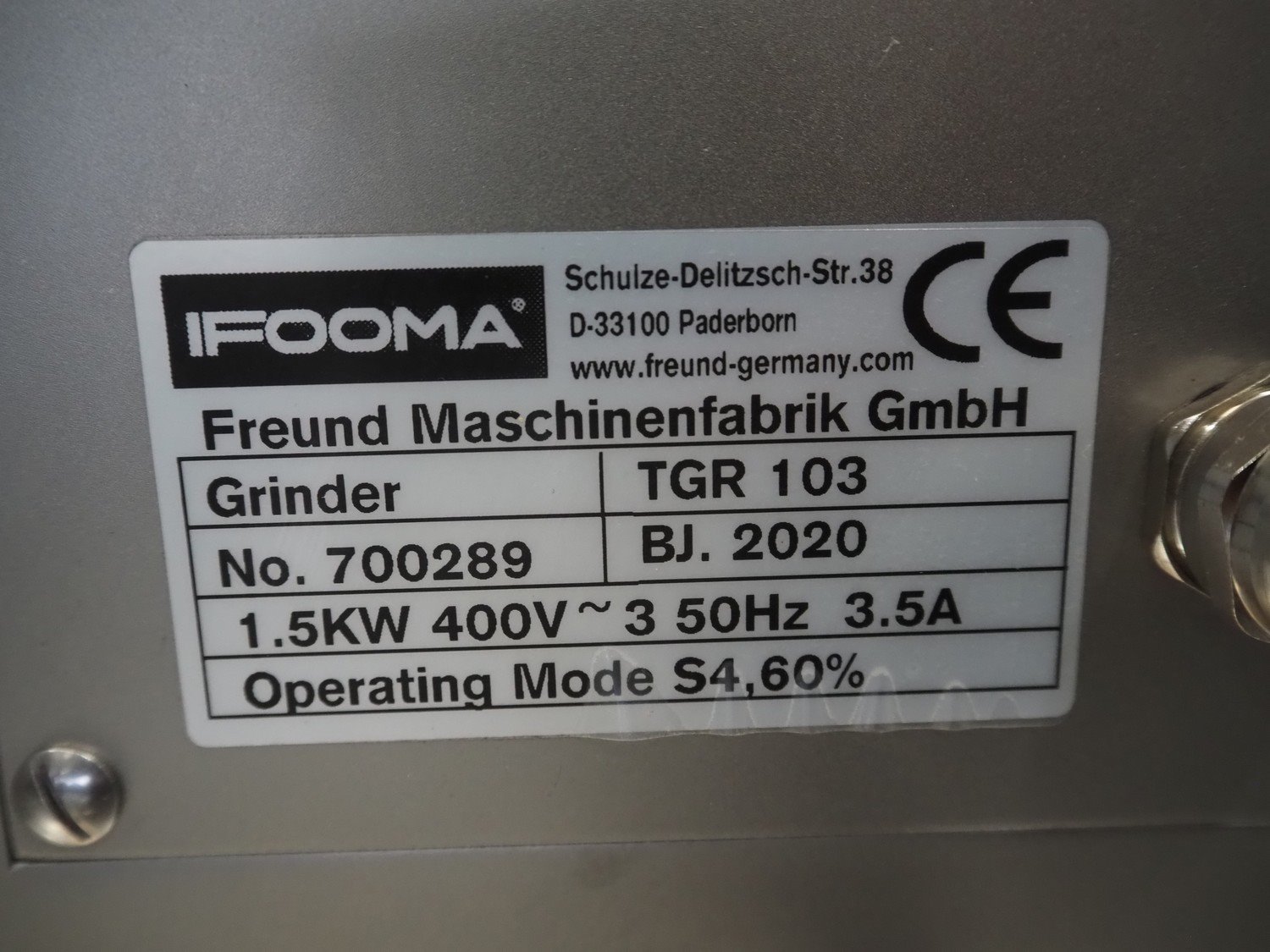 Ifooma / Freund Maschinenfabrik GmbH grinder, type: TGR 103, number: 700289, year of construction: 2020, 400 V, 3 Ph, 50 Hz, 1.5/3.5 kW, diameter plate: 80 mm, total dimensions: 500 mm x 500 mm x 490 mm. Never used. Kavel locatie: Schouwrooij 29, 5281 RE Boxtel, Nederland