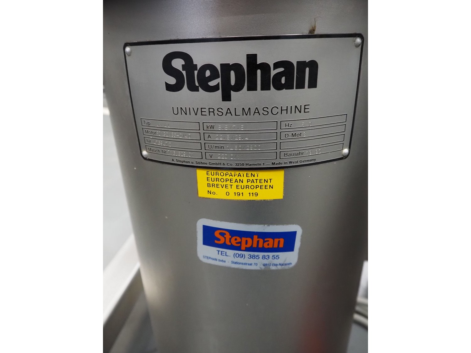 Stephan universal machine, type: UM 44, machine number: 716.629.01, year of construction: 1990, 220 V, 50 Hz, 22.5/29.4 A, 5.5/7.5 kW, volume: 40 liter, dimensions: 800 mm x 540 mm x 1200 mm. Kavel locatie: Schouwrooij 29, 5281 RE Boxtel, Nederland