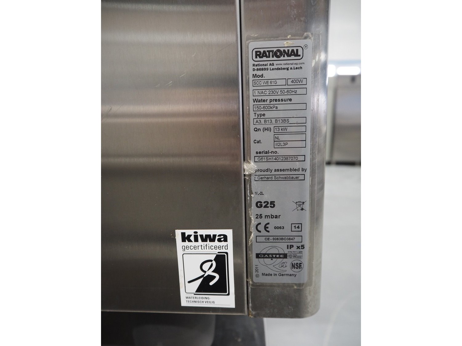 Rational combi steamer, model: SCC WE 61G, serial number: G61SH14012387070, 230 V, 1 Ph, 50-60 Hz, 400 Watt, 13 kW, gas heated, 6 floors, floor dimensions: 340 mm x 530 mm, total dimensions: 850 mm x 900 mm x 1600 mm. Kavel locatie: Schouwrooij 29, 5281 RE Boxtel, Nederland