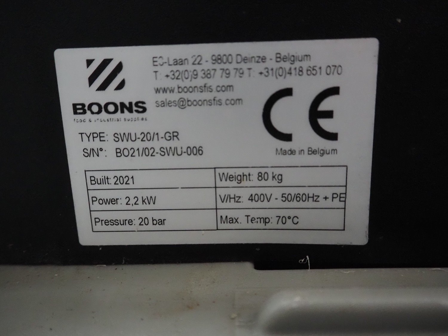 Boons wall-mounted cleaning unit with centrifugal frequency-controlled booster pump and integrated satellite, type: SWU-20/1-GR, serial number: BO21/02-SWU-006, year of construction: 2021, 400 V, 50/60 Hz, 2.2 kW, weight: 80 kg, pressure: 20 bar, maximum temperature: 70°C, dimensions: 520 mm x 900 mm x 550 mm. Kavel locatie: Schouwrooij 29, 5281 RE Boxtel, Nederland