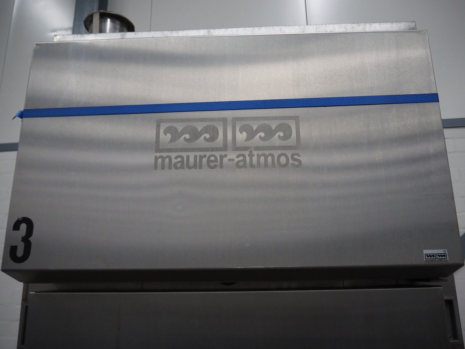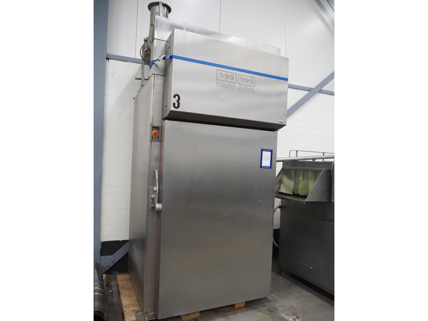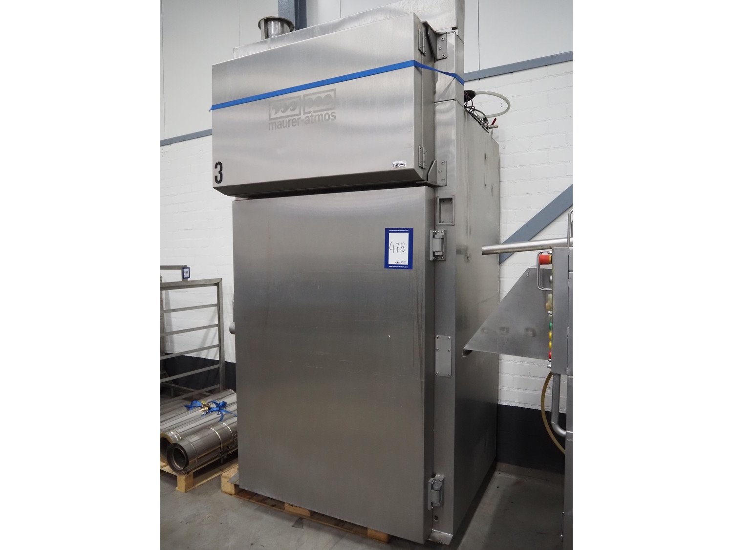 Maurer-Atmos GmbH smoke chamber for 1 smoke rack, dimensions: 1400 mm x 1300 mm x 3000 mm. Including pallet with pipes. Kavel locatie: Schouwrooij 29, 5281 RE Boxtel, Nederland