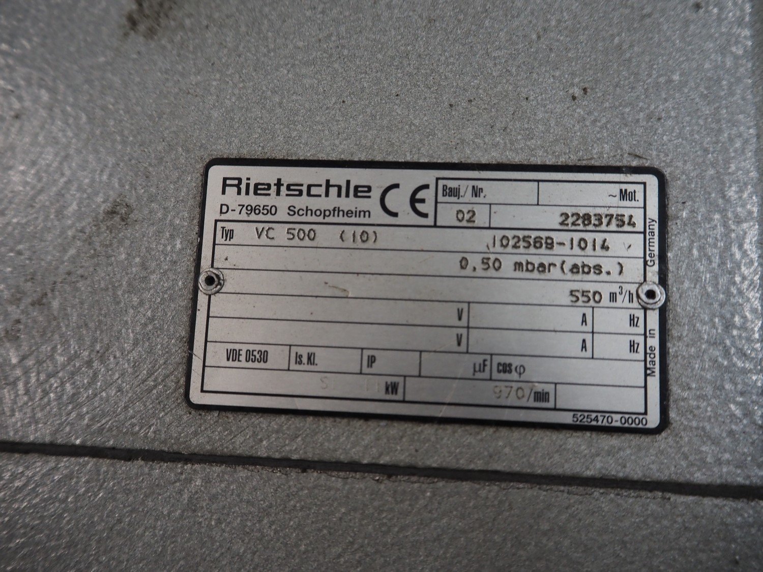 Rietschle vacuum pump, type: VC 500 (10), number: 2283754, year of construction: 2000, capacity: 550 m³ per hour, dimensions: 950 mm x 950 mm 650 mm and 650 mm x 500 mm x 500 mm. Kavel locatie: Schouwrooij 29, 5281 RE Boxtel, Nederland