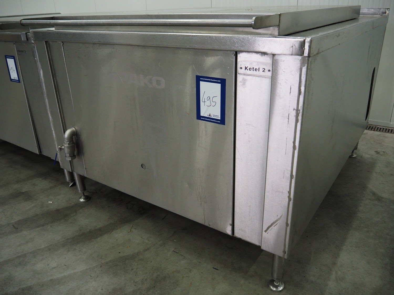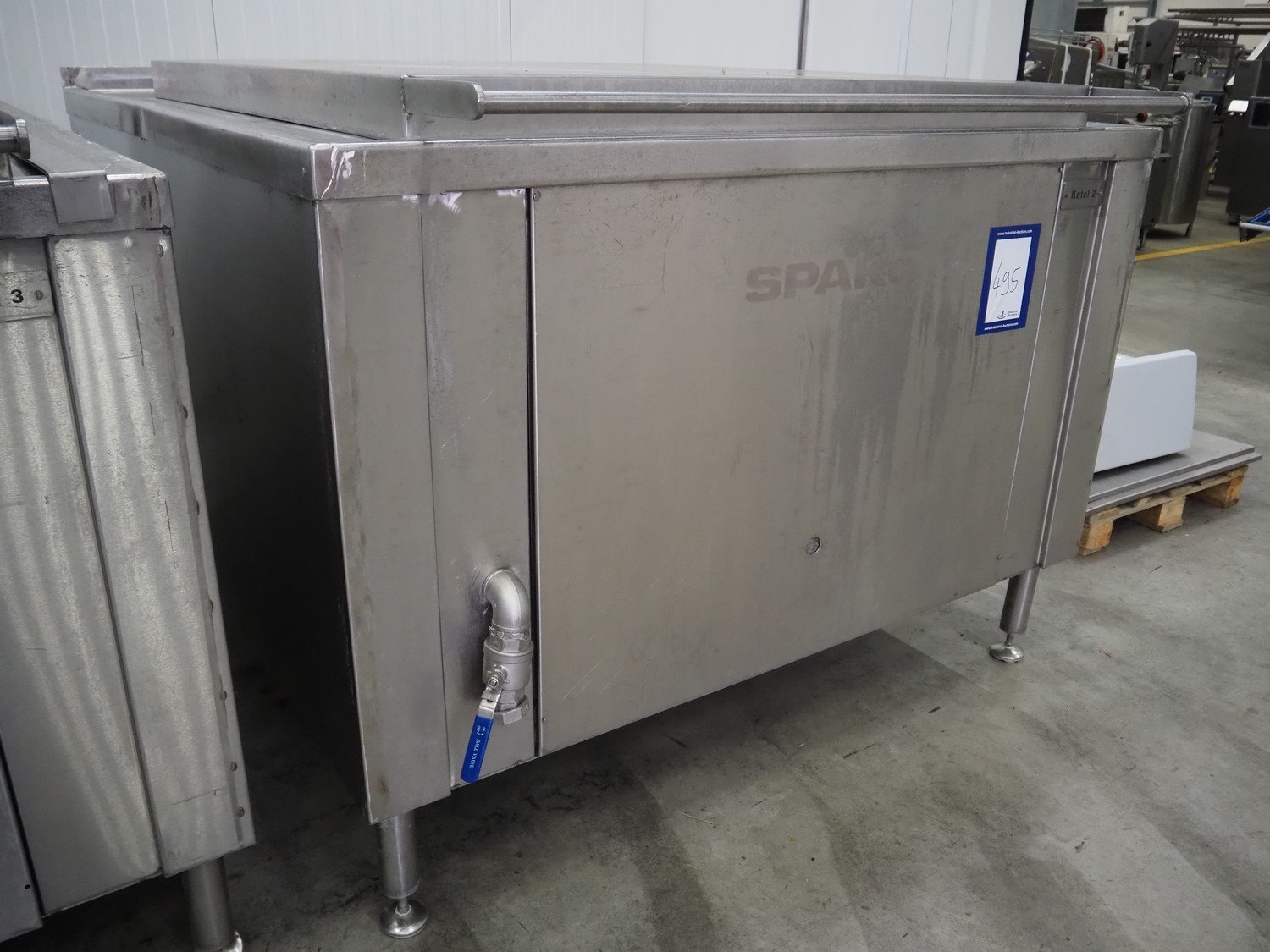Spako cooking vessel, type number: RHU 1100 V, year of construction: 2010, natural gas, 230 V, 50 Hz, 60 W, volume: 1100 liter, dimensions inside: 1400 mm x 1300 mm x 600 mm, total dimensions: 2300 mm x 1670 mm x 1280 mm. Including: Spako parts for cooking vessel, dimensions switch cabinet: 830 mm x 570 mm x 330 mm, dimensions pallet with parts: 3450 mm x 1000 mm x 600 mm. Kavel locatie: Schouwrooij 29, 5281 RE Boxtel, Nederland