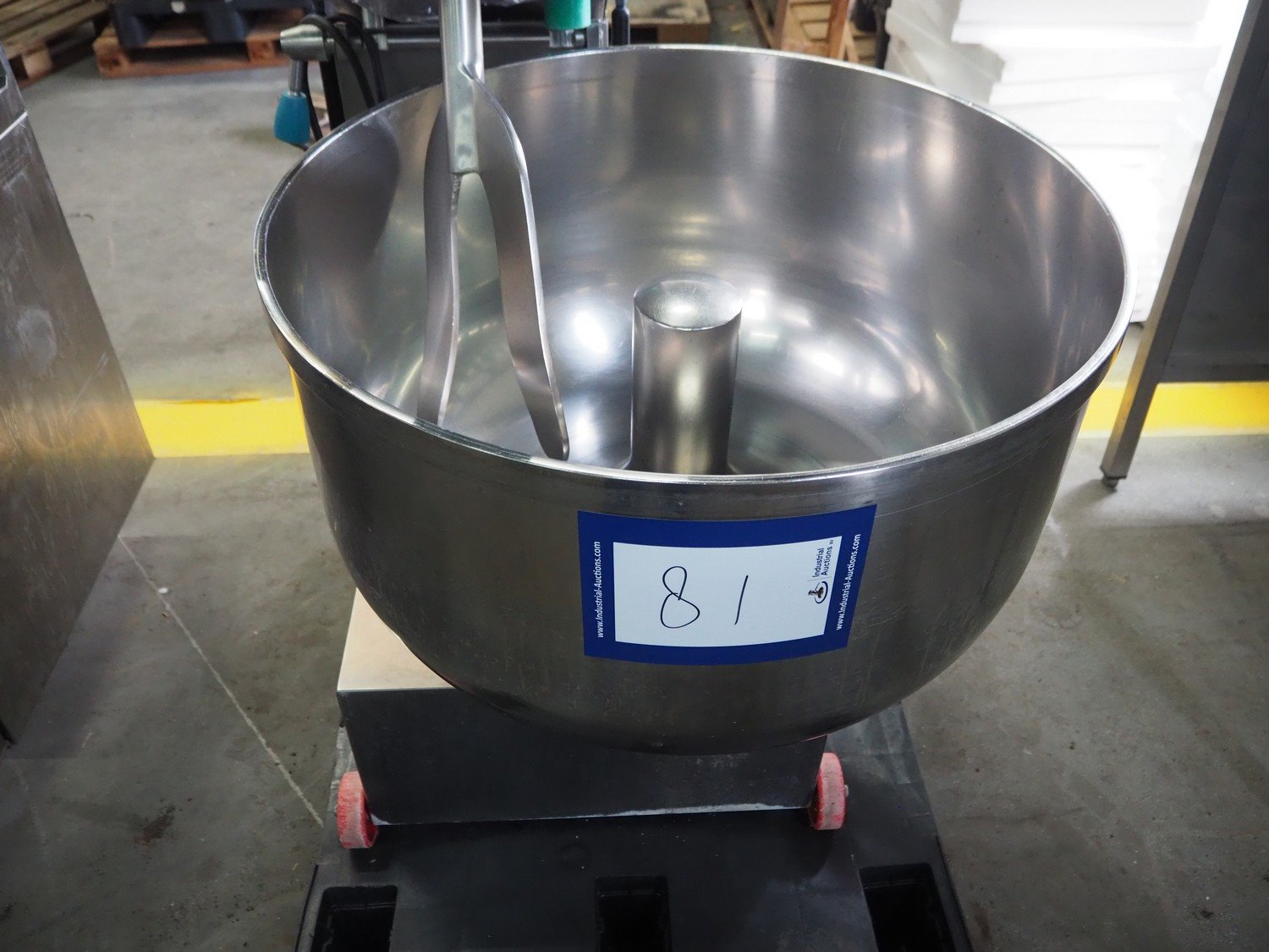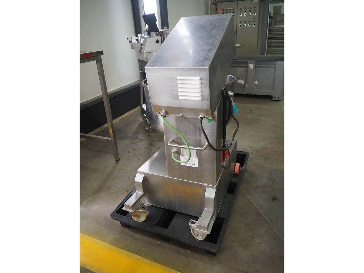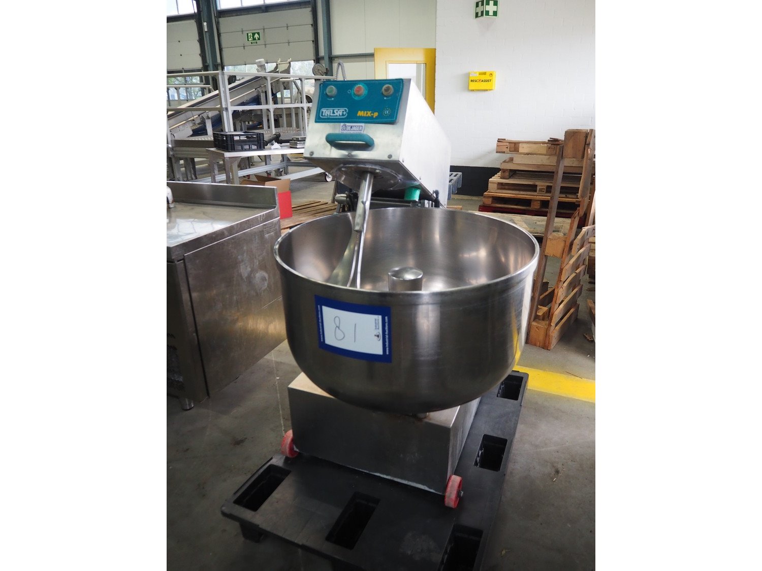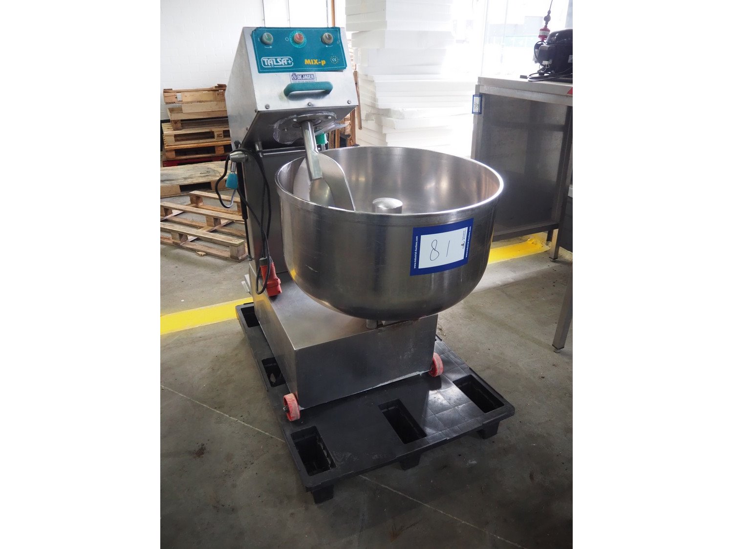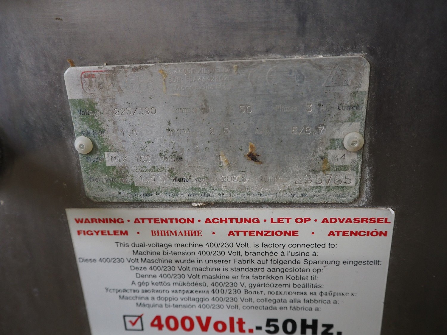 Talsa mobile mixer, model: MIX 150, serial number: 235765, year of construction: 2003, 225/390 V, 3 Ph, 50 Hz, 2.5 A, volume: 150 liter, dimension: 1150 mm x 800 mm x 1300 mm. Lid broken and bowl damaged. Kavel locatie: Schouwrooij 29, 5281 RE Boxtel, Nederland
