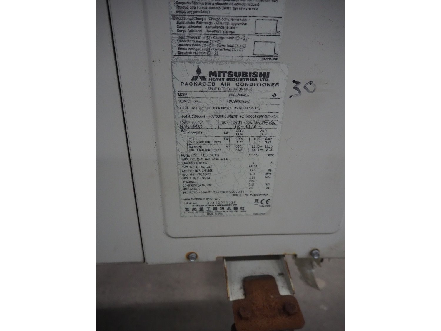 Mitsubishi outside cooling unit, model: FDC280KXE6, serial number: FDC280KXE6/1, refrigerant: R410A, dimensions: 1100 mm x 1500 mm x 2000 mm. Kavel locatie: Schouwrooij 29, 5281 RE Boxtel, Nederland