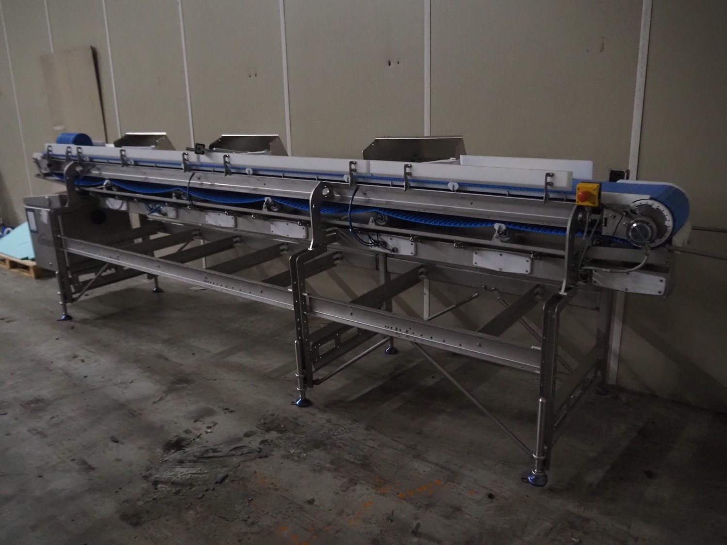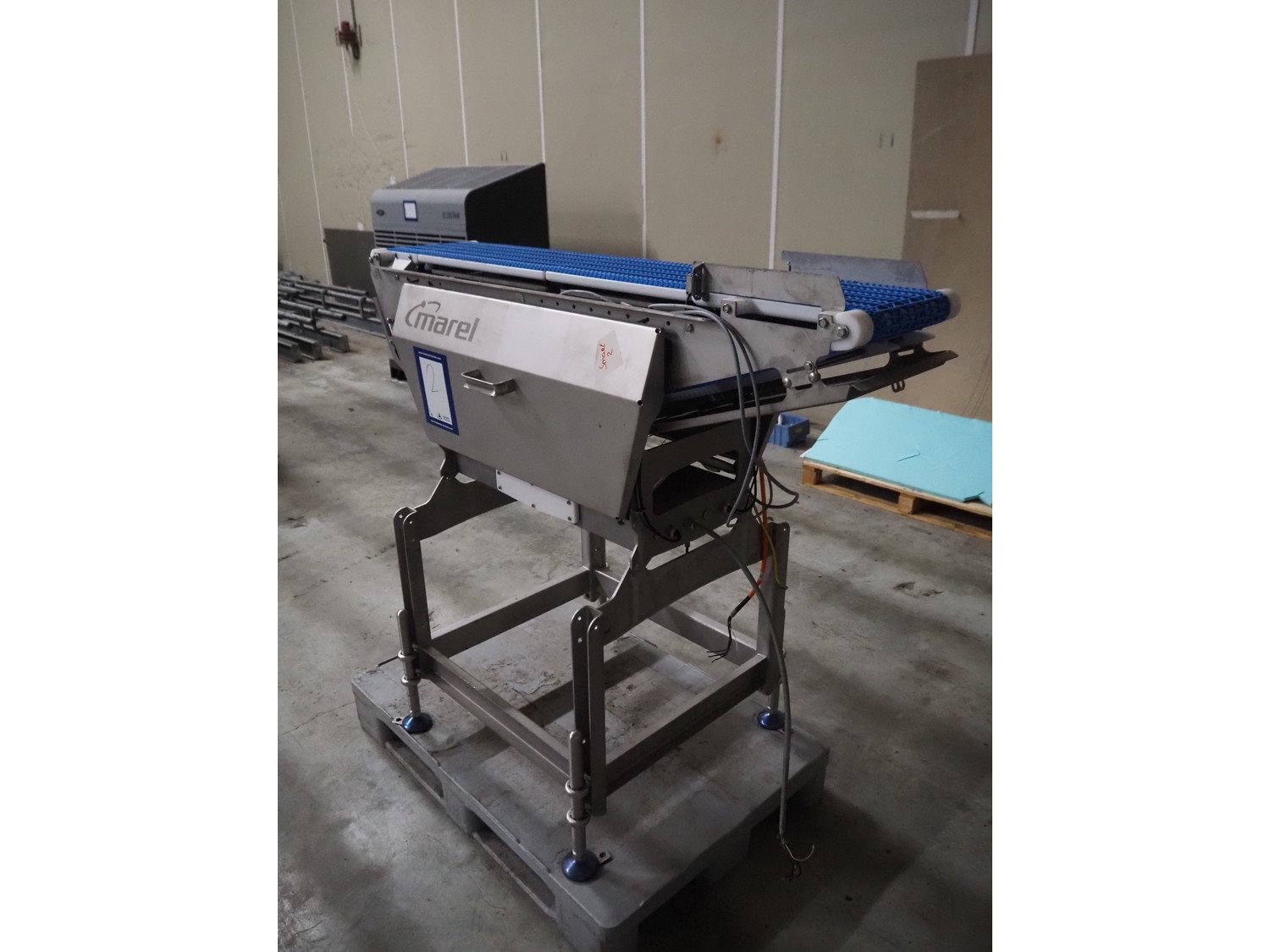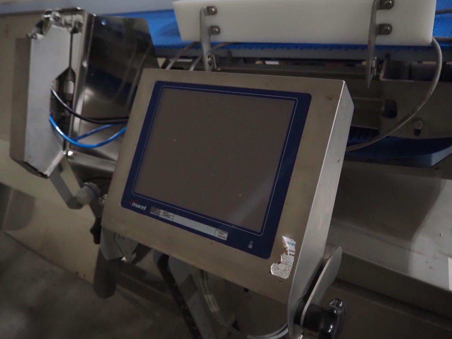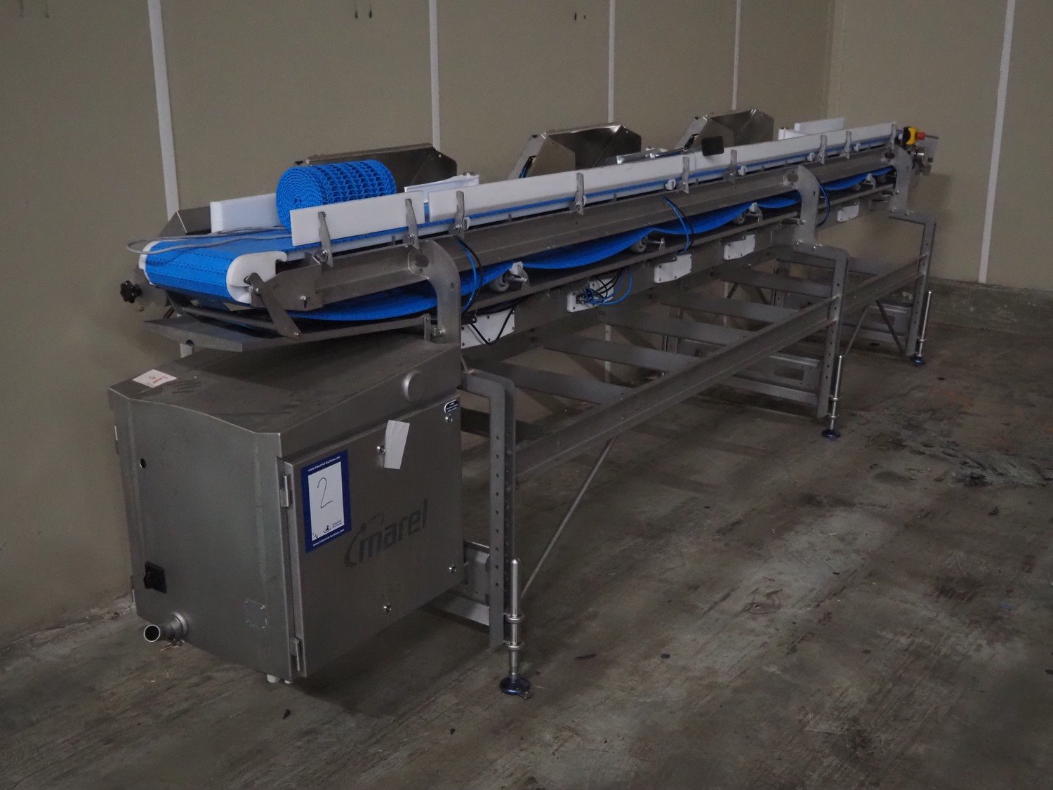 Marel Smartline weighing and sorting line consting of: Marel grader, model: GR8330, type: 2034-10, serial number: 10482612, year of construction: 2021, 230/400 V, 3 Ph, 50/60 Hz, 2.7/1.5 A, belt width: 250 mm, total dimensions: 1400 mm x 750 mm x 1300 mm. grader, plastic belt, belt width: 250 mm, total dimensions: 5000 mm x 1000 mm x 1450 mm, Marel weighing belt, model: GR8220, type: 7684852, year of construction: 2022, plastic mesh belt, belt width: 250 mm, total dimensions: 1500 mm x 800 mm x 1250 mm, Marel infeed belt, model: GR8001, type: 7621272, serial number: 10482510, year of construction: 2021, plastic belt, belt width: 260 mm, total dimensions: 900 mm x 500 mm x 1350 mm, Marel outfeed belt, model: 2.1.43 LAMELLENBAND, type: HM0101, serial number: LF858411, year of construction: 2021, plastic belt, belt width: 300 mm, total dimensions: 1400 mm x 500 mm x 1800 mm. Kavel locatie: Ertveldweg 31, 5231 XA Den Bosch, Nederland