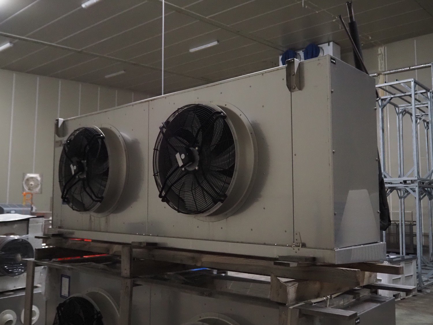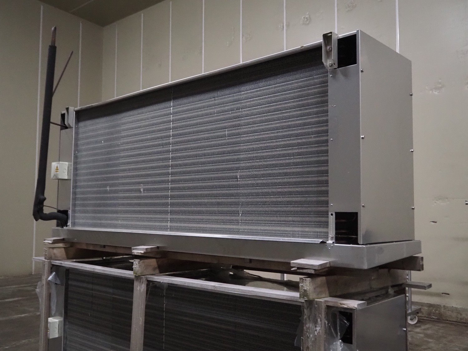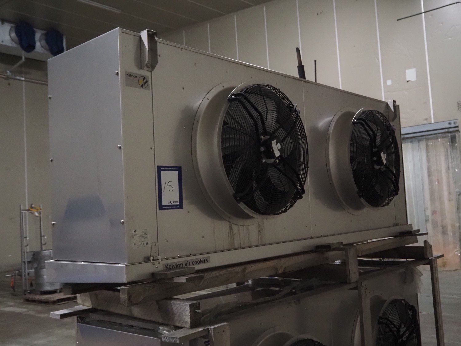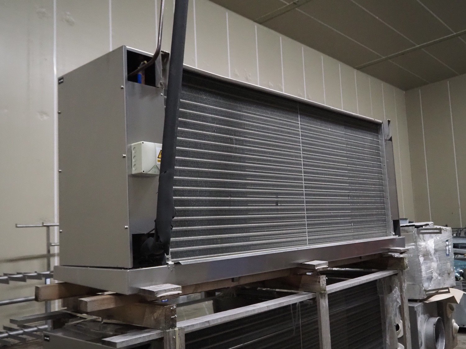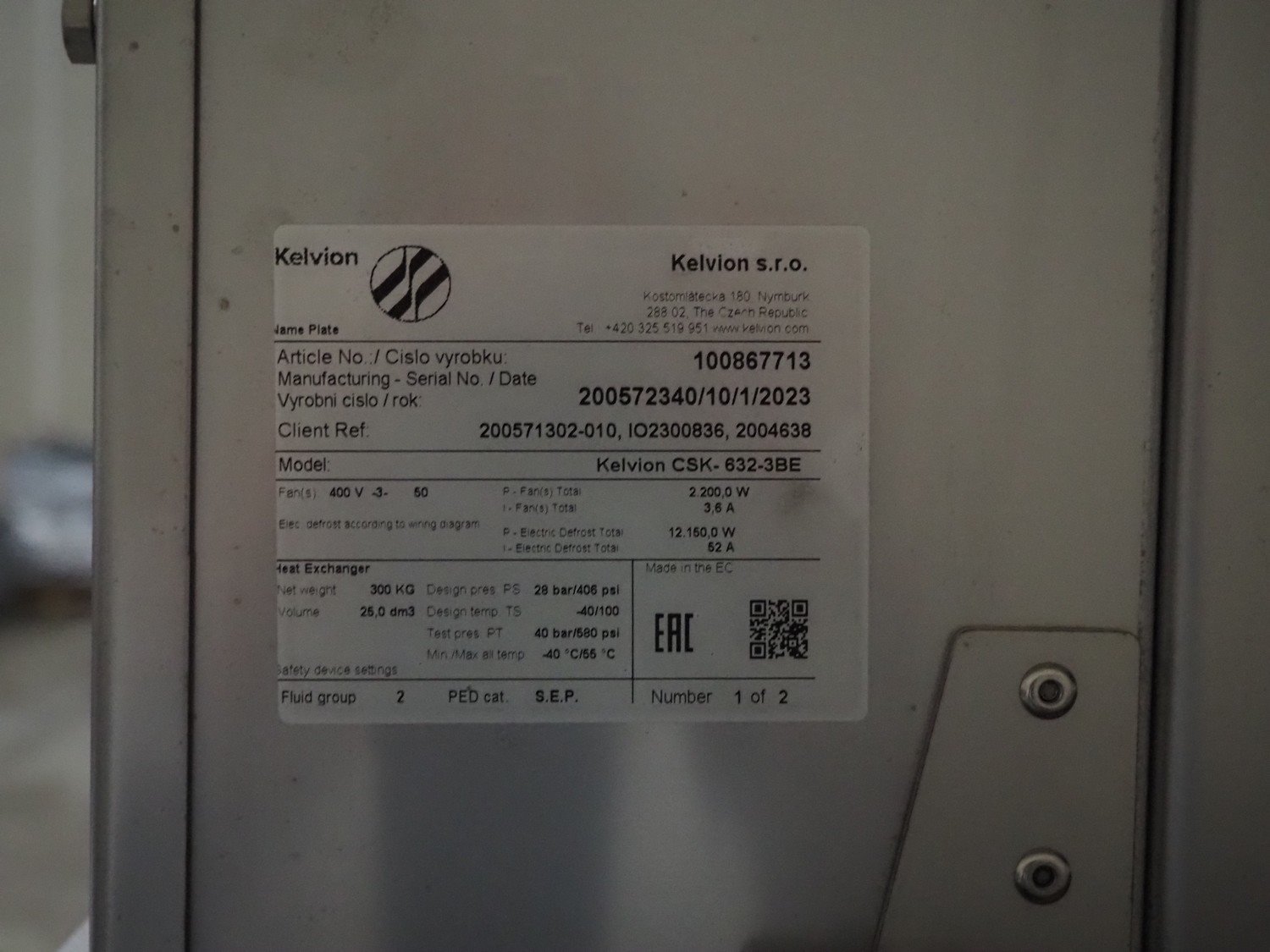 Kelvion evaporator, model: Kelvion CSK-632-3BE, serial number: 200572340/10/1, year of construction: 2023, 400 V, 3 Ph, 50 Hz, 52 A, 12150 W, volume heat exchanger: 25 dm³, 2 fans, dimensions: 2850 mm x 800 mm x 1050 mm. Never used. Kavel locatie: Ertveldweg 31, 5231 XA Den Bosch, Nederland