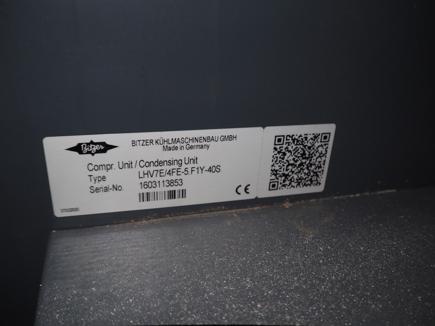 Bitzer Kühlmaschinenbau GmbH condensing unit, type: LHV7E/4FE-5.F1Y-40S, serial number: 1603113853, Bitzer Kühlmaschinenbau GmbH cooling compressor, type: 4FE-5.F1Y-40S, capacity: 18.1/21.8 m³ per hour, dimensions: 1350 mm x 700 mm x 1700 mm. Never used. Kavel locatie: Ertveldweg 31, 5231 XA Den Bosch, Nederland