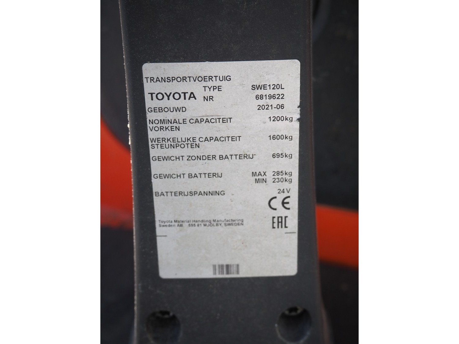 Toyota electric pallet lifter, type: SWE120L, number: 6819622, year of construction: 2021-06, capacity: 1200 kg, fork length: 1150 mm, total dimensions: 1900 mm x 800 mm x 1880 mm. Without charger. Technical condition unknown. Kavel locatie: Ertveldweg 31, 5231 XA Den Bosch, Nederland