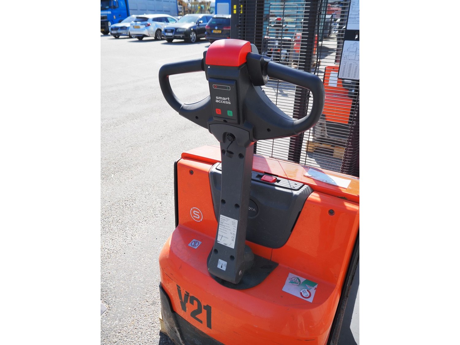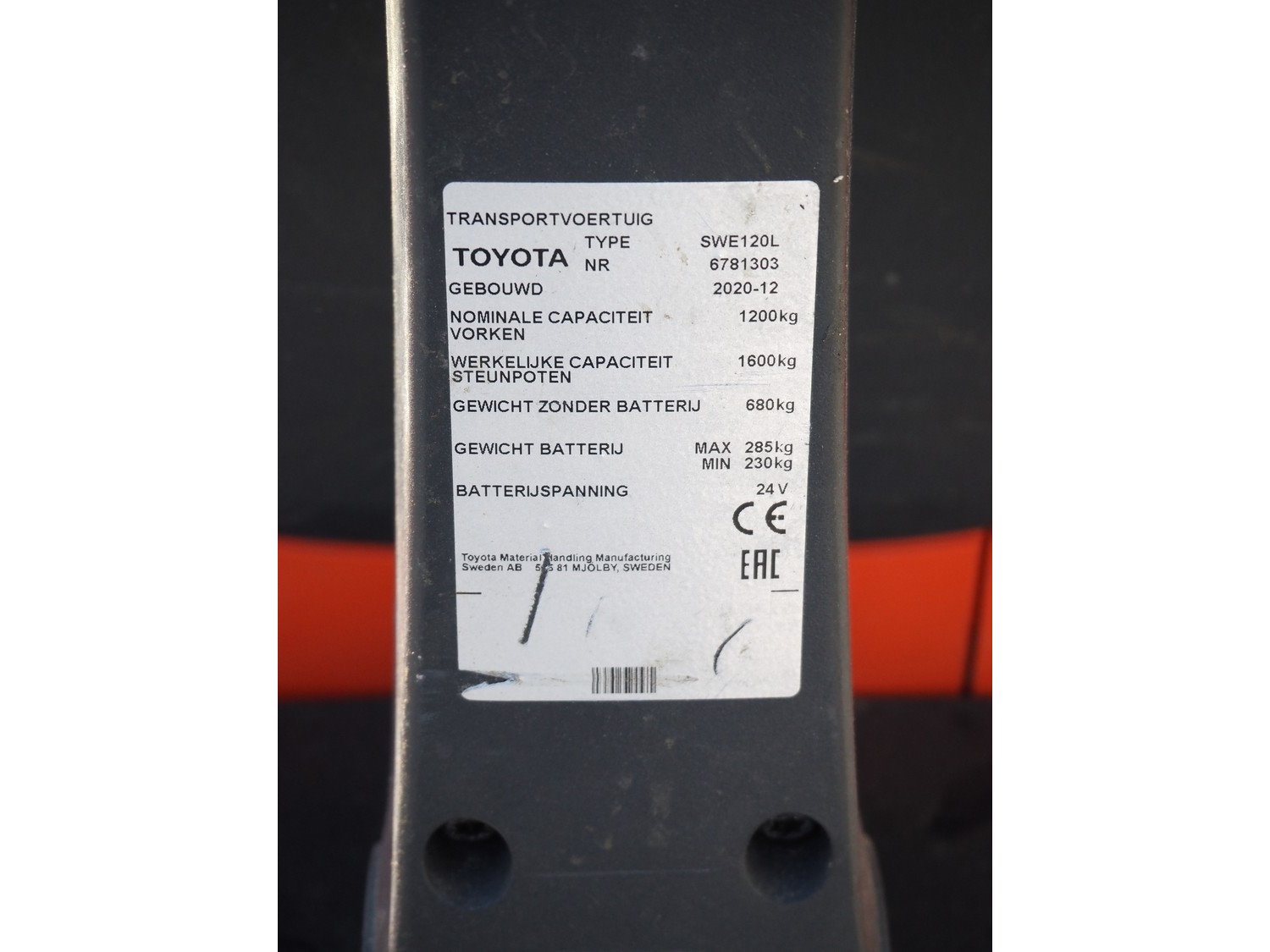 Toyota electric pallet lifter, type: SWE120L, number: 6781303, year of construction: 2020-12, capacity: 1200 kg, fork length: 1000 mm, total dimensions: 1800 mm x 750 mm x 1800 mm. Without charger. Technical condition unknown. Kavel locatie: Ertveldweg 31, 5231 XA Den Bosch, Nederland