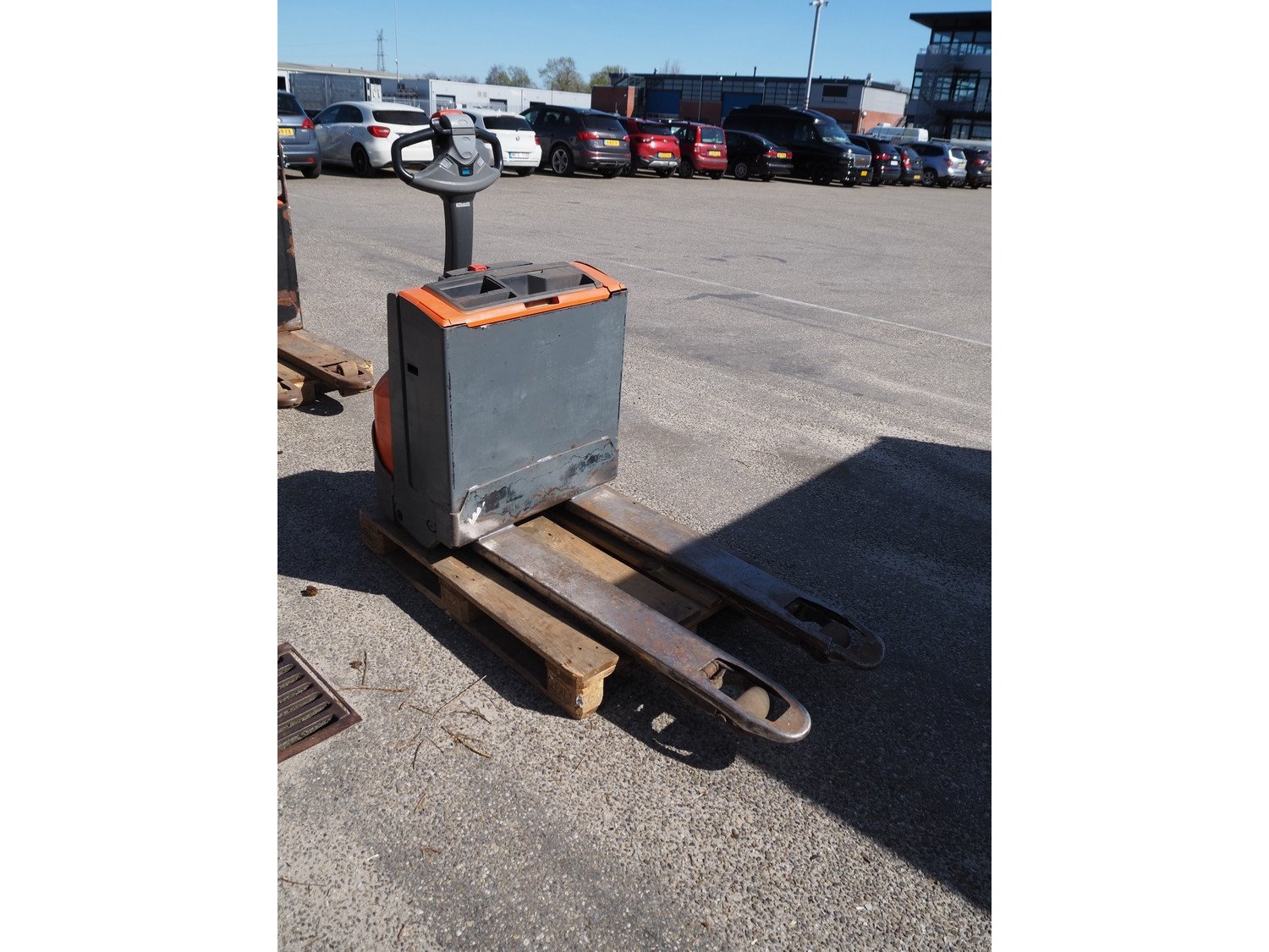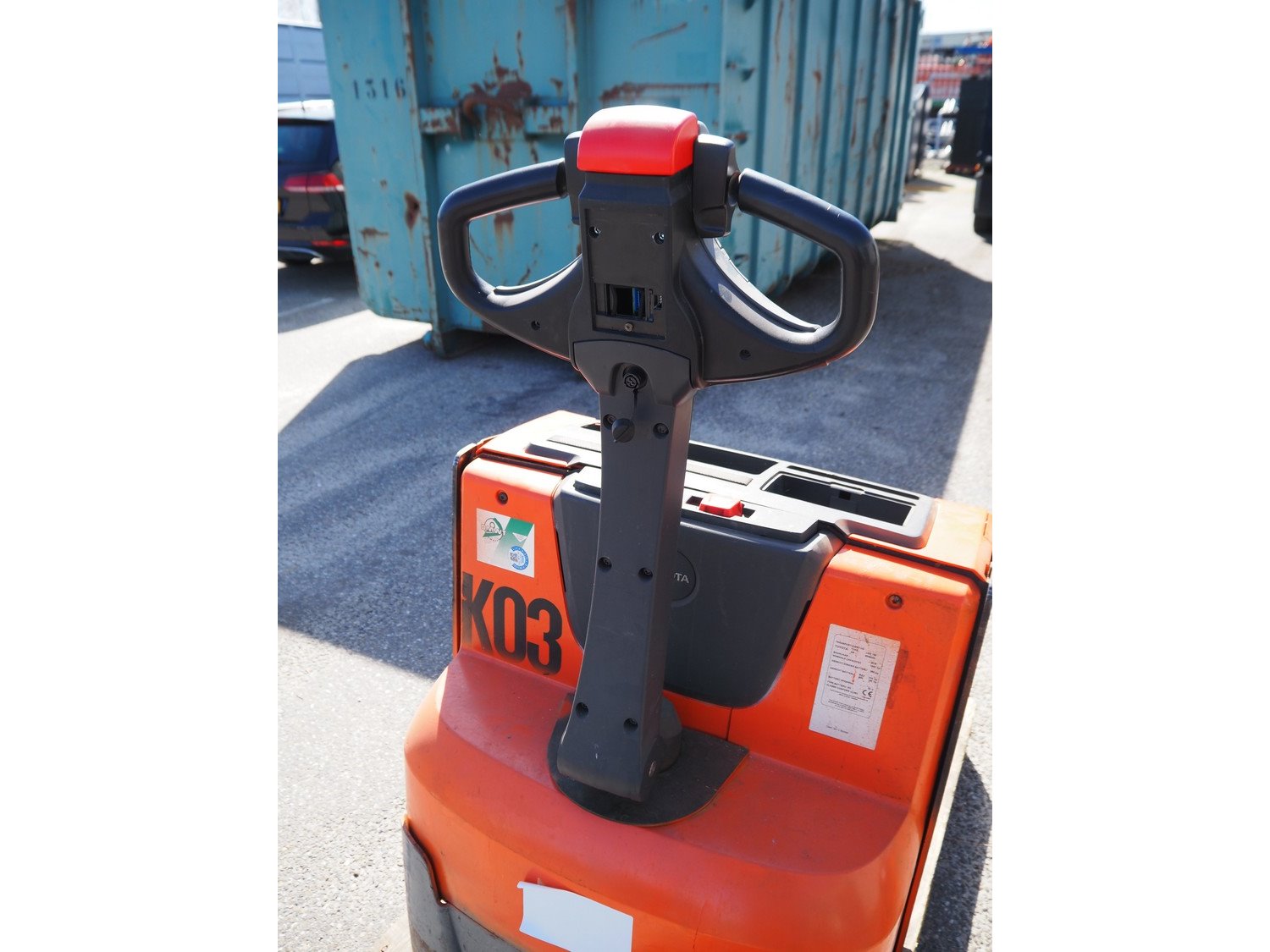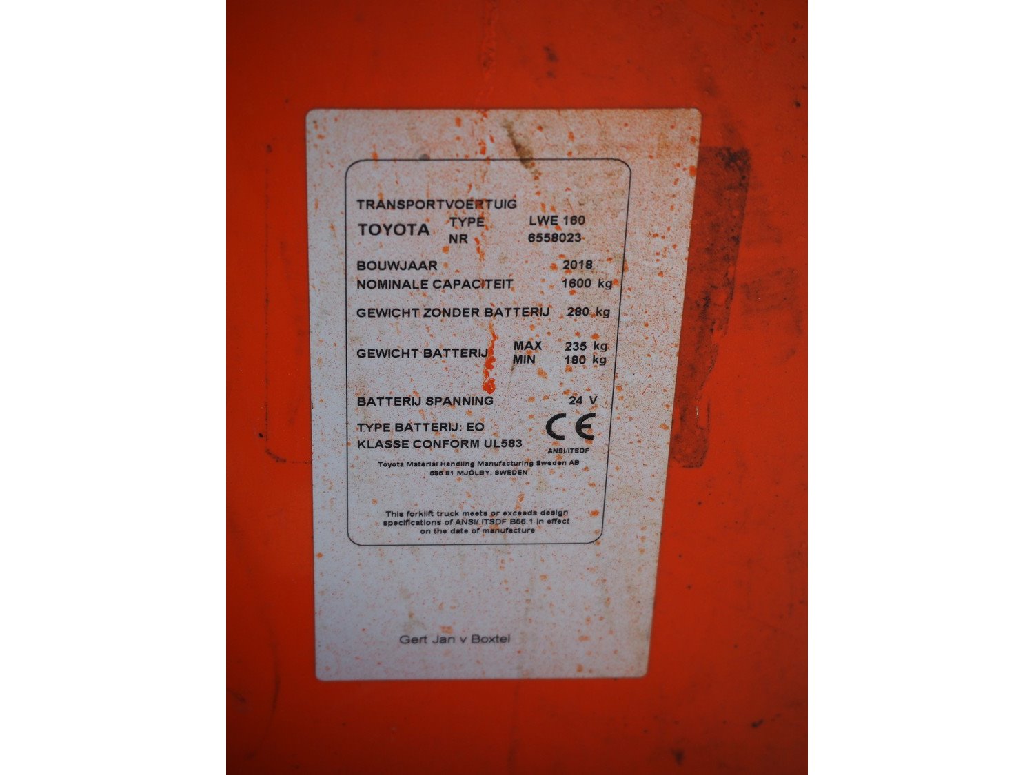 Toyota electric pallet lifter, type: LWE160, number: 6558023, year of construction: 2018, capacity: 1600 kg, fork length: 1100 mm, total dimensions: 1600 mm x 700 mm x 1300 mm. Without charger. Technical condition unknown. Kavel locatie: Ertveldweg 31, 5231 XA Den Bosch, Nederland