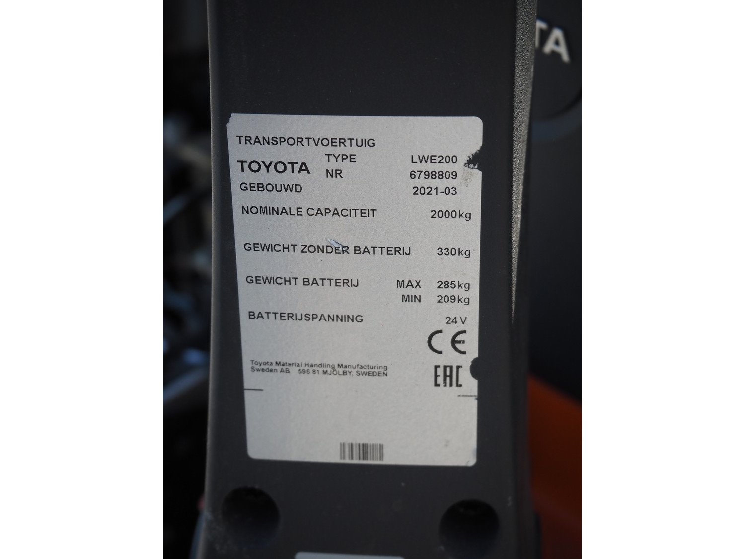 Toyota electric pallet lifter, type: LWE200, number: 6798809, year of construction: 2021-03, capacity: 2000 kg, fork length: 1000 mm, total dimensions: 1550 mm x 750 mm x 1550 mm. Without charger. Technical condition unknown. Kavel locatie: Ertveldweg 31, 5231 XA Den Bosch, Nederland