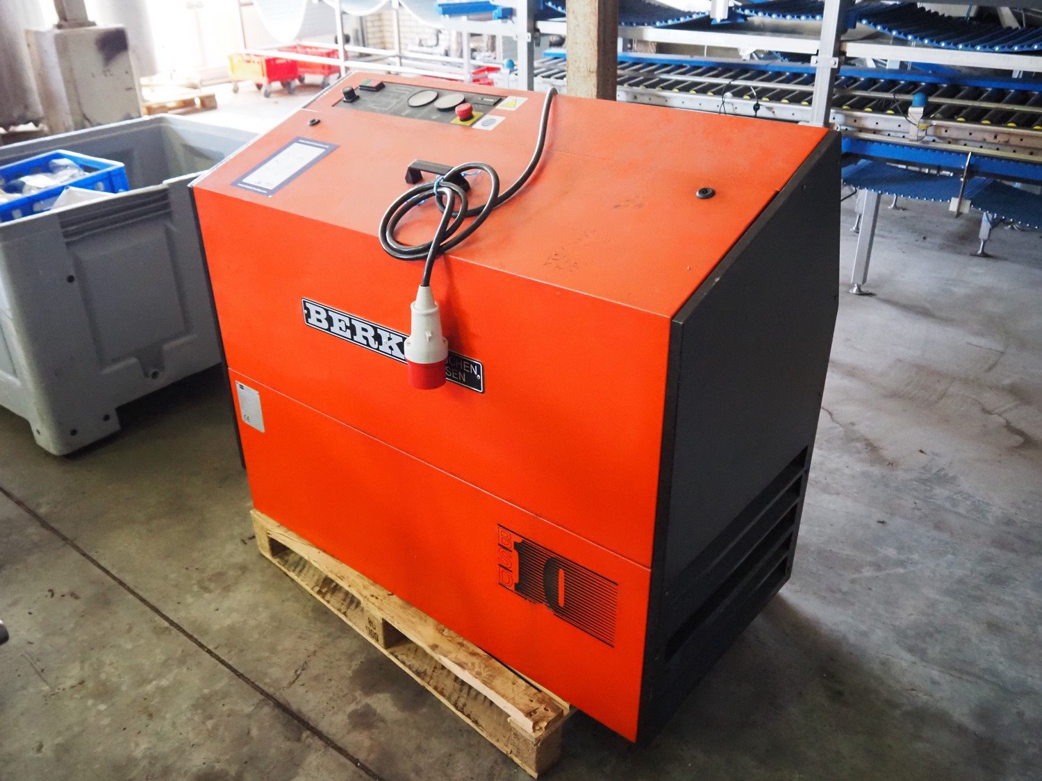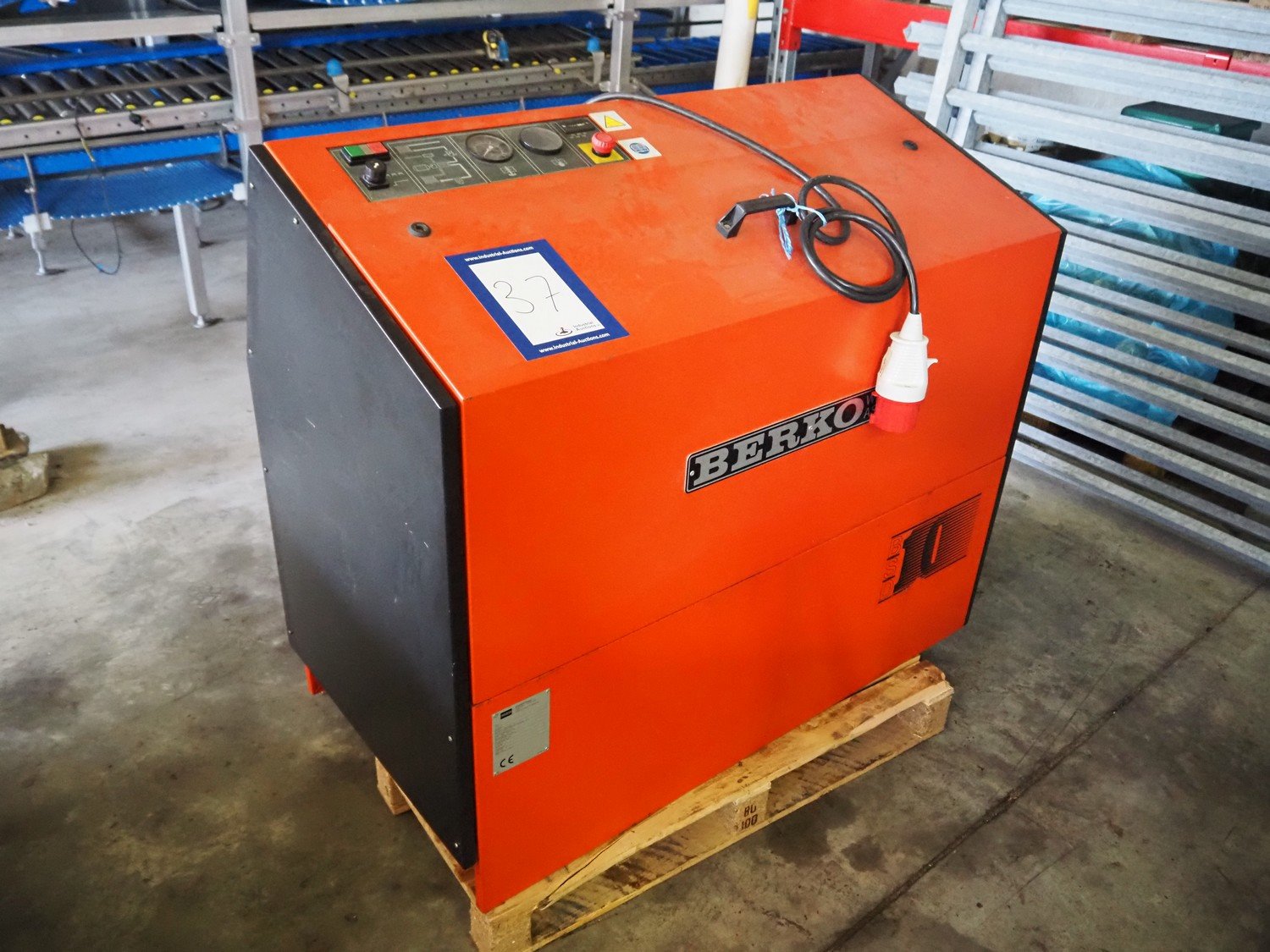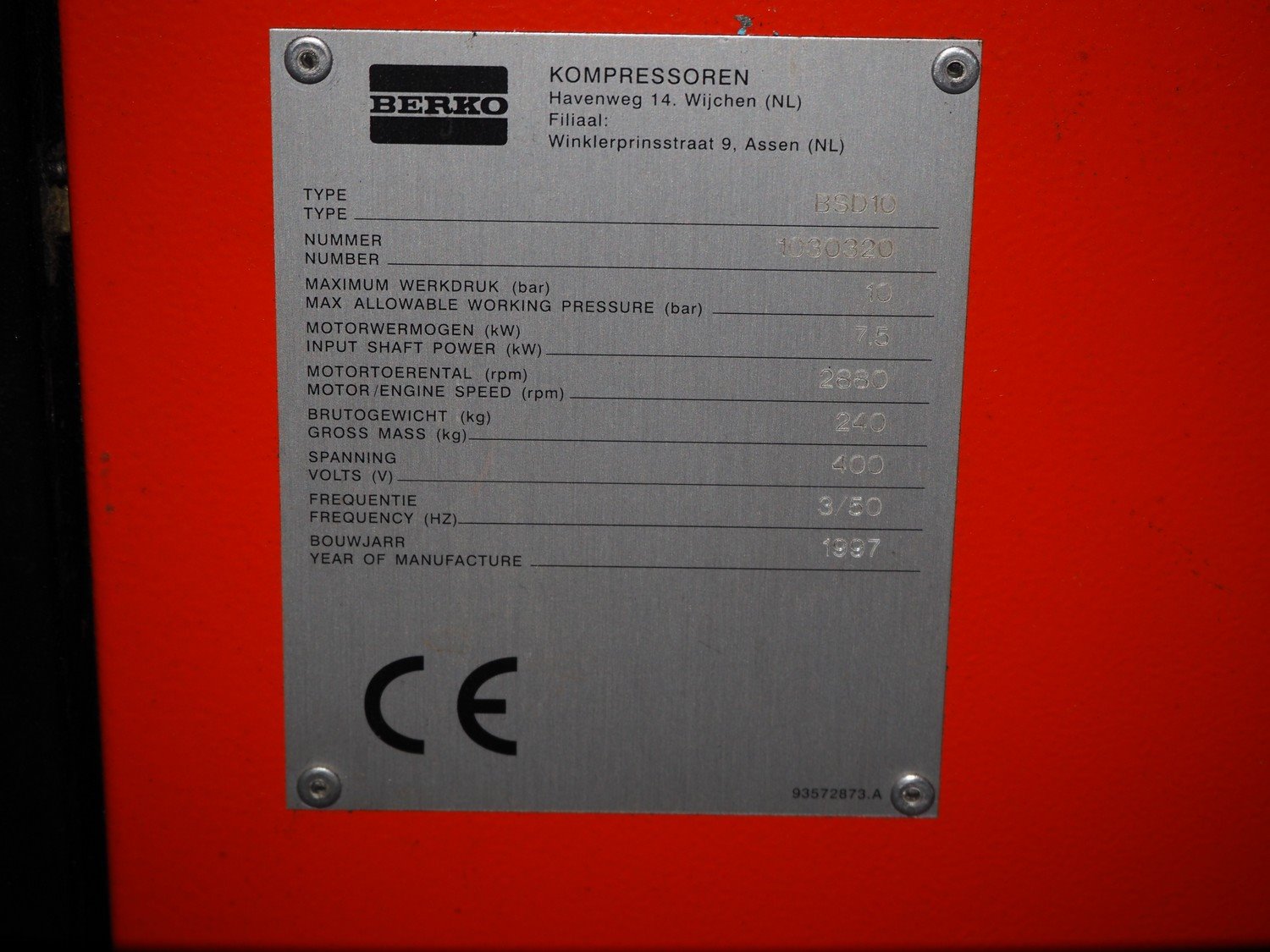 Berko screw compressor, type: BSD10, number: 1030320, year of construction: 1997, 400 V, 3 Ph, 50 Hz, 7.5 kW, dimensions: 1200 mm x 600 mm x 850 mm. Kavel locatie: Ertveldweg 31, 5231 XA Den Bosch, Nederland