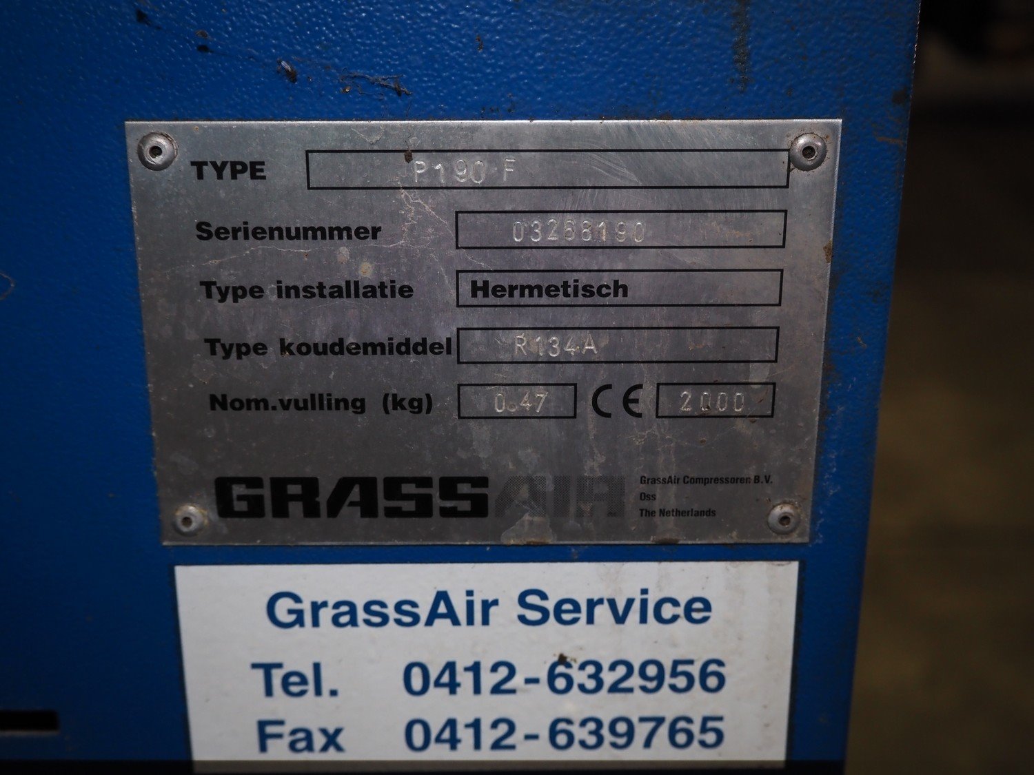 GrassAir Compressoren B.V. air compressor with air dryer, type compressor: S37.7, serial number: 370704970596, year of construction: 1998, 400 V, 3 Ph, 50 Hz, 15 kW, dimensions: 600 mm x 700 mm x 1250 mm, type air dryer: P190F, serial number: 03268190, year of construction: 2000, refrigerant: R134A, dimensions: 660 mm x 540 mm x 630 mm. Kavel locatie: Ertveldweg 31, 5231 XA Den Bosch, Nederland