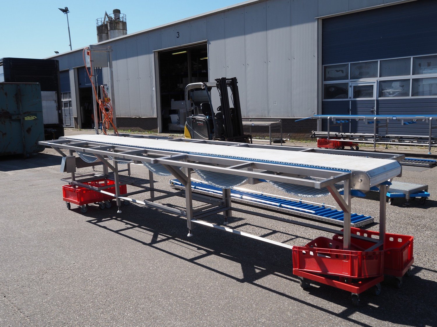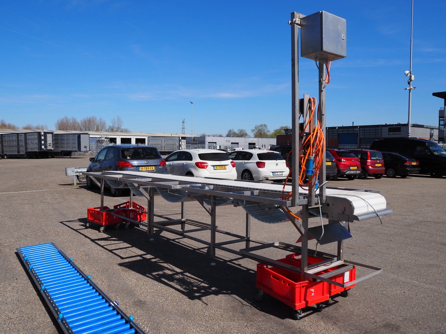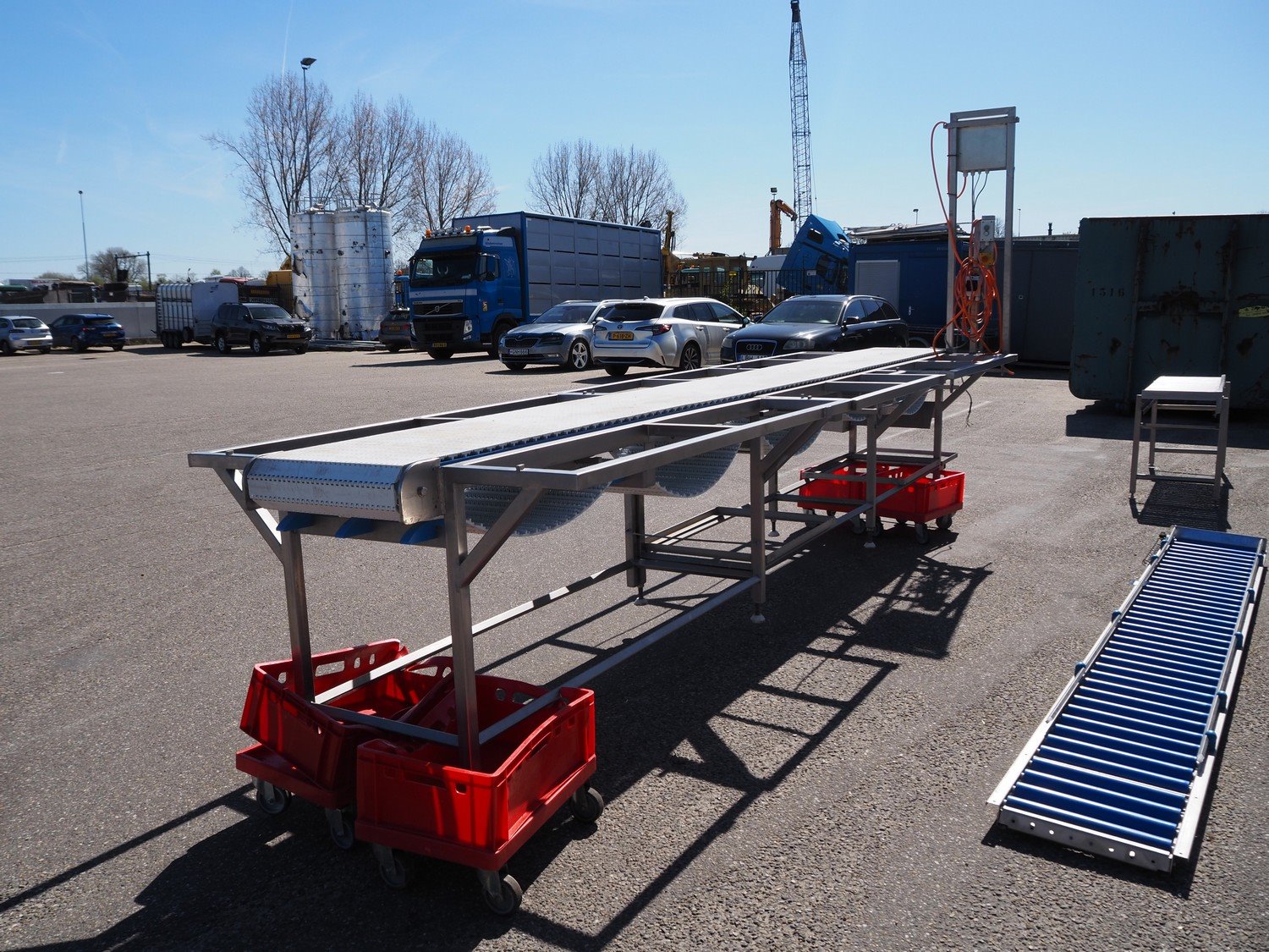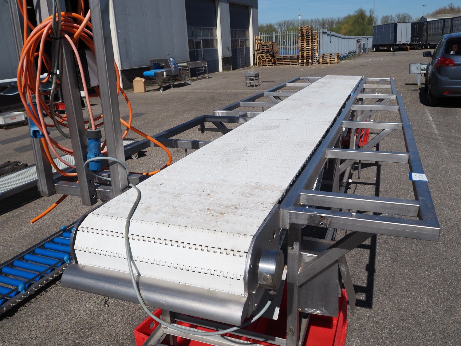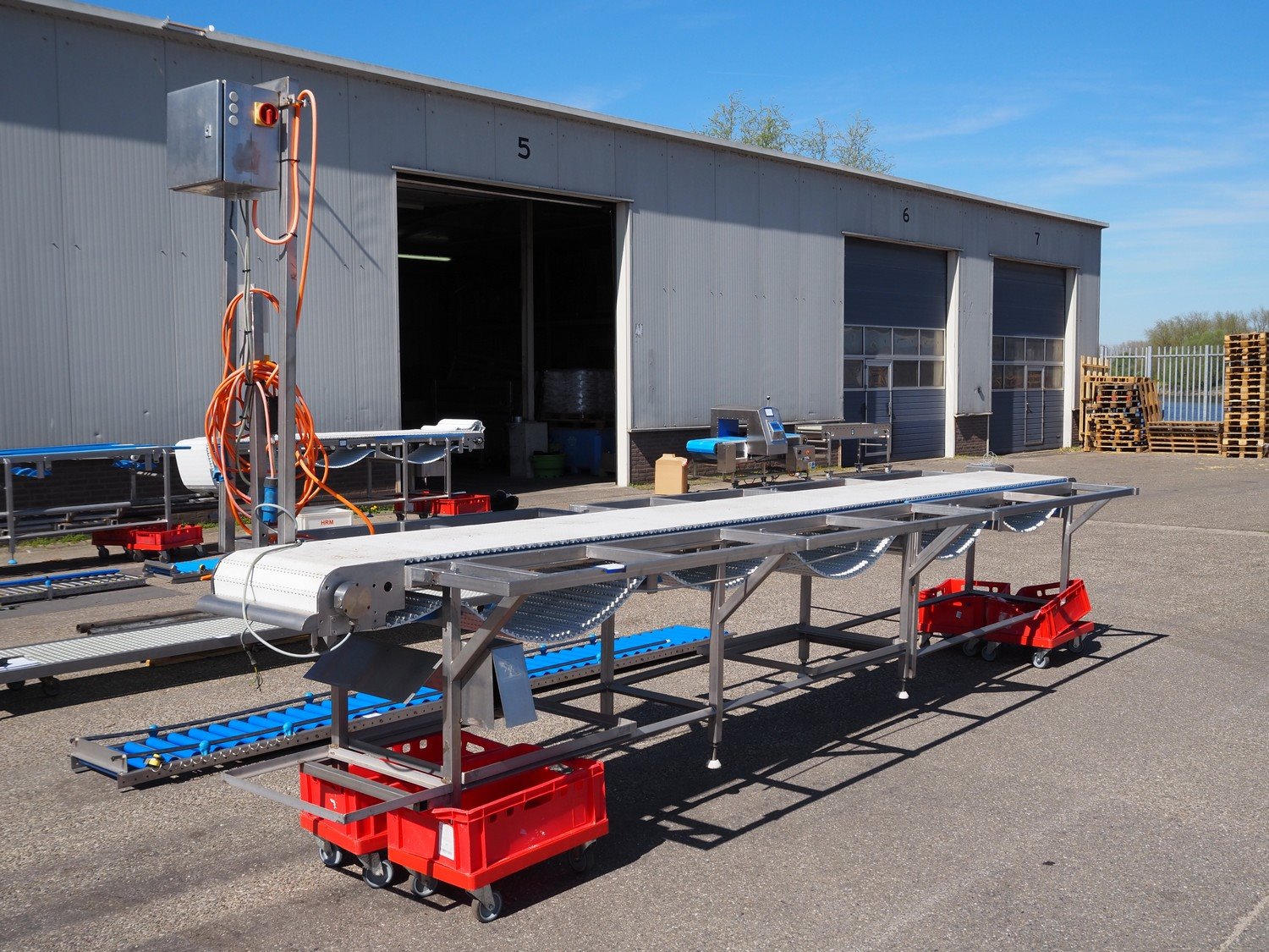 Deboning belt, s/s frame, plastic belt, belt width: 500 mm, total dimensions: 5400 mm x 1400 mm x 2550 mm. Missing cutting plates. Kavel locatie: Ertveldweg 31, 5231 XA Den Bosch, Nederland