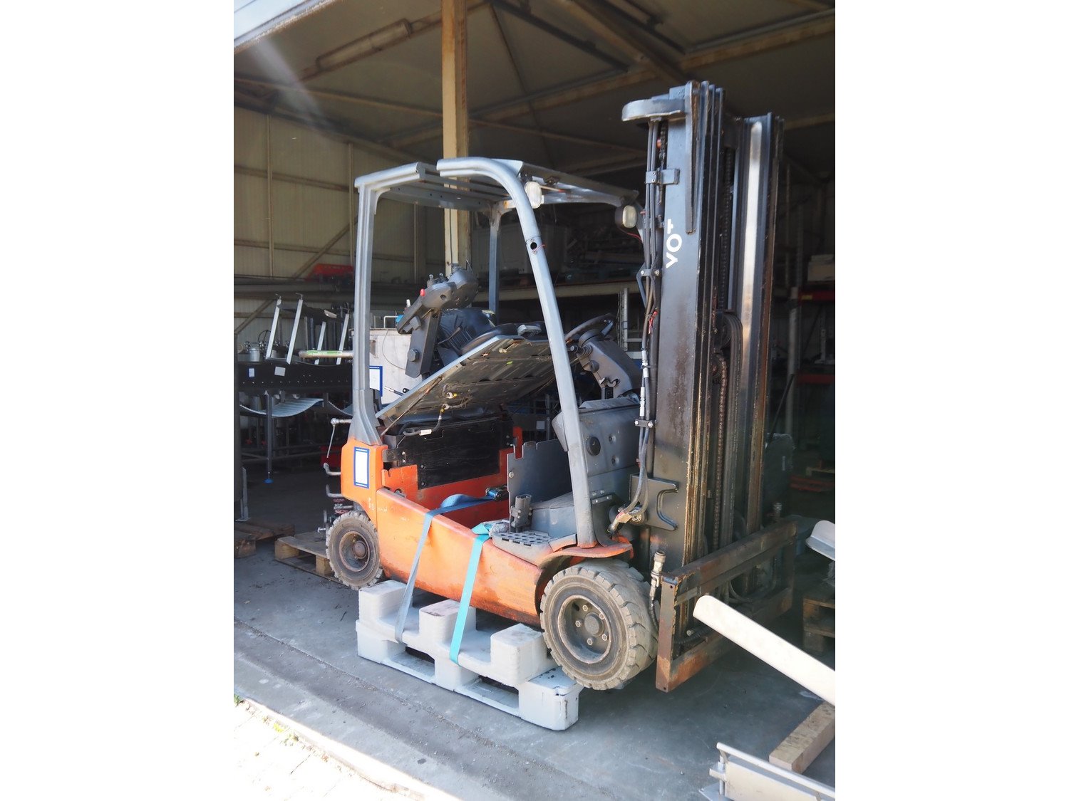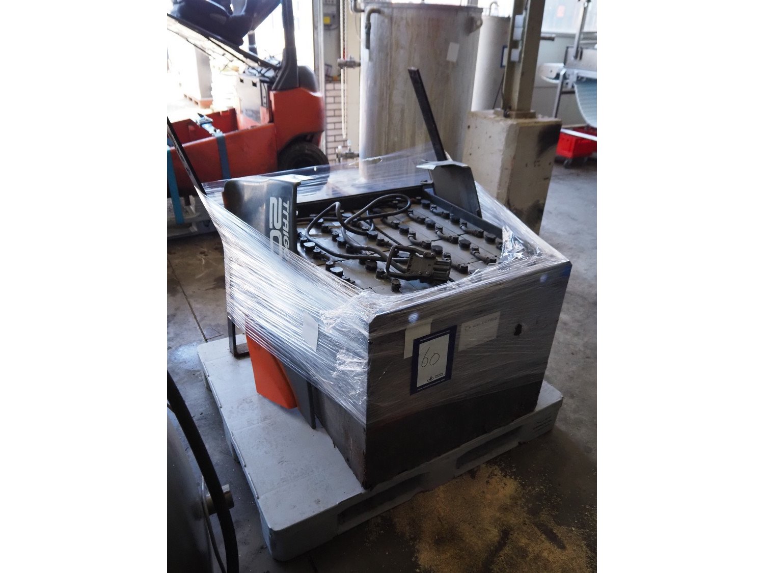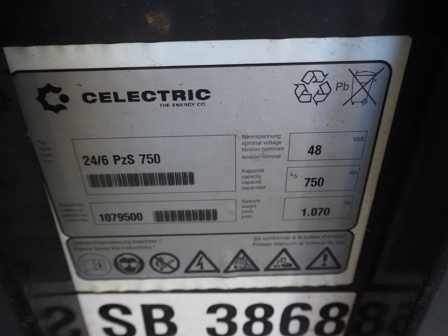 Toyota forklift, fabrication number: 8FBM20T-10423, capacity: 2000 kg, dimensions: 2100 mm x 1000 mm x 2100 mm. With Celectric accu, type: 24/6 PzS 750, 48 V, 750 Ah, weight: 1070 kg, dimensions: 750 mm x 900 mm x 1100 mm. Technical condition unknown. Without forks. Kavel locatie: Ertveldweg 31, 5231 XA Den Bosch, Nederland
