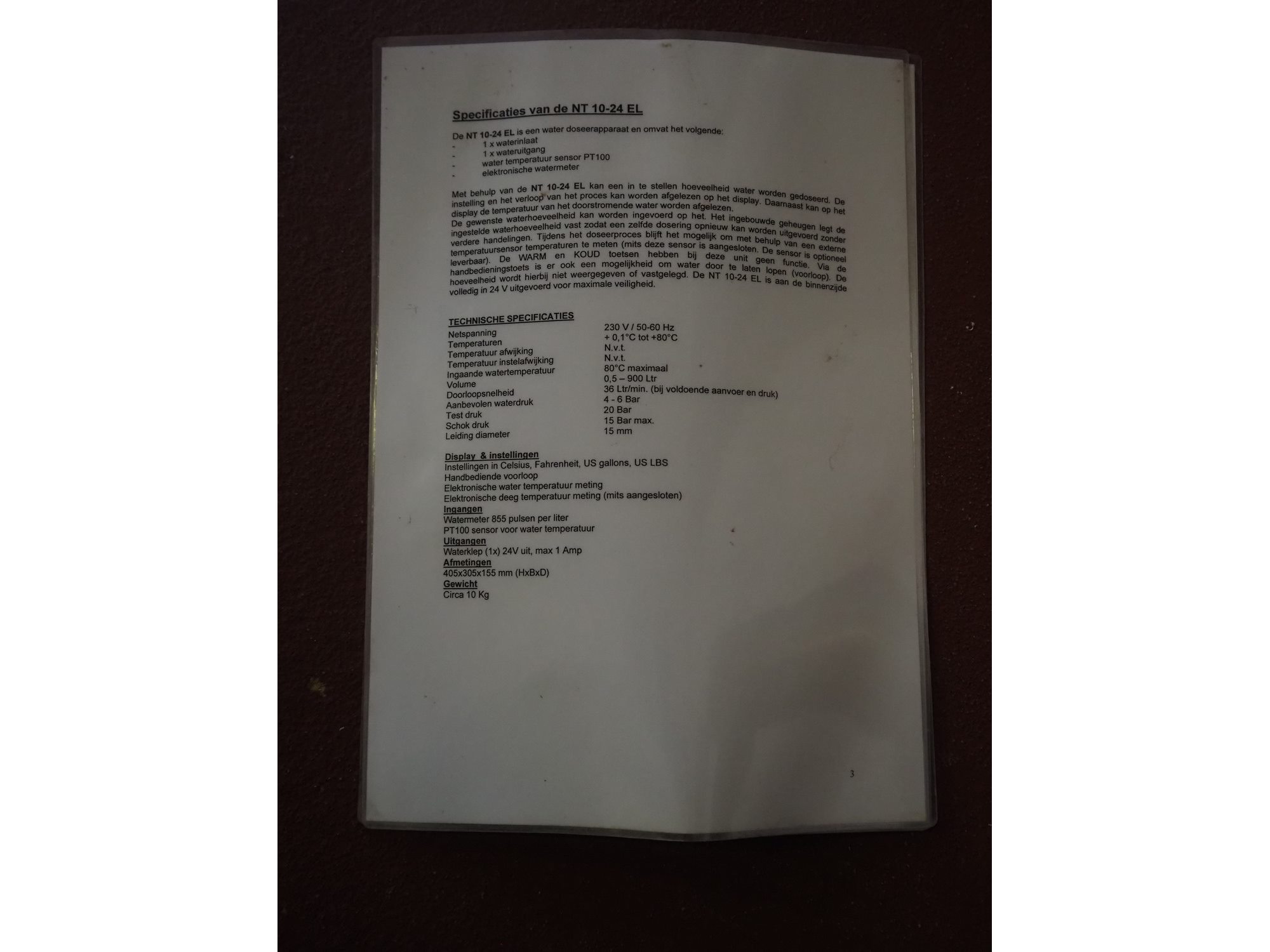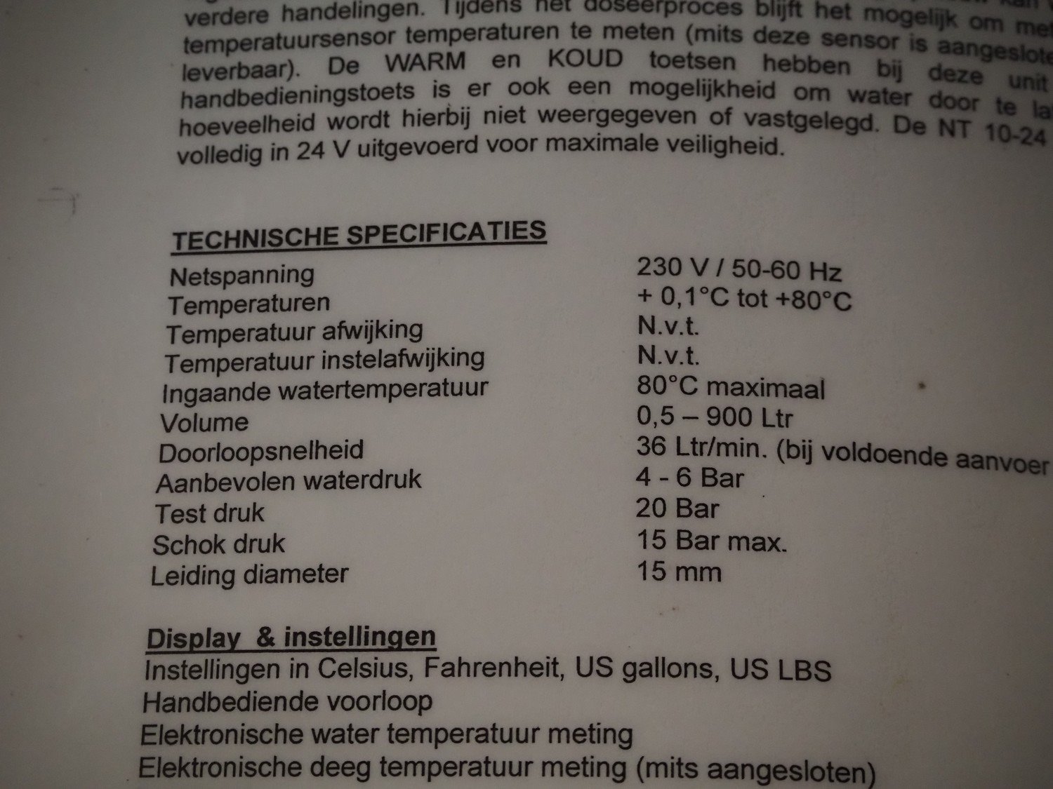 Kombimix water dosing machine, model: NT 10-24 EL, 230 V, 50/60 Hz, maximum inlet temperature water: 80˚C, volume: 0.5 - 900 liter, 36 liter per minute, dimensions: 300 mm x 150 mm x 400 mm. Kavel locatie: Bunsenstraat 79, 3316 GC Dordrecht, Nederland