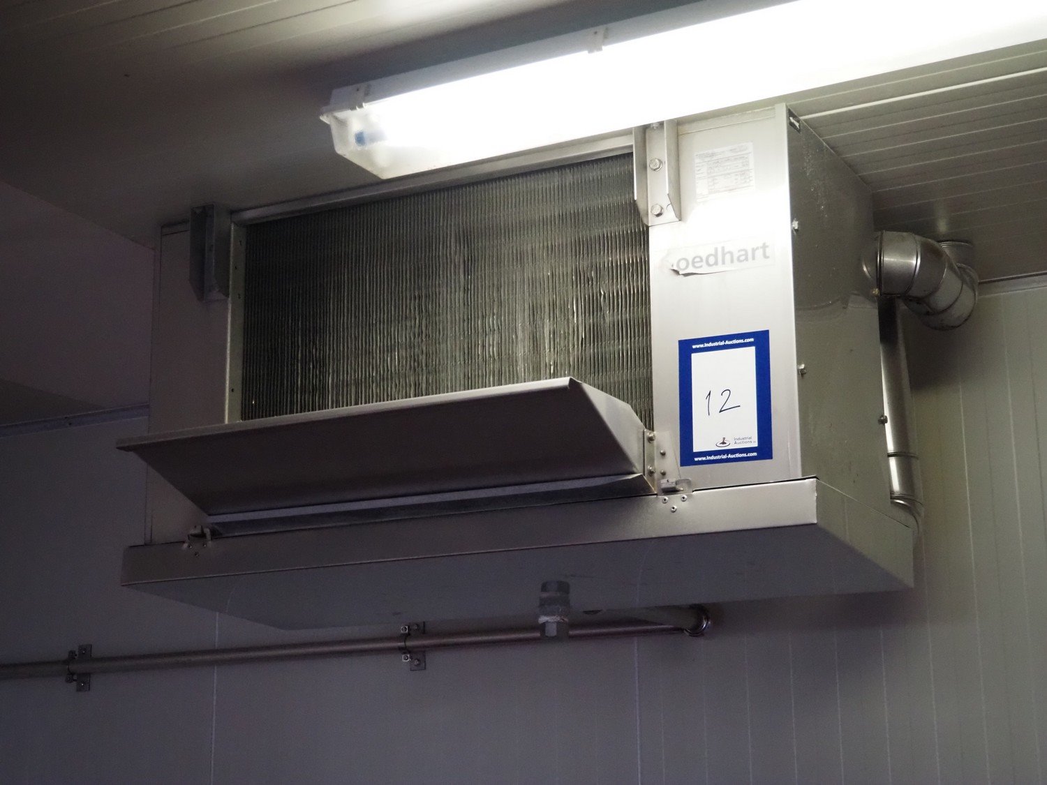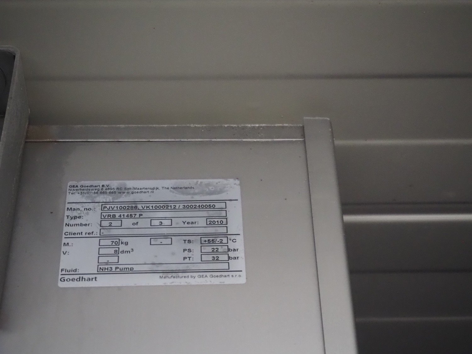 GEA Goedhart B.V. s/s evaporator, type: VRB 41457 P, manufacturing number: PJV100283, VK1000212 / 300240050, year of construction: 2010, volume: 8 dm³, PS: 22 bar, PT: 32 bar, fluid: NH3 pump, weight: 70 kg, 1 fan, dimensions: 1300 mm x 600 mm x 700 mm. Kavel locatie: Bunsenstraat 79, 3316 GC Dordrecht, Nederland