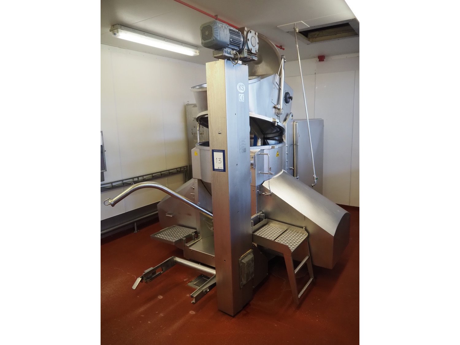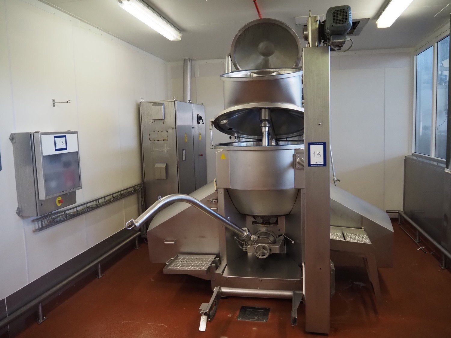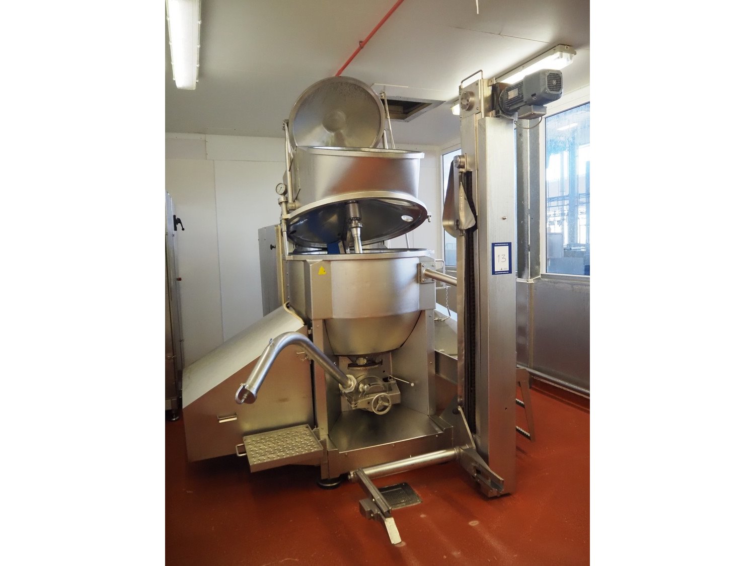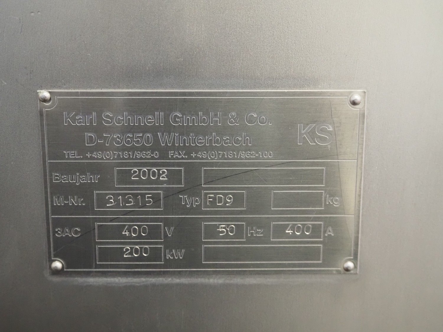 Karl Schnell emulsifier with lifter for 200 liter meat bins, type: FD9, machine number: 31315, year of construction: 2002, 400 V, 50 Hz, 400 A, 200 kW, dimensions emulsifier: 4100 mm x 2800 mm x 2700 mm, switch cabinet, dimensions: 1700 mm x 600 mm x 2300 mm, control panel, dimensions: 600 mm x 300 mm x 700 mm, including 2 rollies and trolley with large amount of plates and knifes, dimensions trolley: 1100 mm x 600 mm x 1000 mm, including pallet with various parts. Kavel locatie: Bunsenstraat 79, 3316 GC Dordrecht, Nederland
