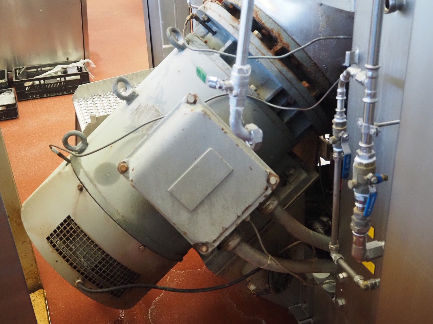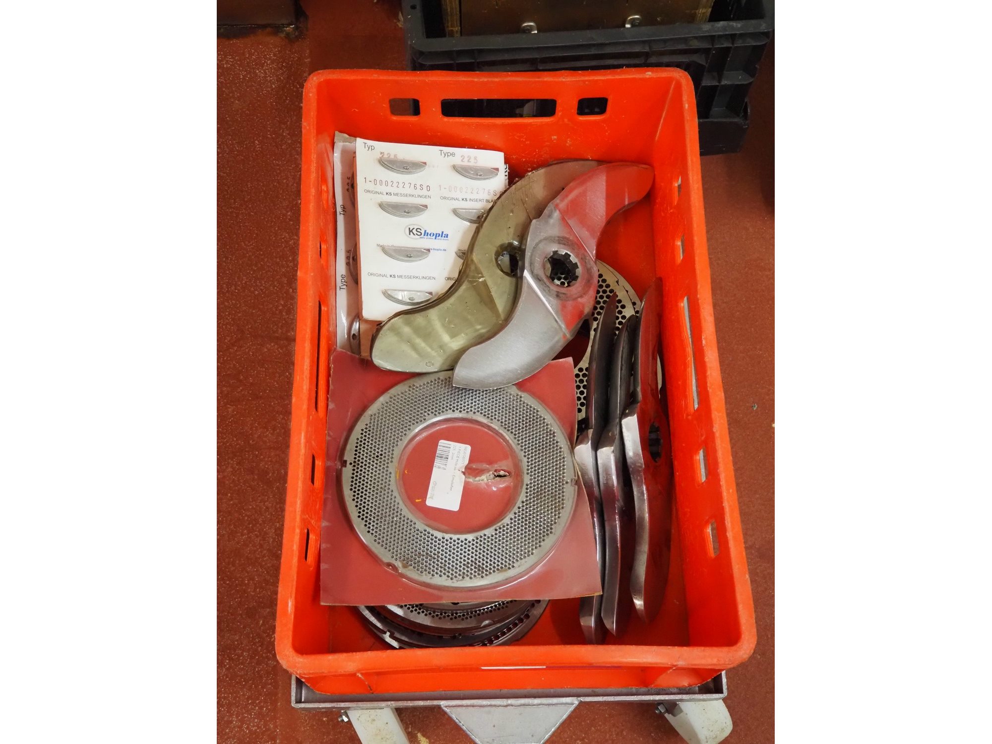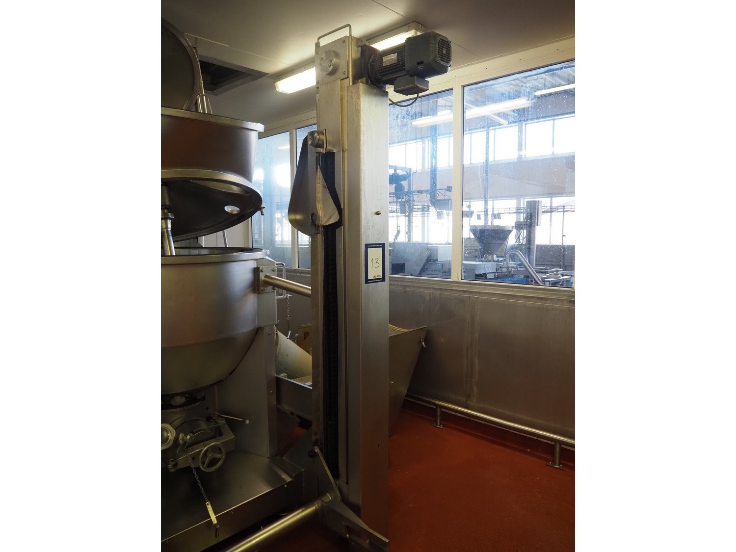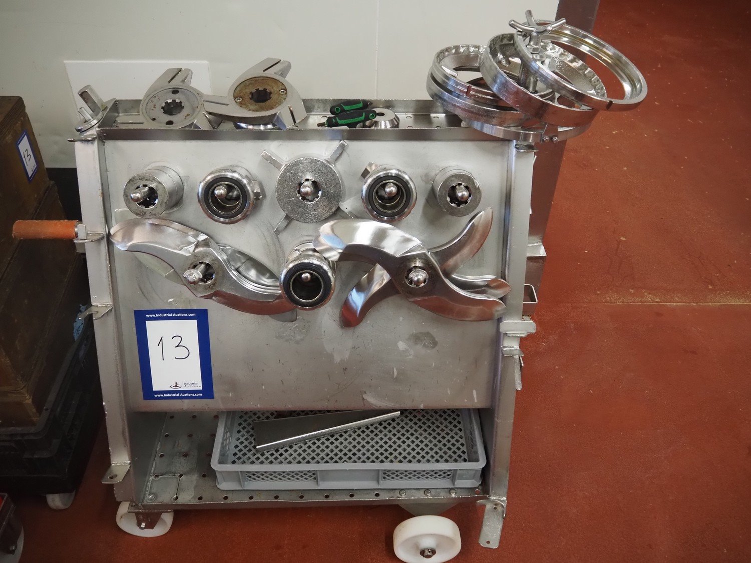 Karl Schnell emulsifier with lifter for 200 liter meat bins, type: FD9, machine number: 31315, year of construction: 2002, 400 V, 50 Hz, 400 A, 200 kW, dimensions emulsifier: 4100 mm x 2800 mm x 2700 mm, switch cabinet, dimensions: 1700 mm x 600 mm x 2300 mm, control panel, dimensions: 600 mm x 300 mm x 700 mm, including 2 rollies and trolley with large amount of plates and knifes, dimensions trolley: 1100 mm x 600 mm x 1000 mm, including pallet with various parts. Kavel locatie: Bunsenstraat 79, 3316 GC Dordrecht, Nederland