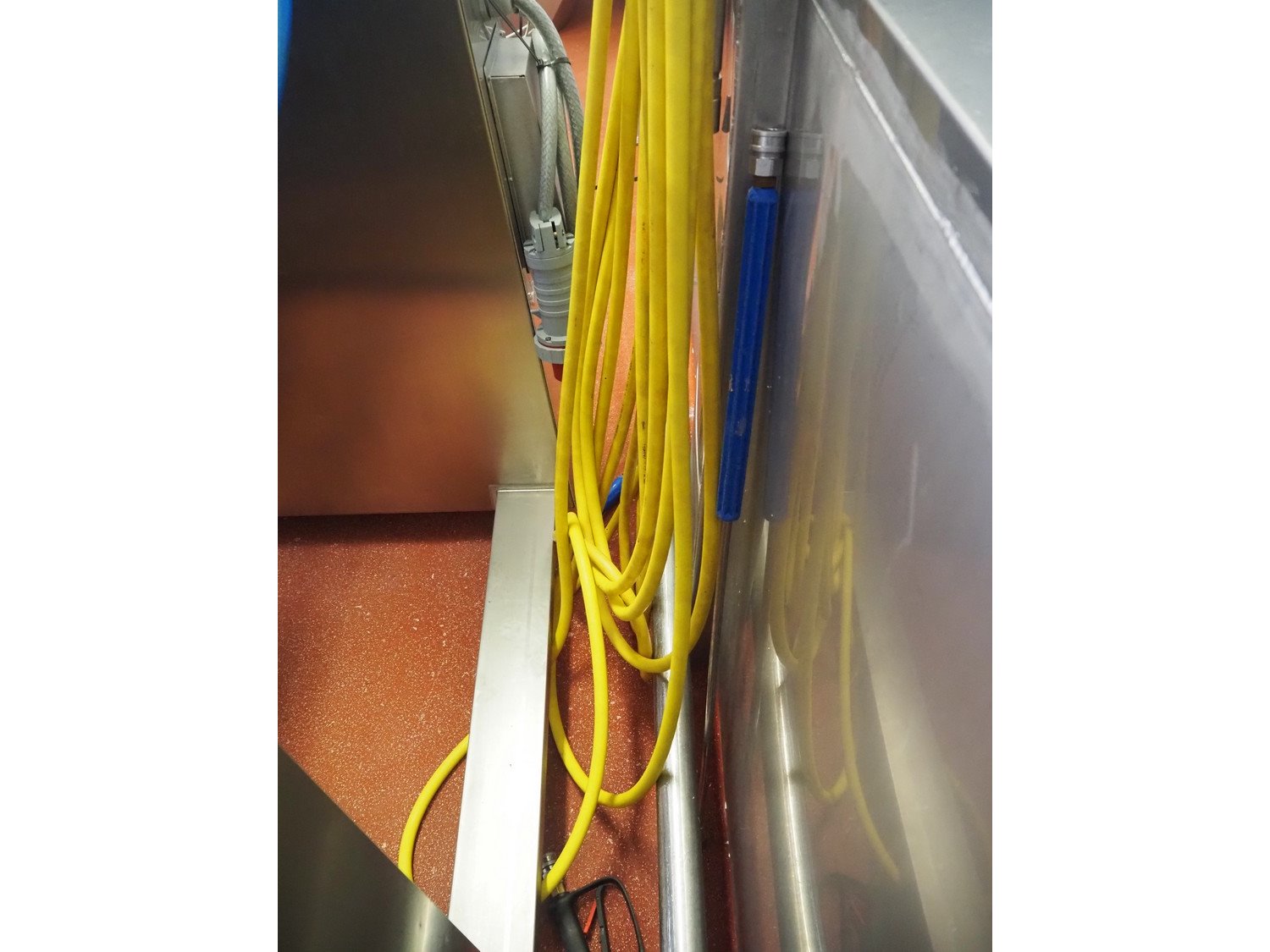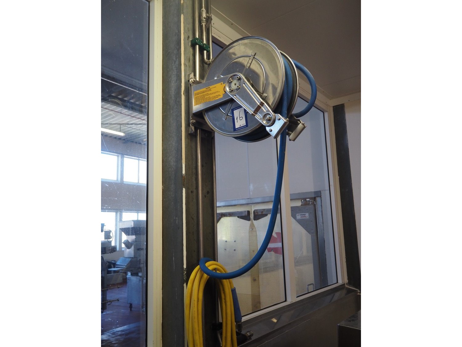 S/s hose reel with hose and pistol, dimensions: 500 mm x 500 mm x 250 mm and extra plastic hose with pistol. Kavel locatie: Bunsenstraat 79, 3316 GC Dordrecht, Nederland