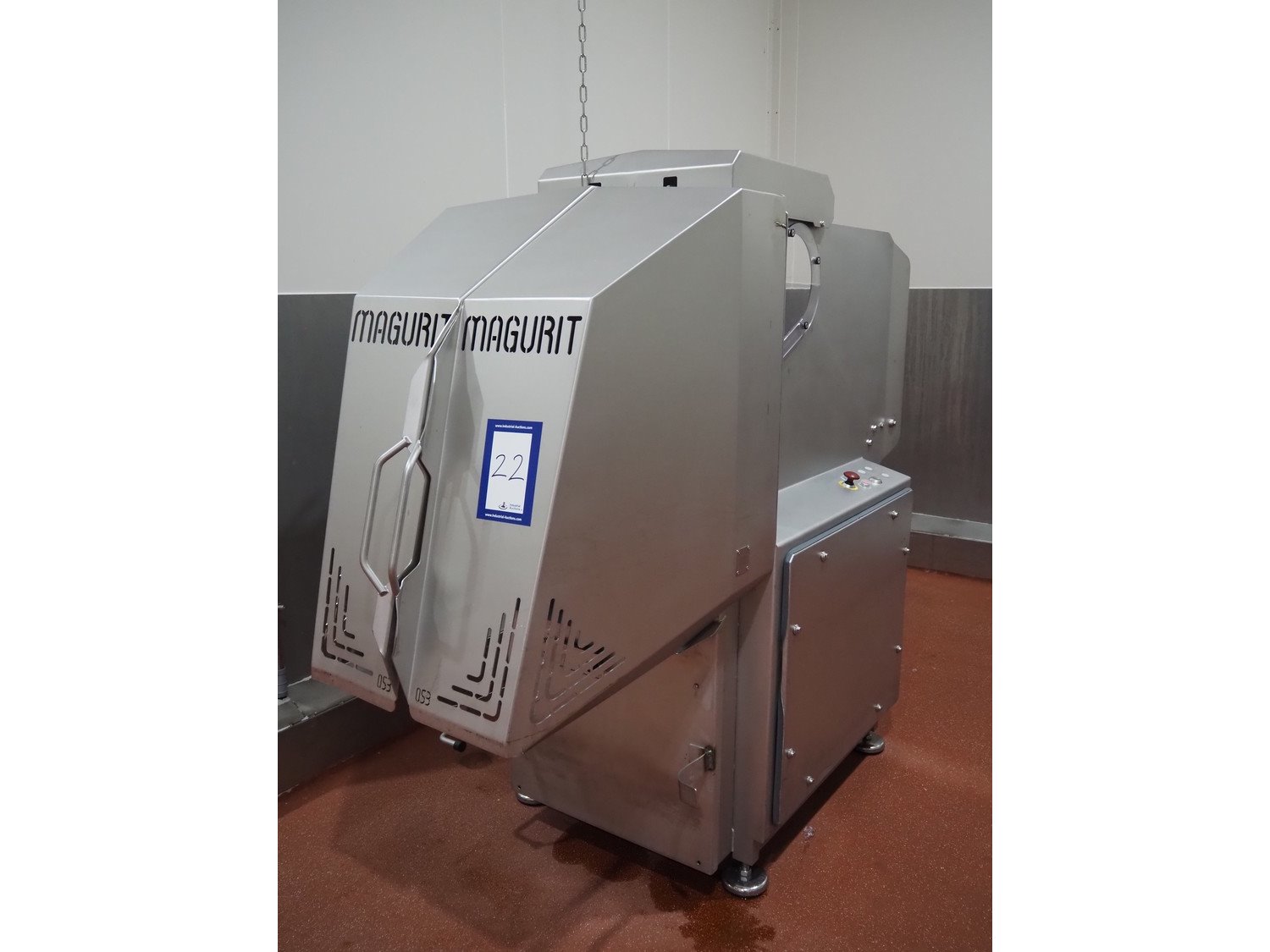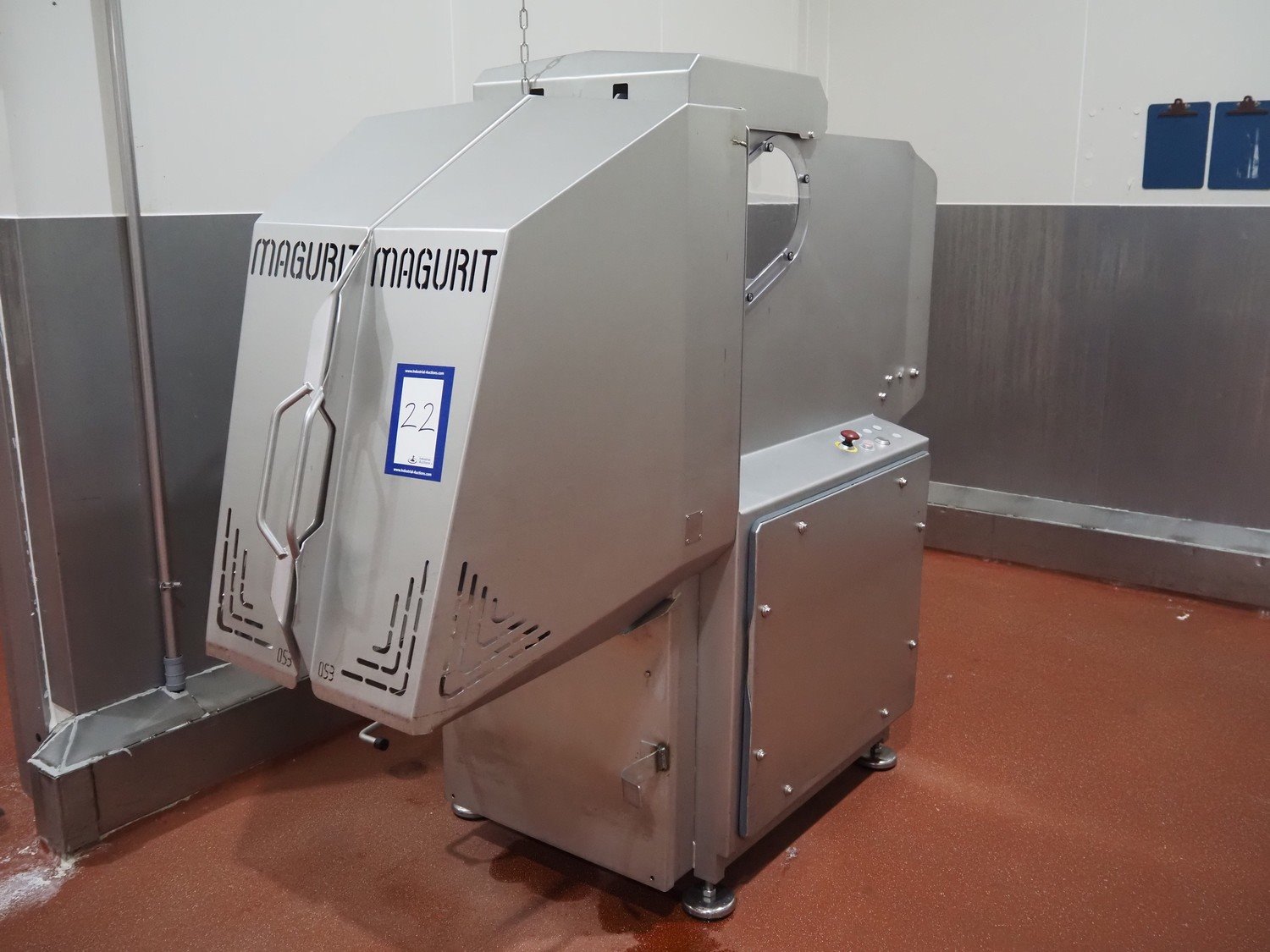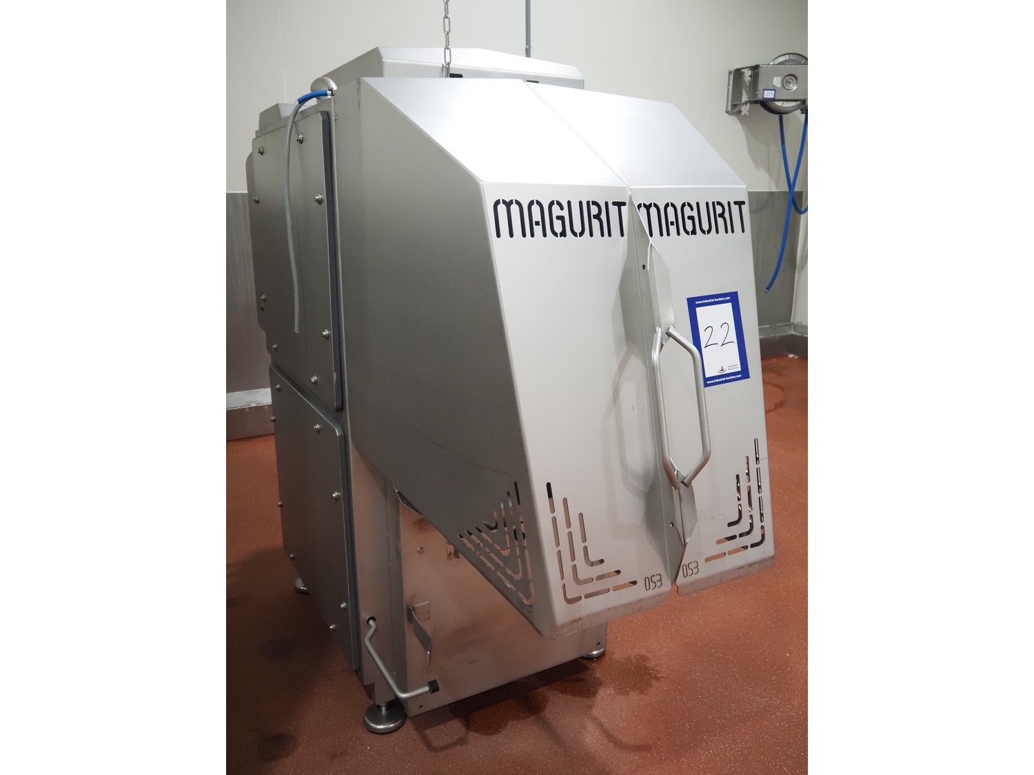 Magurit frozen block cutter, type: 053, machine number: 6159, year of construction: 2011, 400 V, 50 Hz, 13 A, 5.5 kW, weight: 660 kg, air pressure: 6 bar, working width: 500 mm, distance between knives: 50 mm, total dimensions: 2200 mm x 950 mm x 900 mm. Kavel locatie: Bunsenstraat 79, 3316 GC Dordrecht, Nederland